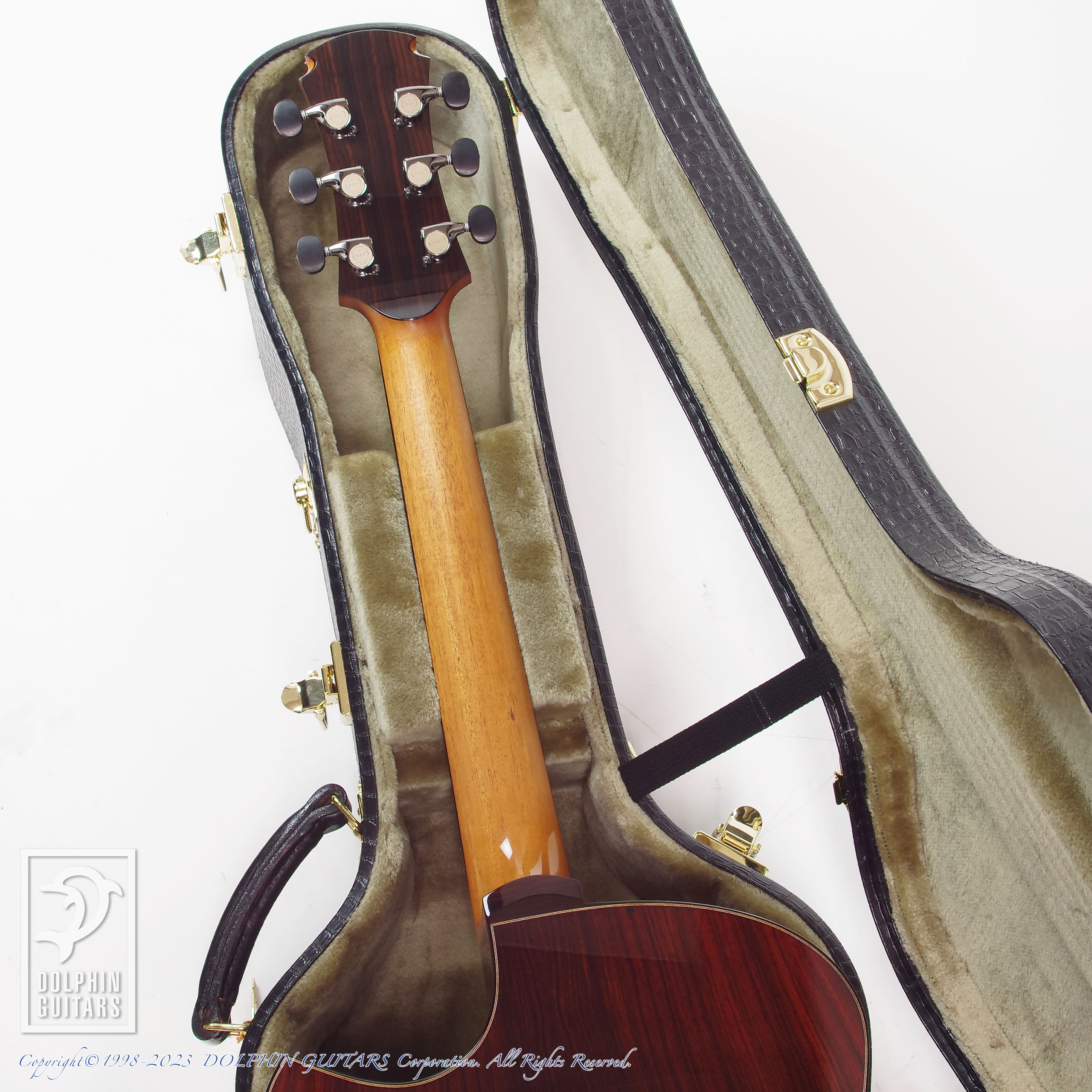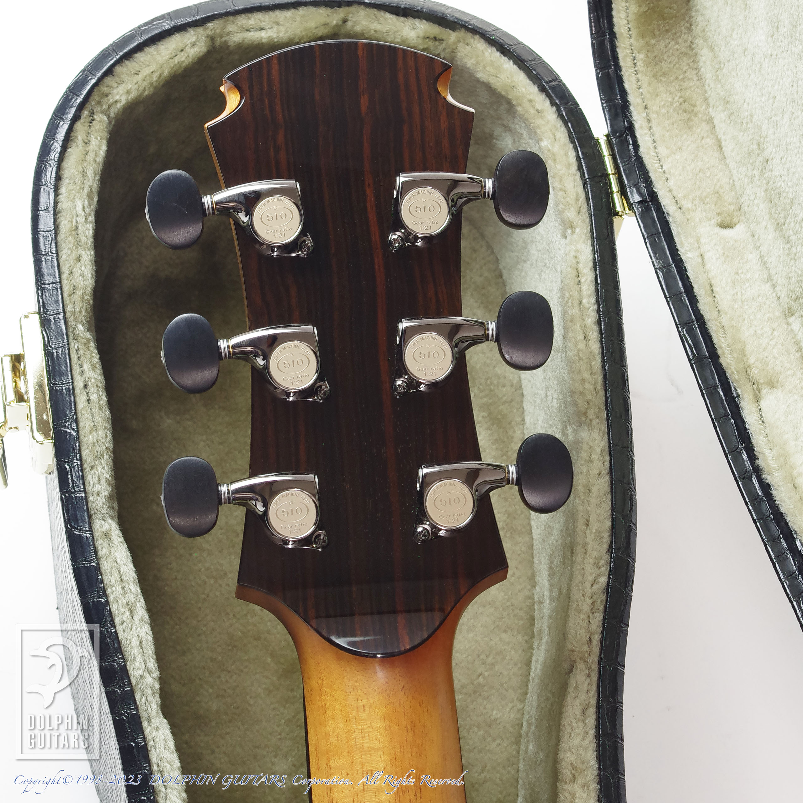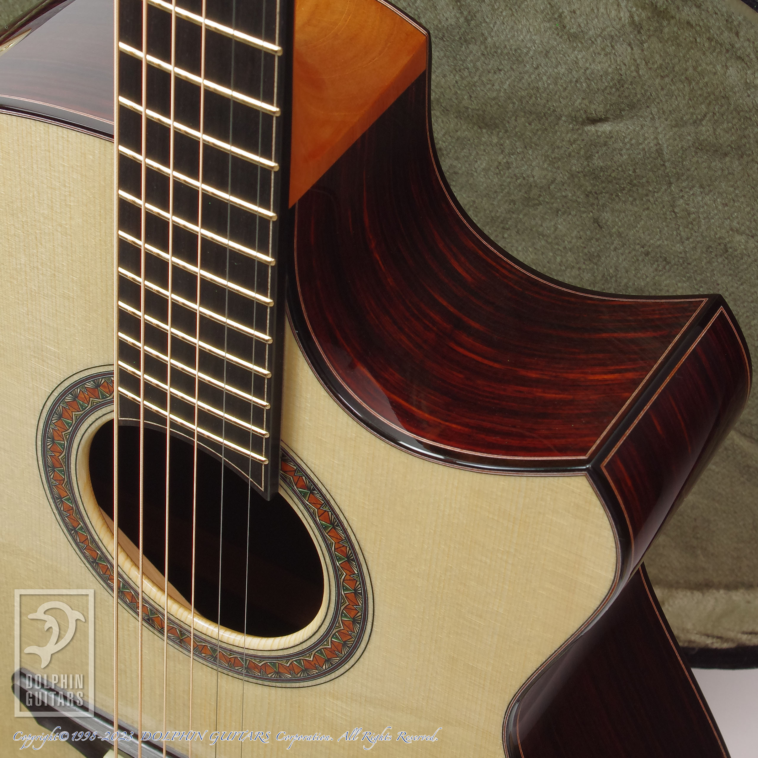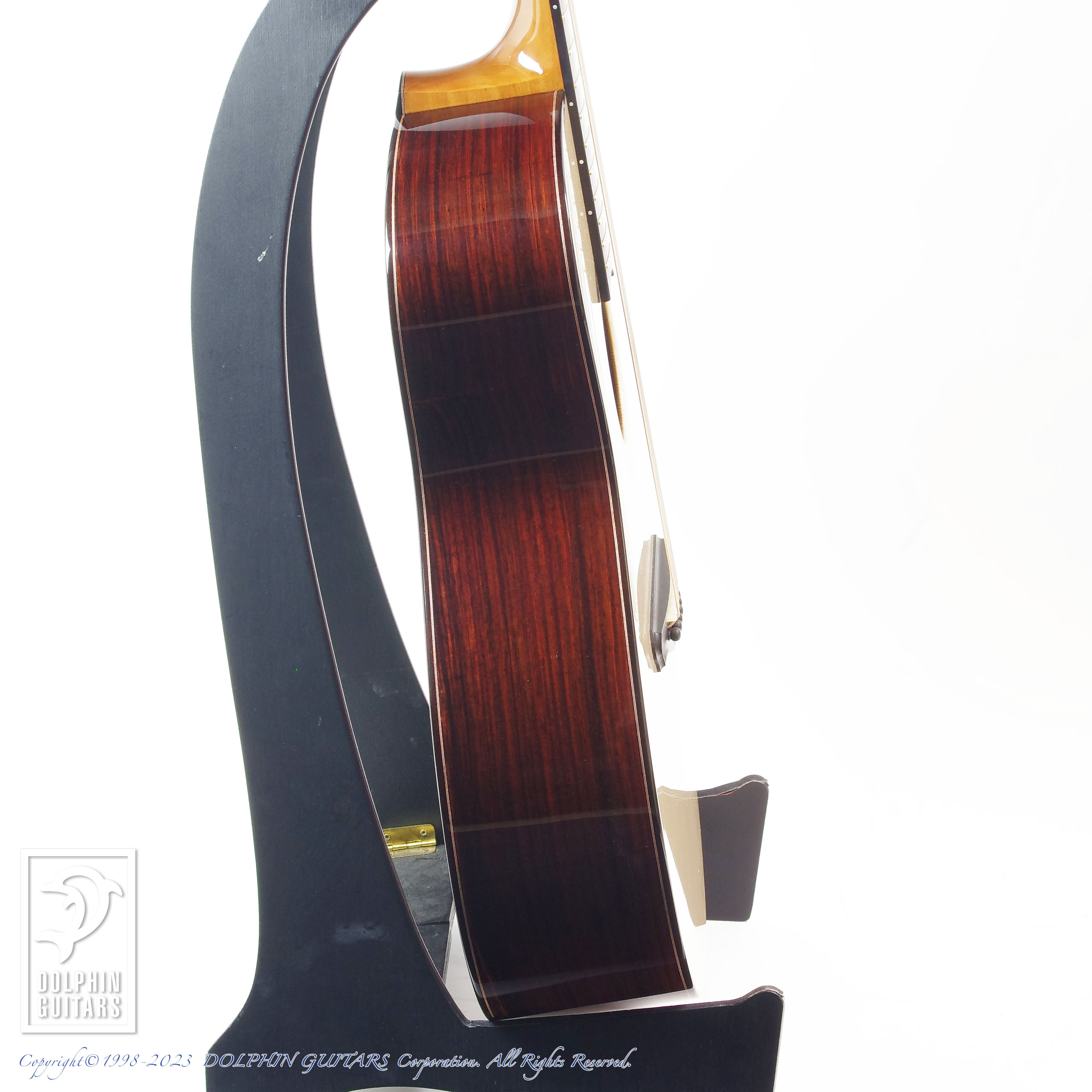 現在では入手困難であるマスターグレードのココボロ材を使用し、トップ材もキメ細かく色白のジャーマンスプルースを使用したボディ材の組み合わせ。高い木工精度にフィニッシュの美しさと相まって、木材が放つ高級感も最大限に高められた作りであります。ロゼッタは数種類の木材を貼り合わせ、カットしたパーツを組み込んだオリジナルパターンのモザイクロゼッタであります。