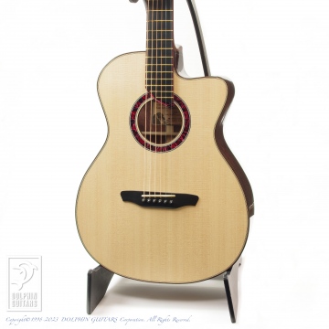 このサイズにして規格外のボリューム感と表現力の豊かさを持ち、サウンドのみを聴くとスモールサイズの比ではありません、初めて弾かれる方はきっと驚かれるでしょう。材が持つ音響特性も余すことなく表現され、ローミッドの厚みや上質なトーンを奏でる逸品です。サイドサウンドポートの効果も大きく、弾き手自身へのモニターともなり、メインのサウンドホールとのステレオ感も味わえます。