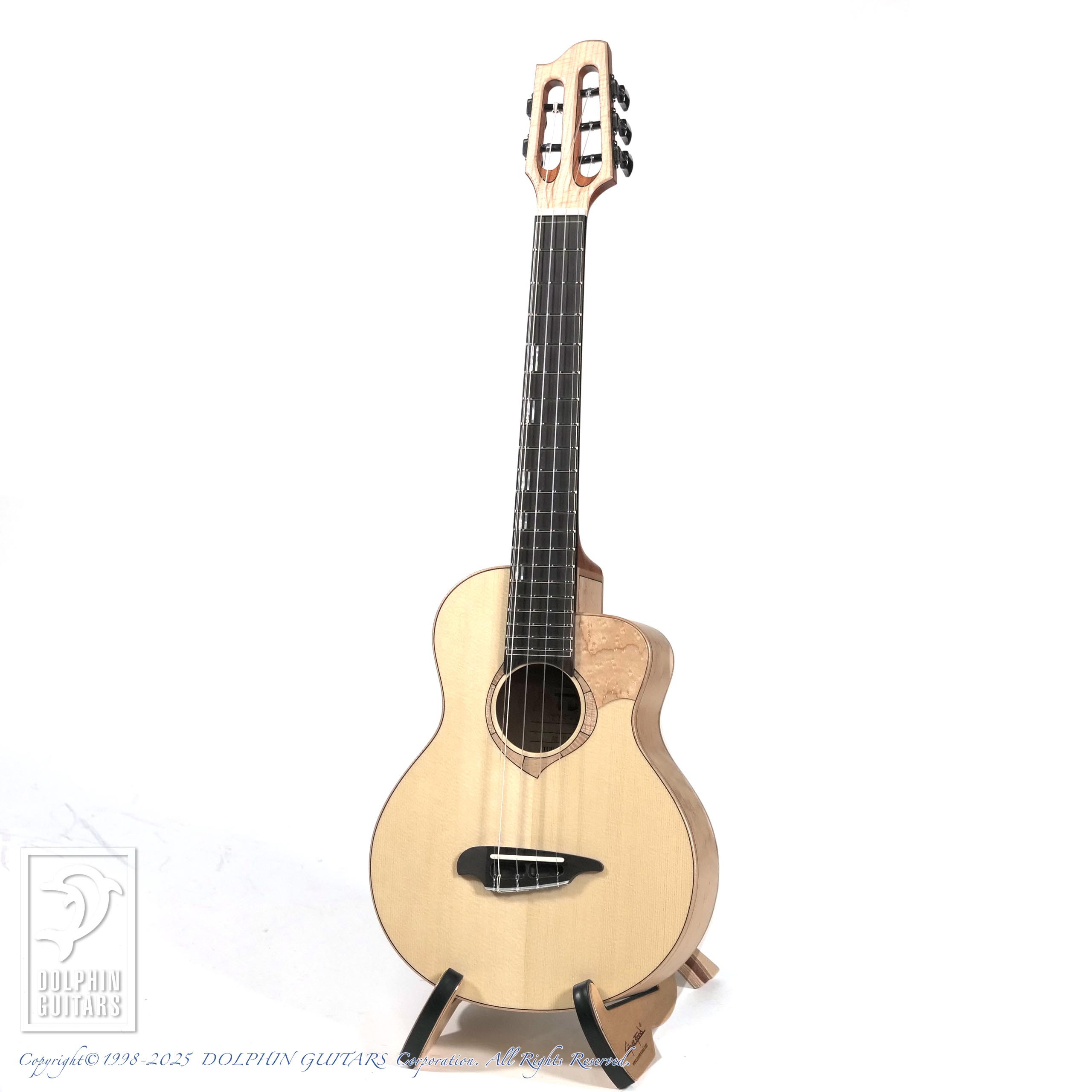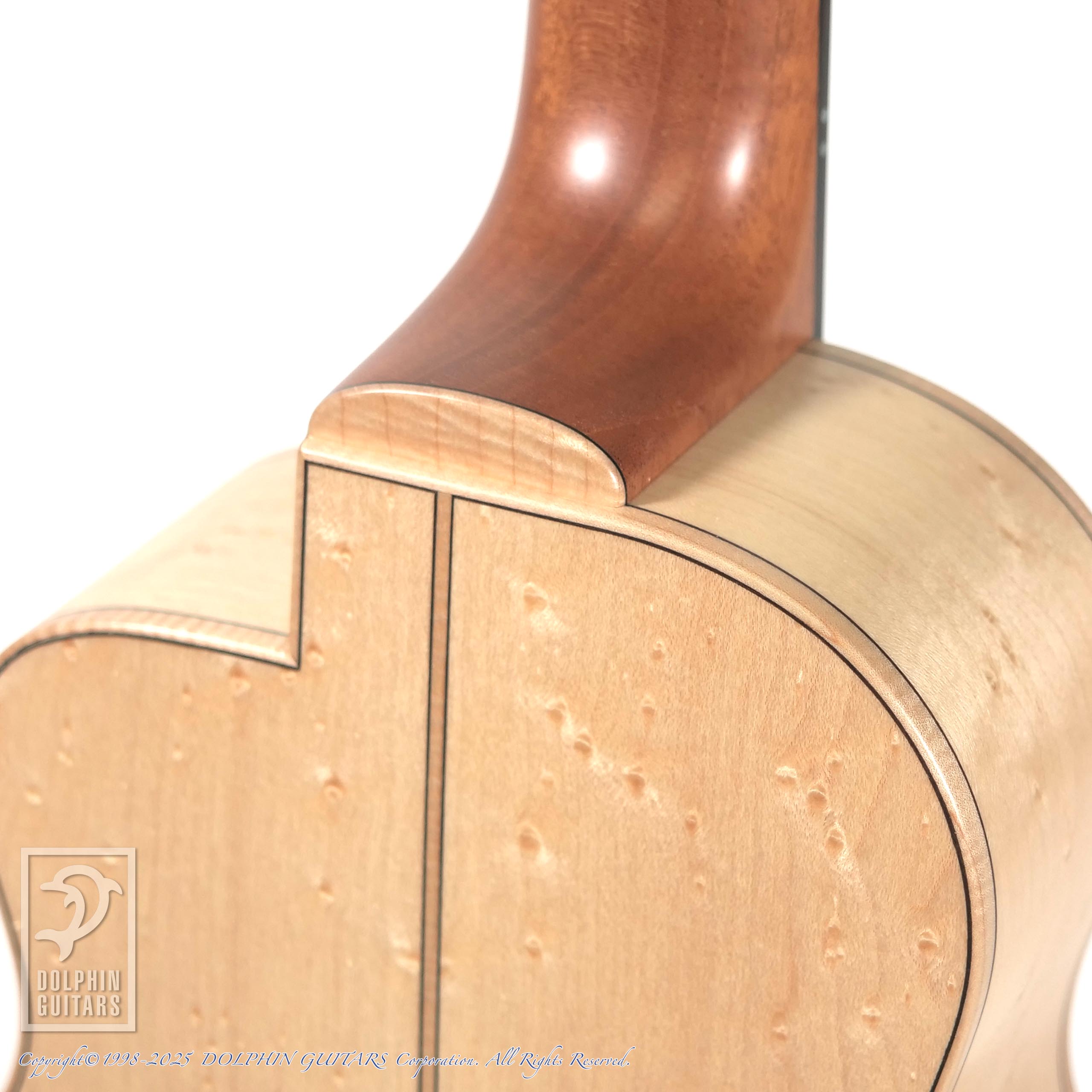 サイド&バックにバーズアイメイプル、トップはイングルマンスプルースという組み合わせで白さを演出、またピックガードやバインディング、ヘッドストックもメイプルとなっており、ブライトで美しいビジュアルとなっております。バインディングのメイプルは稀に見る細かいフレイム杢で、木目フェチにはたまらないでしょう。