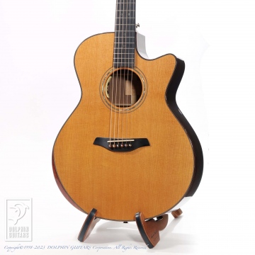 標準仕様はナット幅45mm仕様でありますが、本器はカスタムオプションの43.5mmナット幅 スリムネック仕様。ボディサイズは一般的なOMであり、ラウンドシェイプのベネチアンカッタウェイを採用。塗装面はボディがグロス仕上げに、ネックはサテン仕上げとなっており、ネックを握った感触も好評のフォルヒです。ピックガードは透明のガードが標準仕様となっており、一見 貼られていることに気づかないほど美しい仕上がりです。