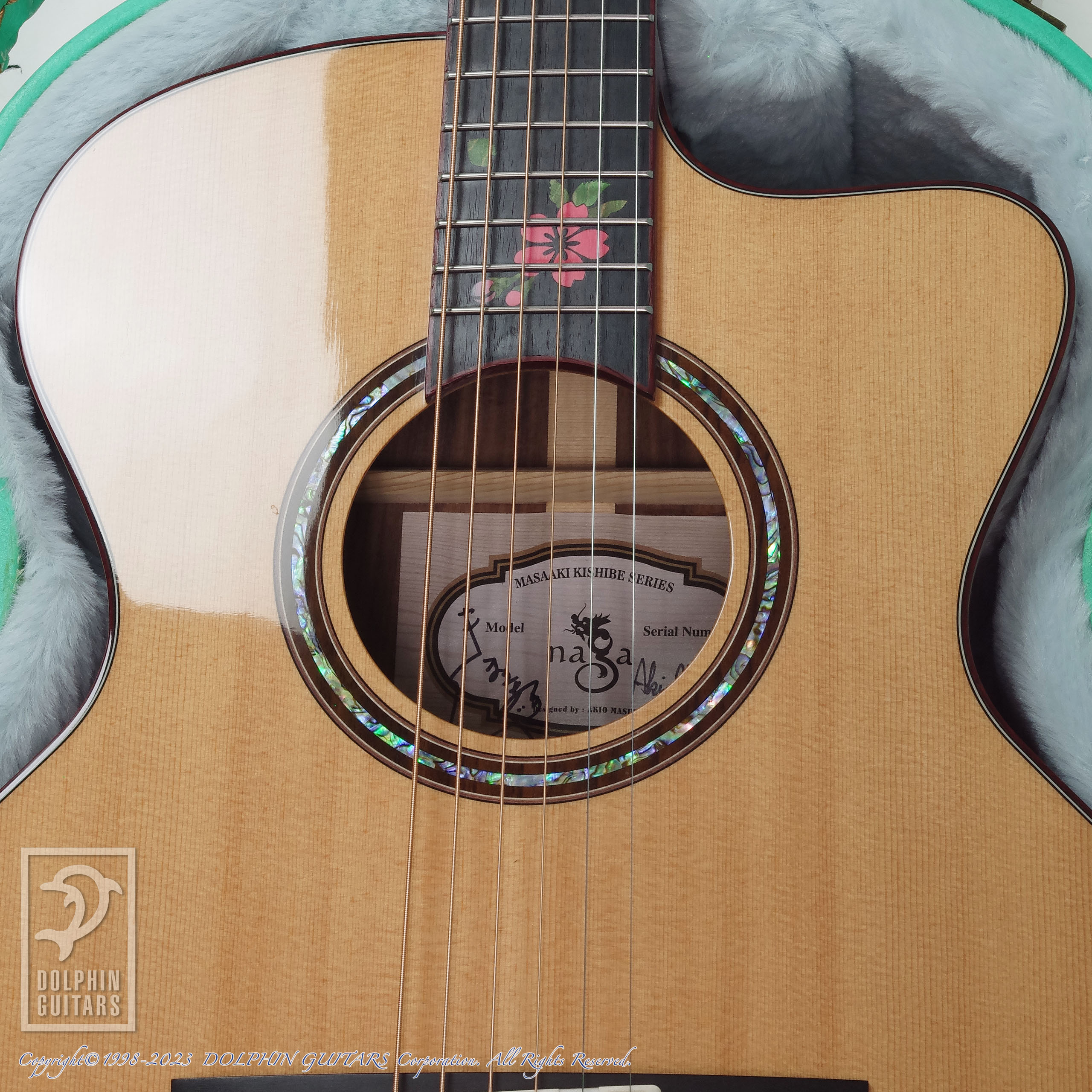 ボディサイズはスモールジャンボ(SJ)、くびれが大きくやや厚胴のボディとなっております。岸部眞明シグネイチャーモデルということで、代表曲の"花"をモチーフに指板インレイが施されているのも特長です。