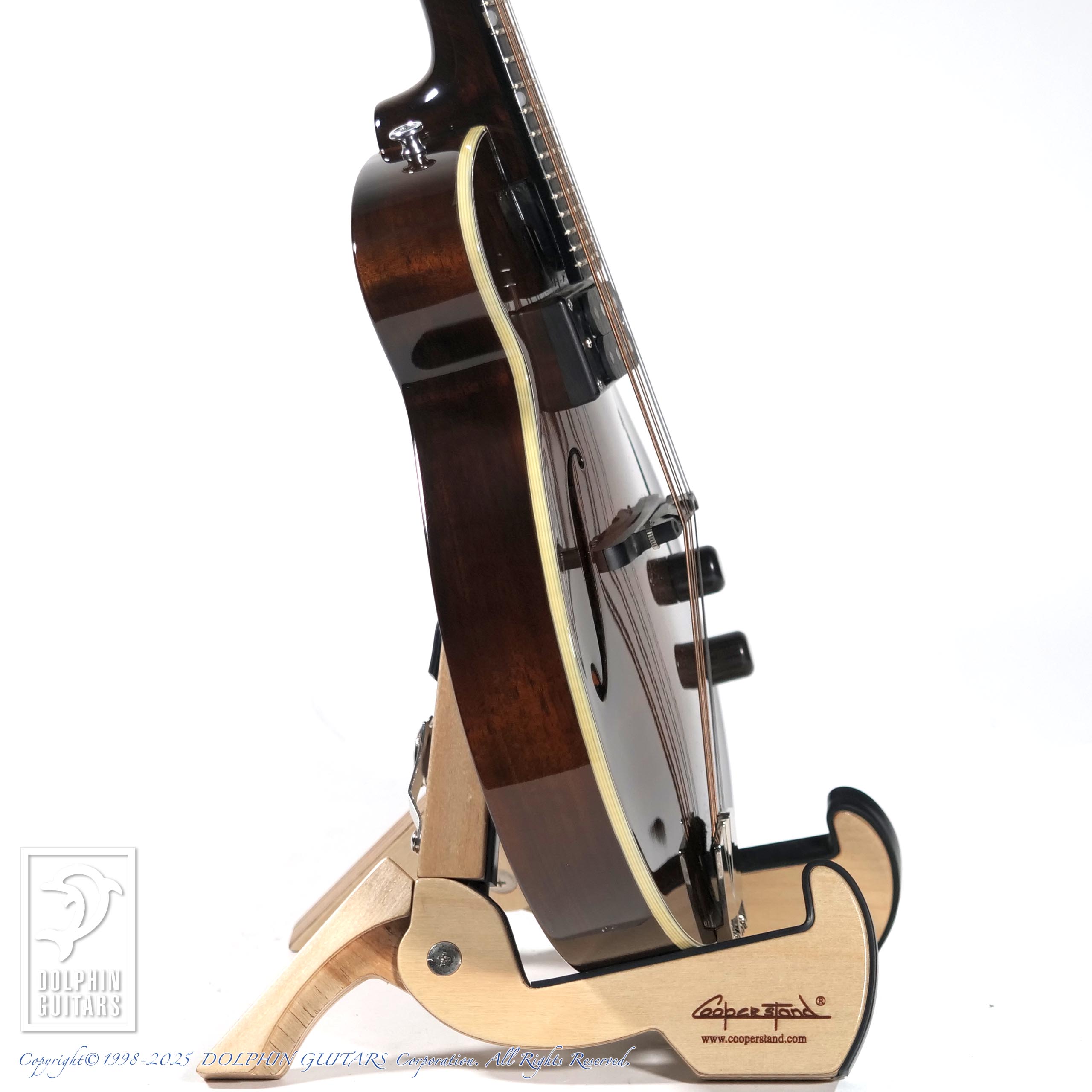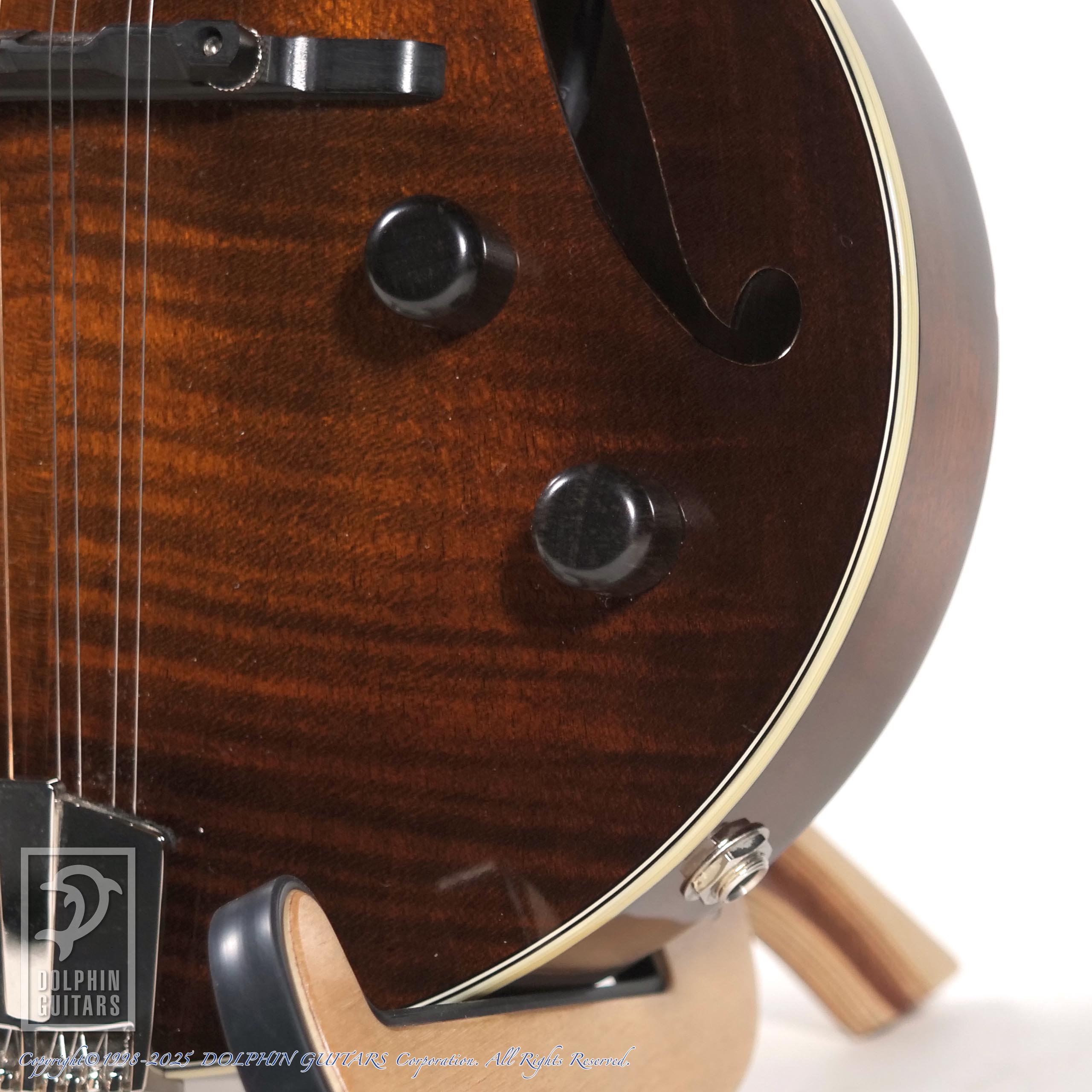 ルシアーのOtto D'Ambrosio(オットー・ダンブロシオ)設計による斬新なデザインを持つEL RAYシリーズレアなエレクトリックマンドリンとなっており、ギブソン系のオーソドックスなモデルとは一線を画します。ウッドエスカッションにウッドノブ、スタイリッシュなフィンガーボードインレイなどが、小さなアーチトップギターのような雰囲気を醸し出しております。