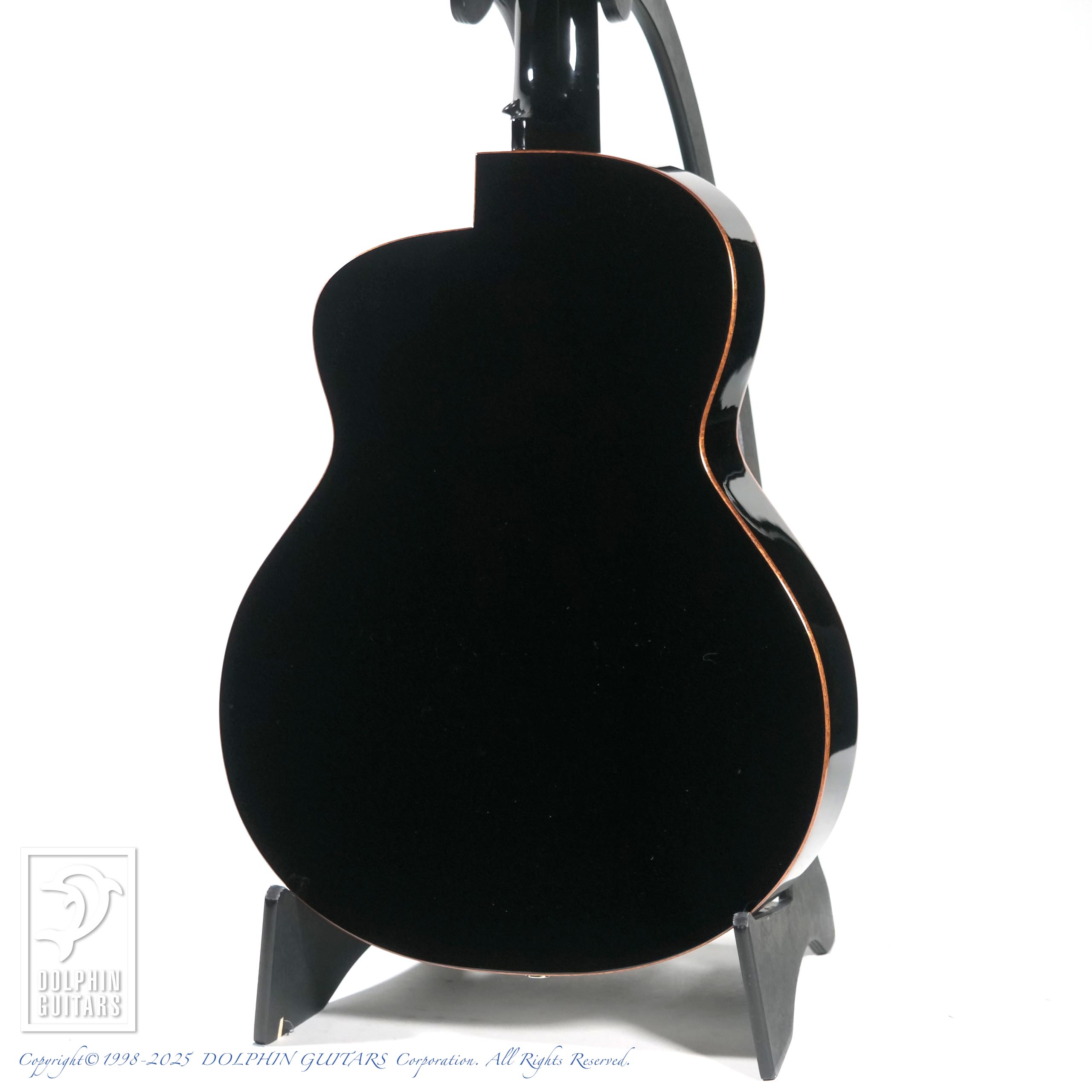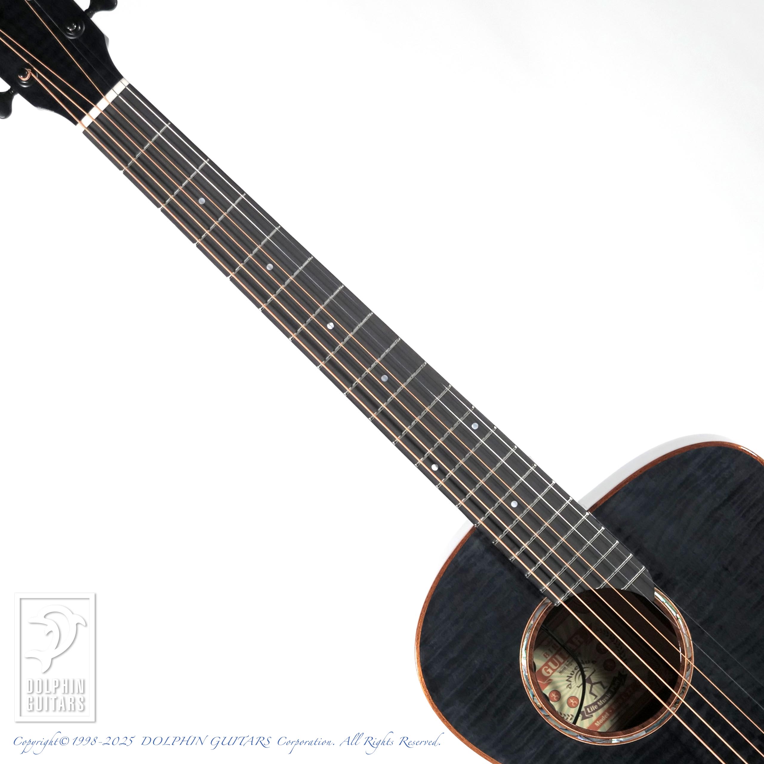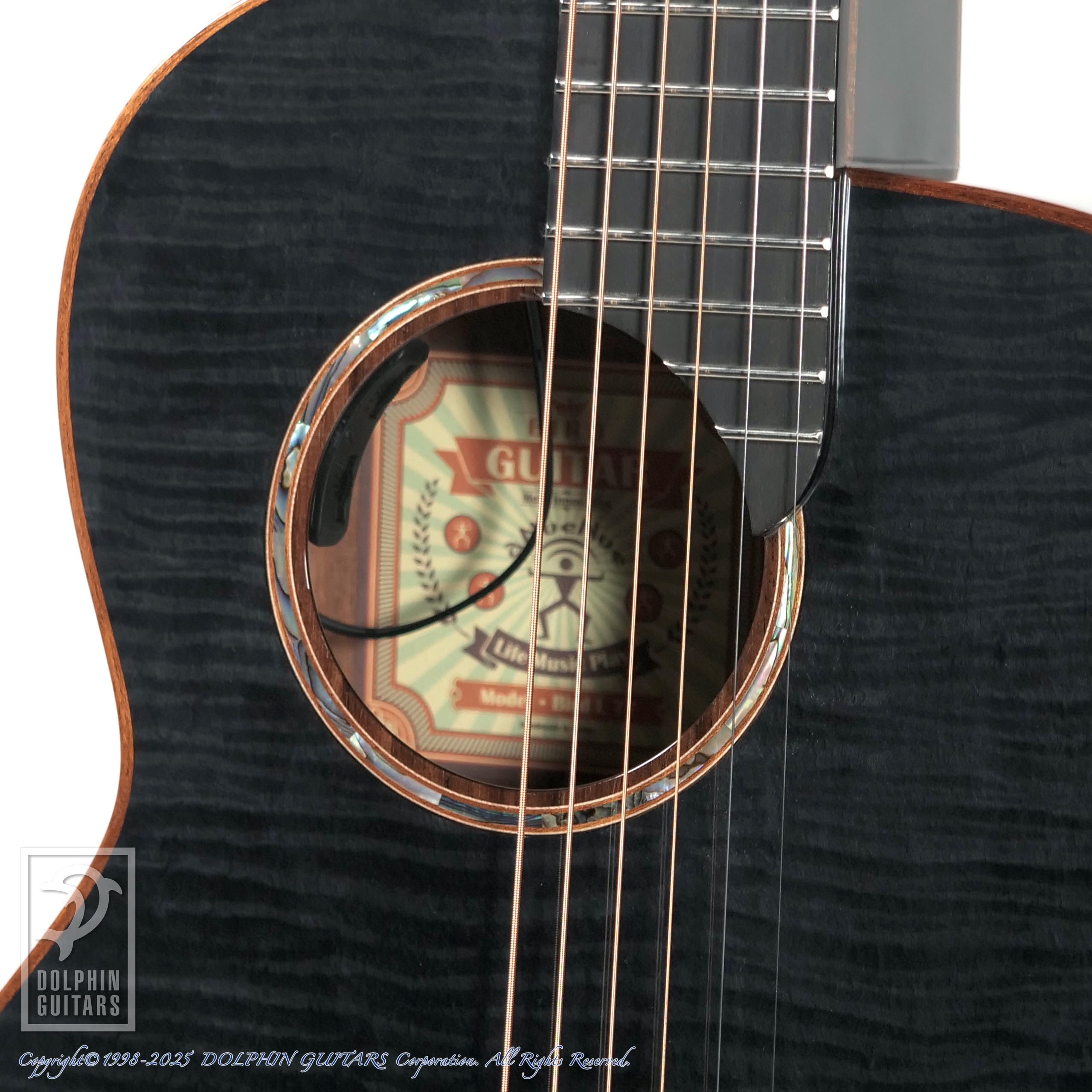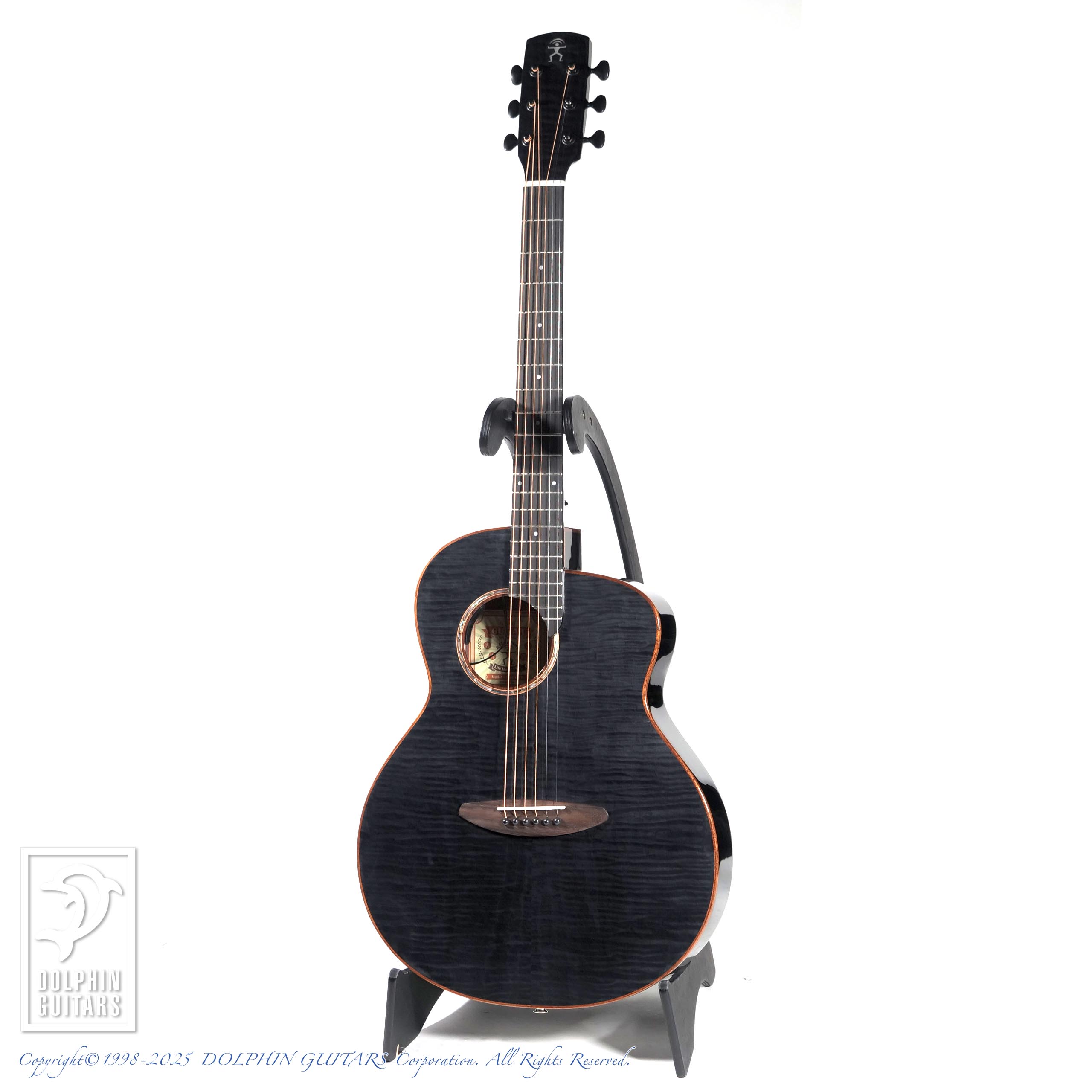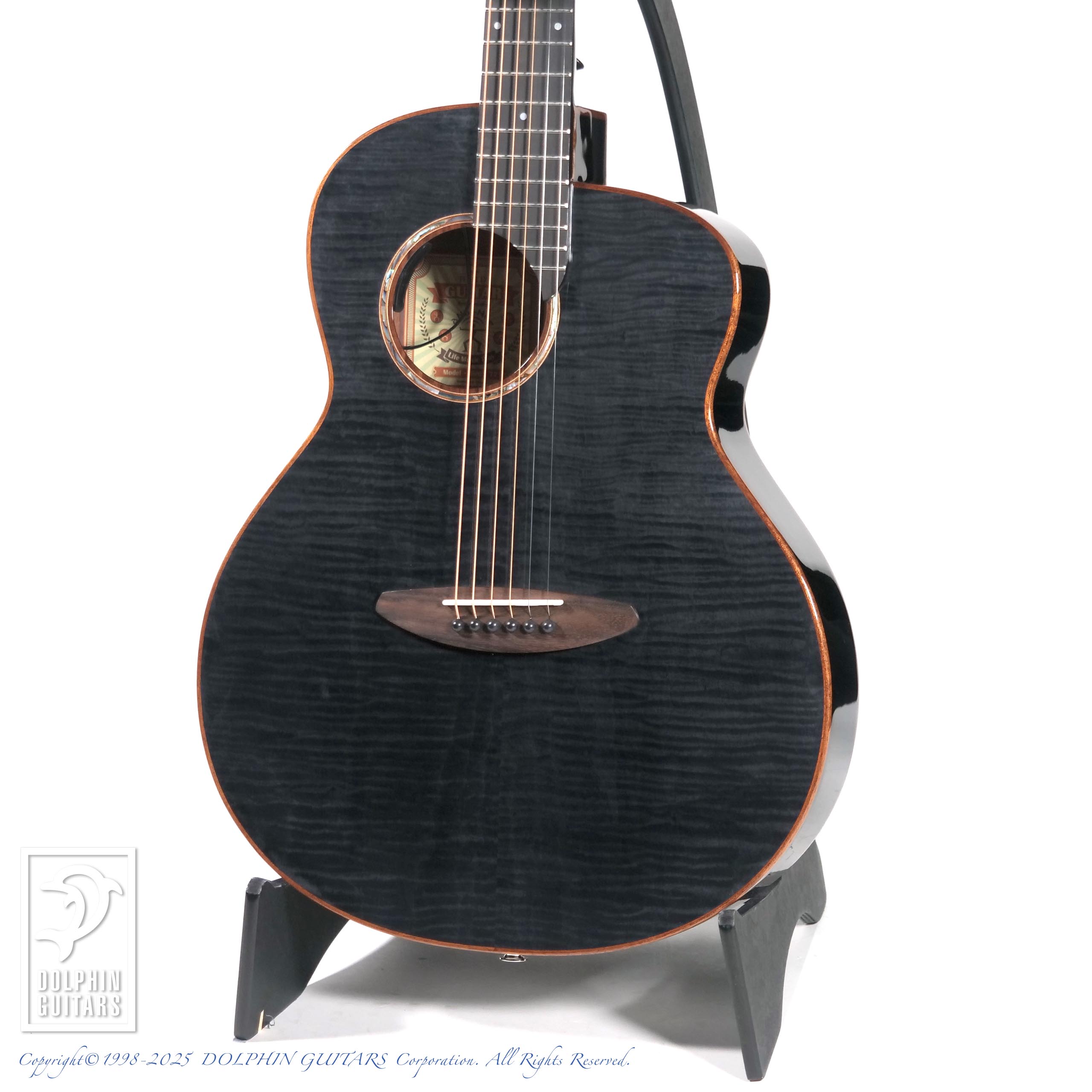 カーリーメイプルをセダー材の表面に配した美しいギター。シースルーブラック塗装により、杢目が浮かび上がるような幻想的な印象を与えます。サイド&バックはほのかにラメが輝く凝った仕様です。