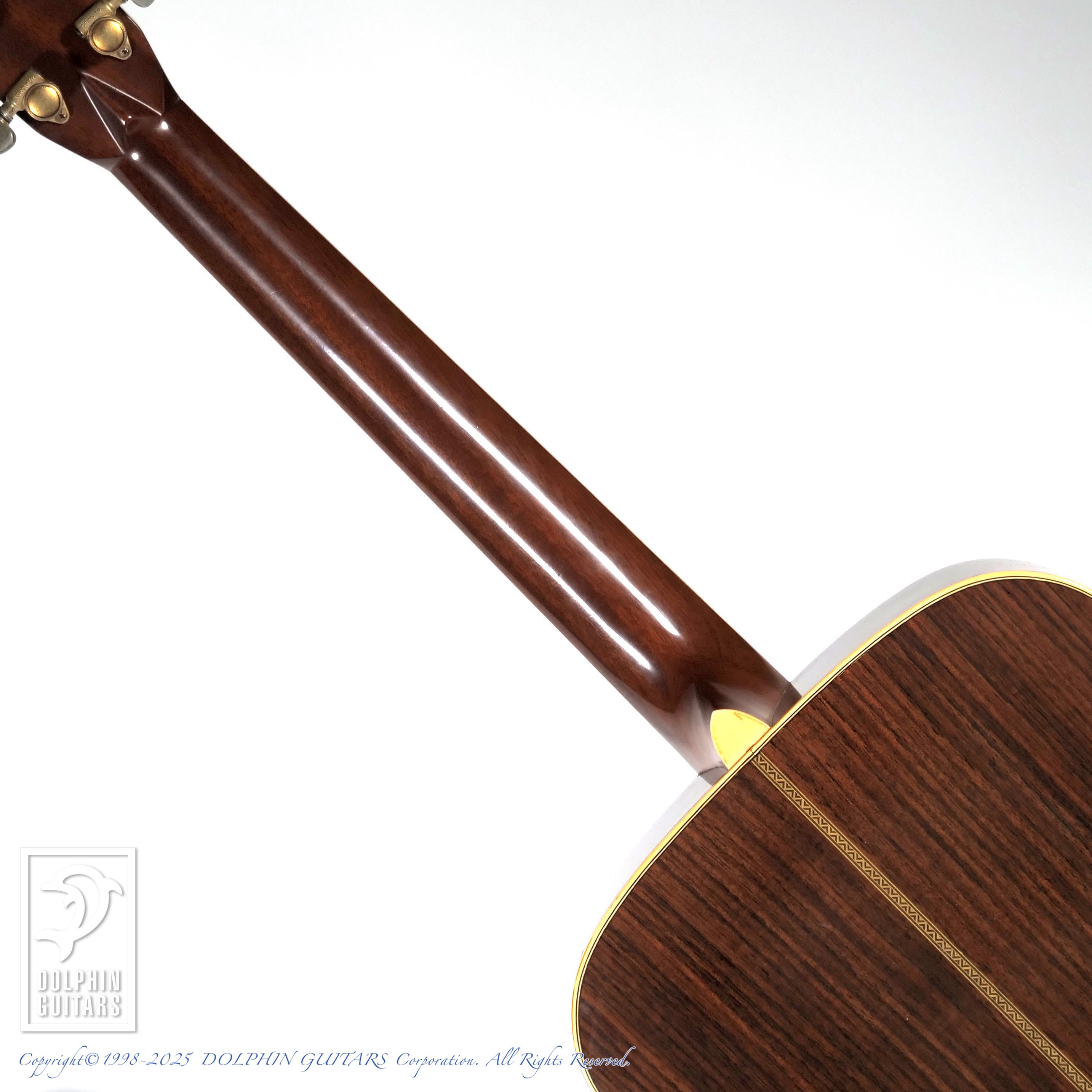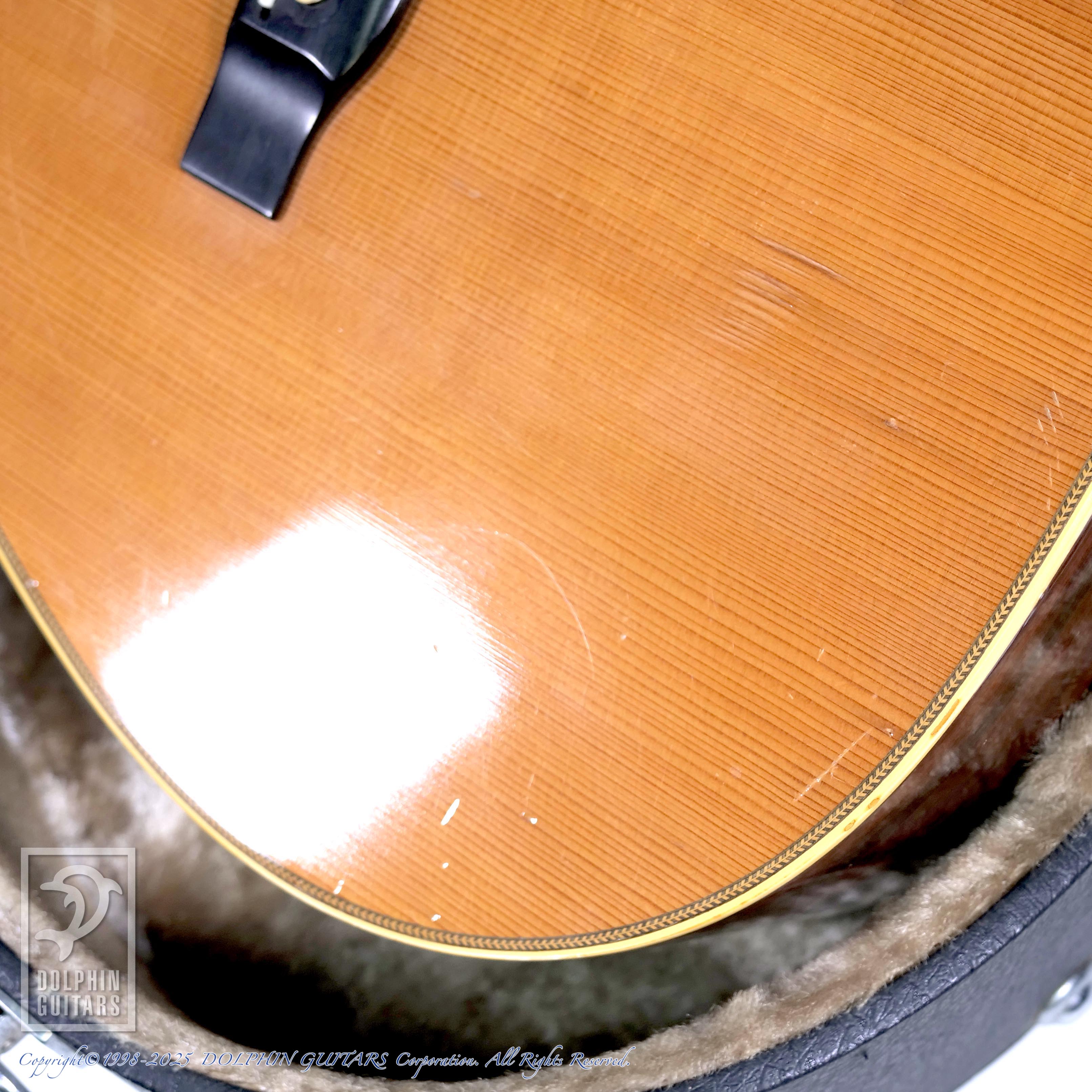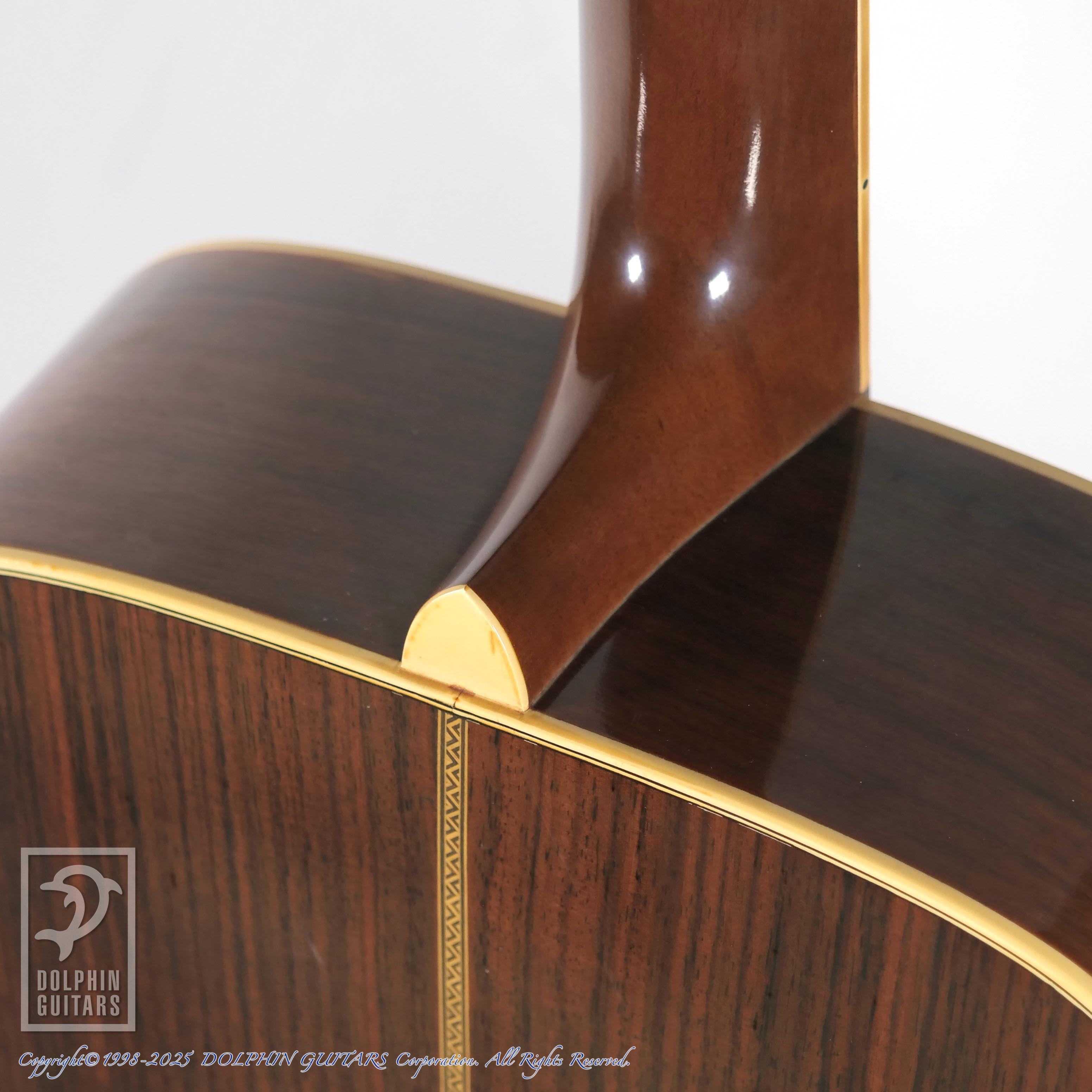 上位機種のこちらはジャーマンスプルーストップを採用するという通な仕様です。指板やヘッドもバインディングで囲われた豪華仕様です。カタログにサイド単板の表記がないため単板と記載できませんが、丁寧な割れ止めテープや表裏の木目のマッチングからすると、単板と言いたくなる構造で、何よりその抜けの良い豪快な響きがそれを裏付けているとも言えます。