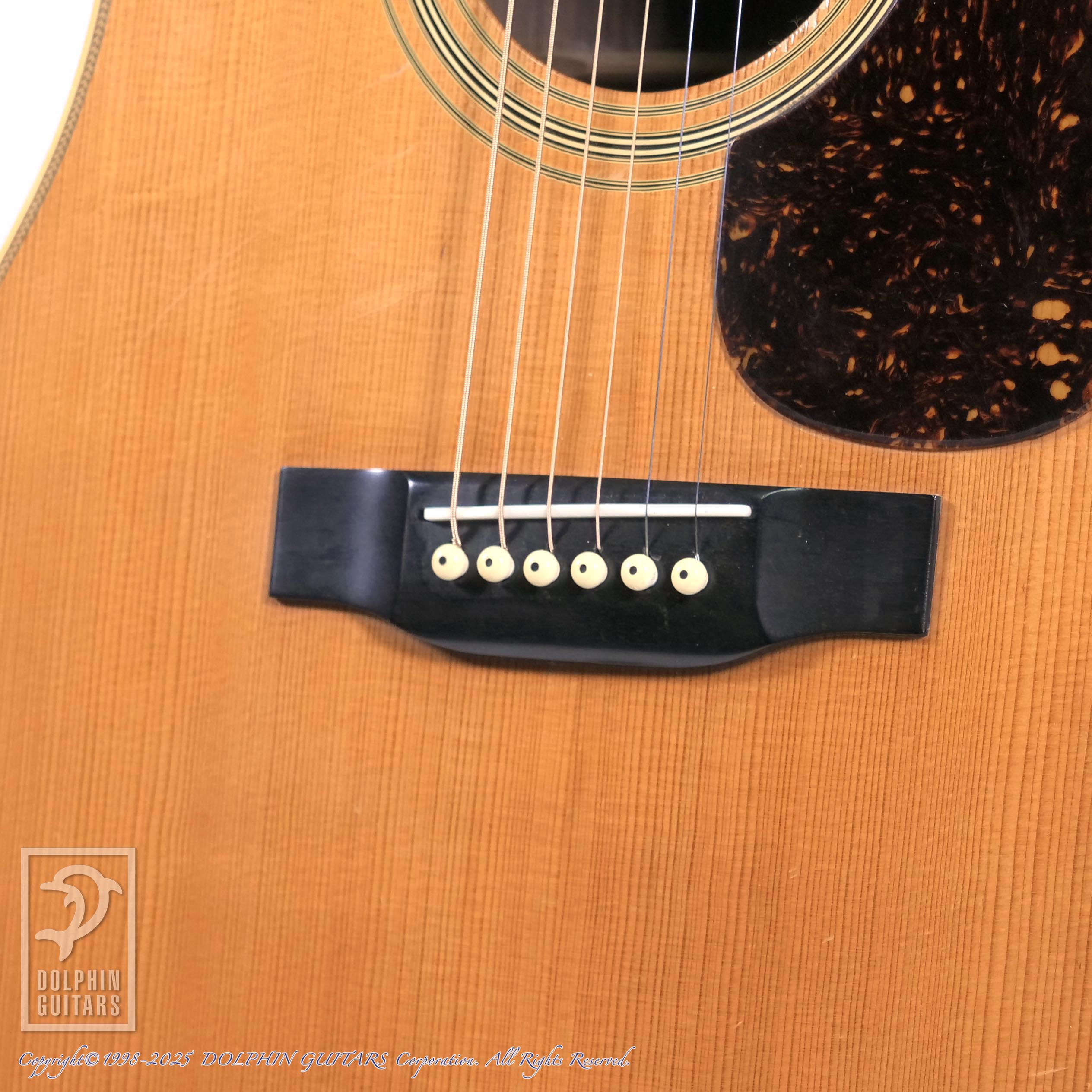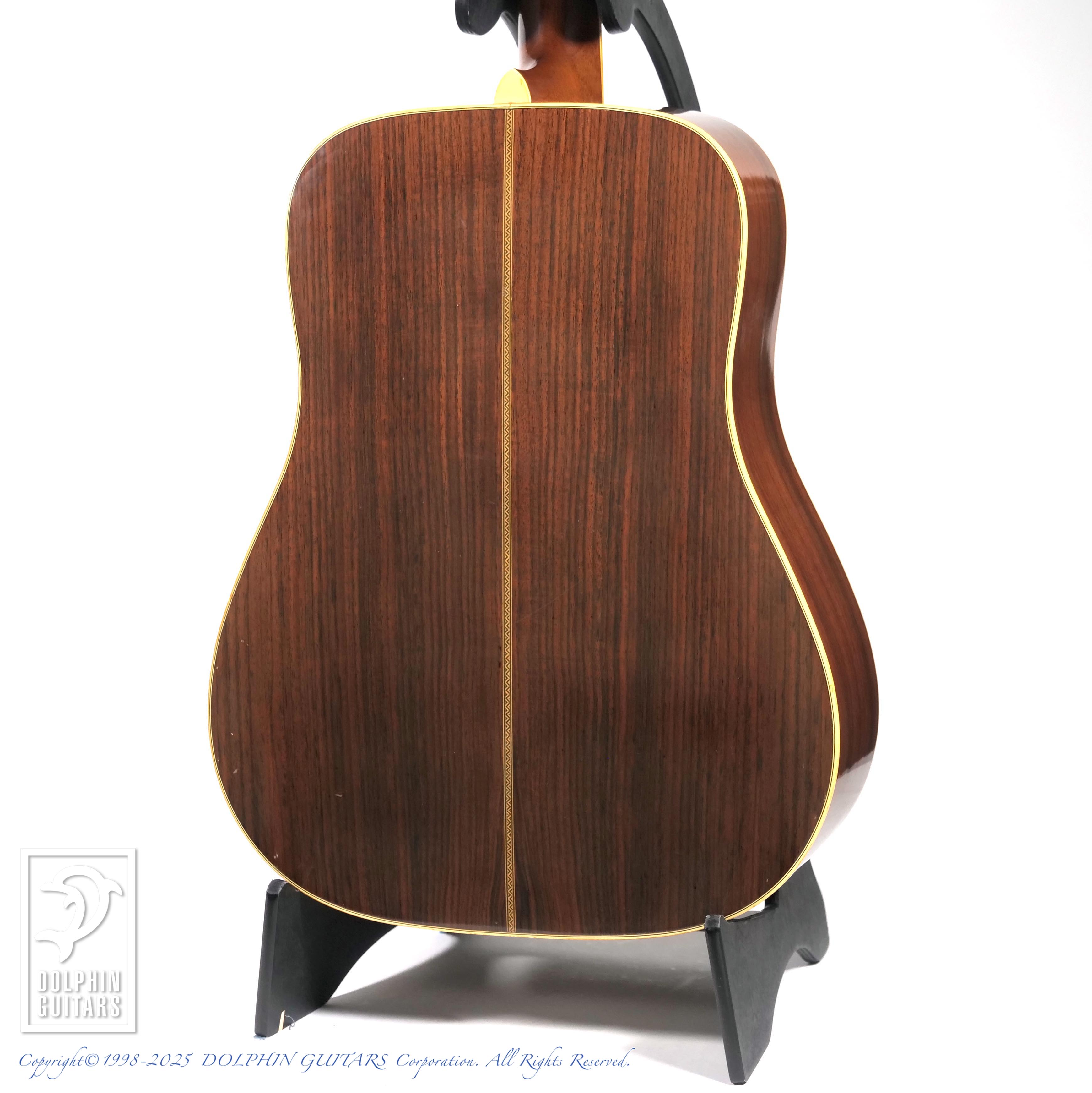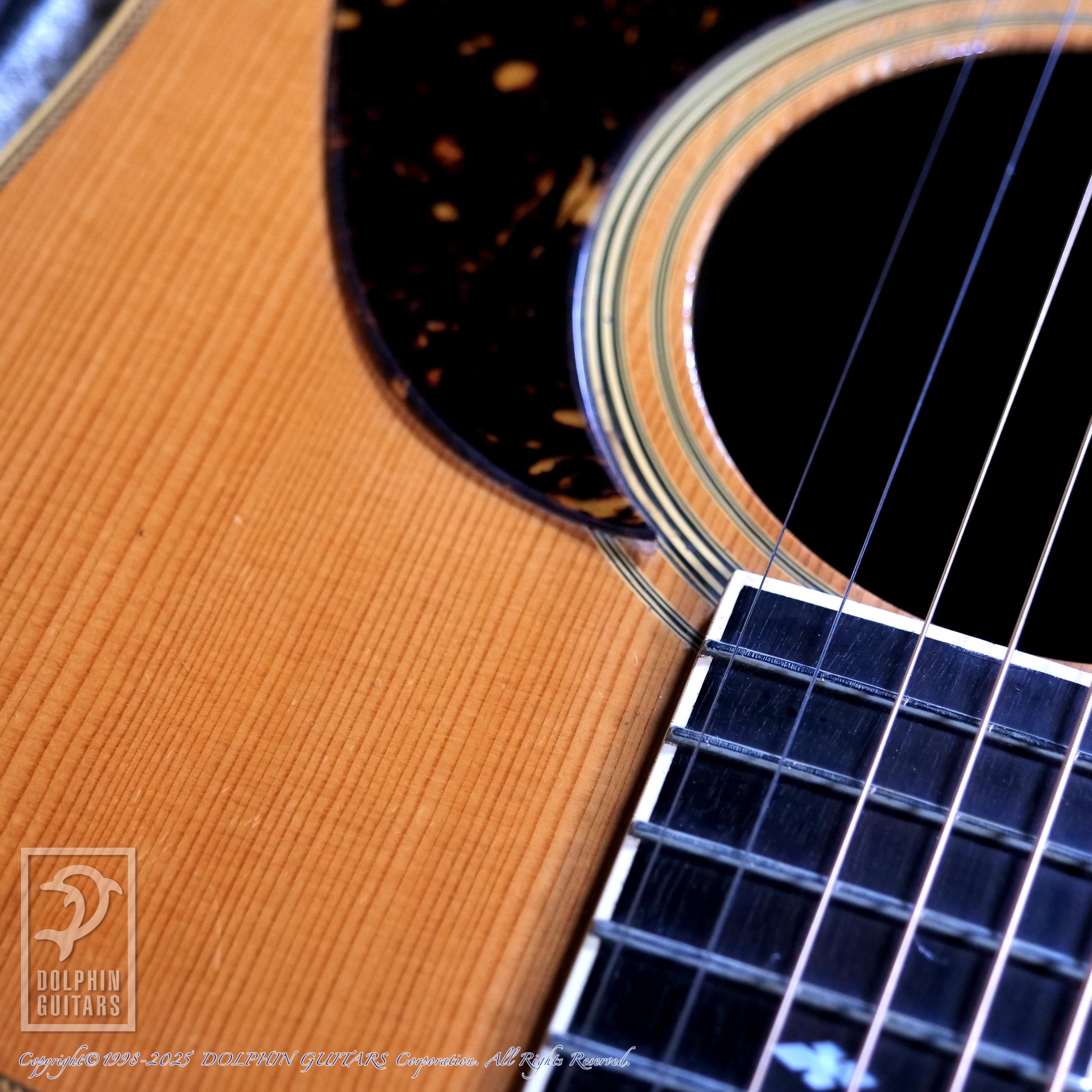 上位機種のこちらはジャーマンスプルーストップを採用するという通な仕様です。指板やヘッドもバインディングで囲われた豪華仕様です。カタログにサイド単板の表記がないため単板と記載できませんが、丁寧な割れ止めテープや表裏の木目のマッチングからすると、単板と言いたくなる構造で、何よりその抜けの良い豪快な響きがそれを裏付けているとも言えます。