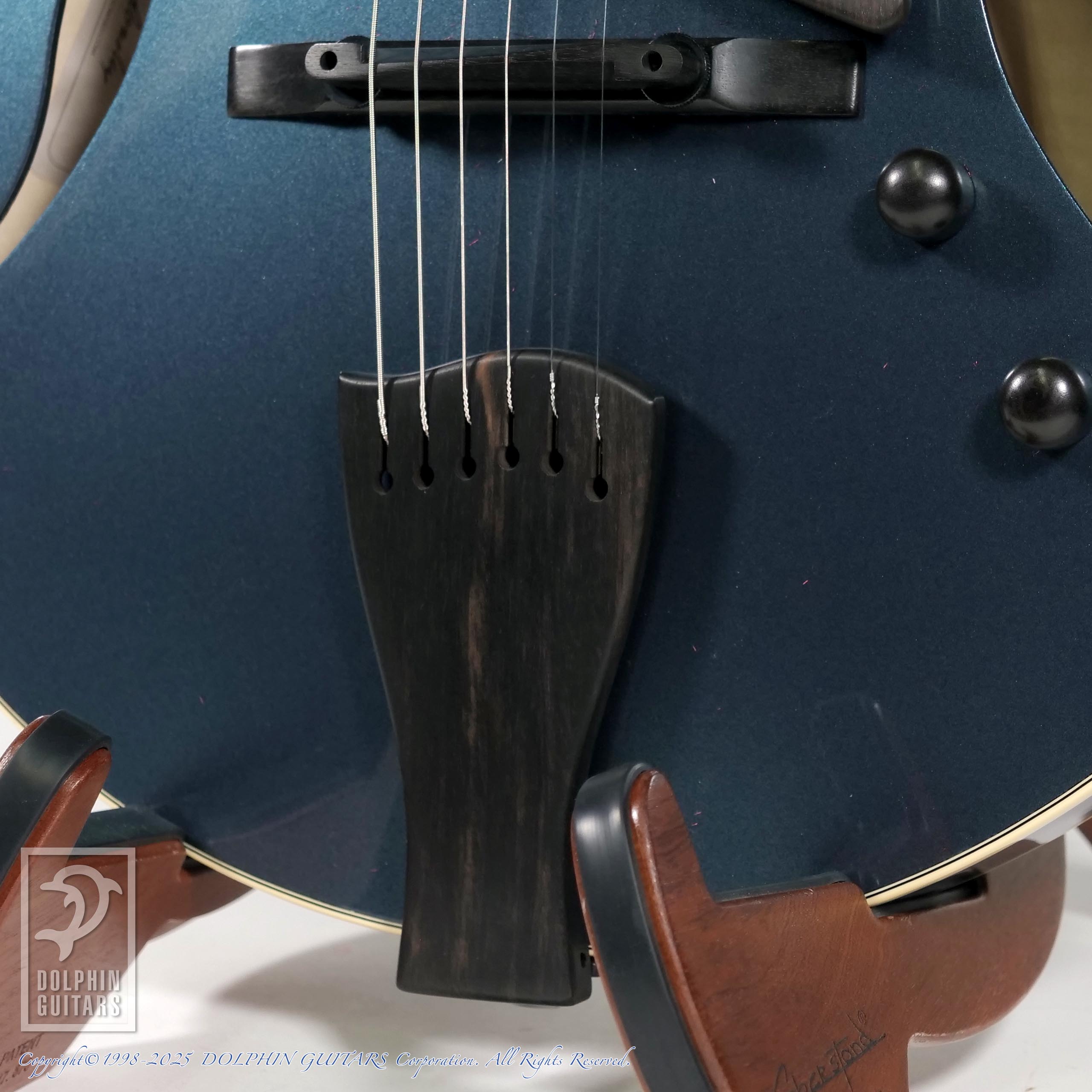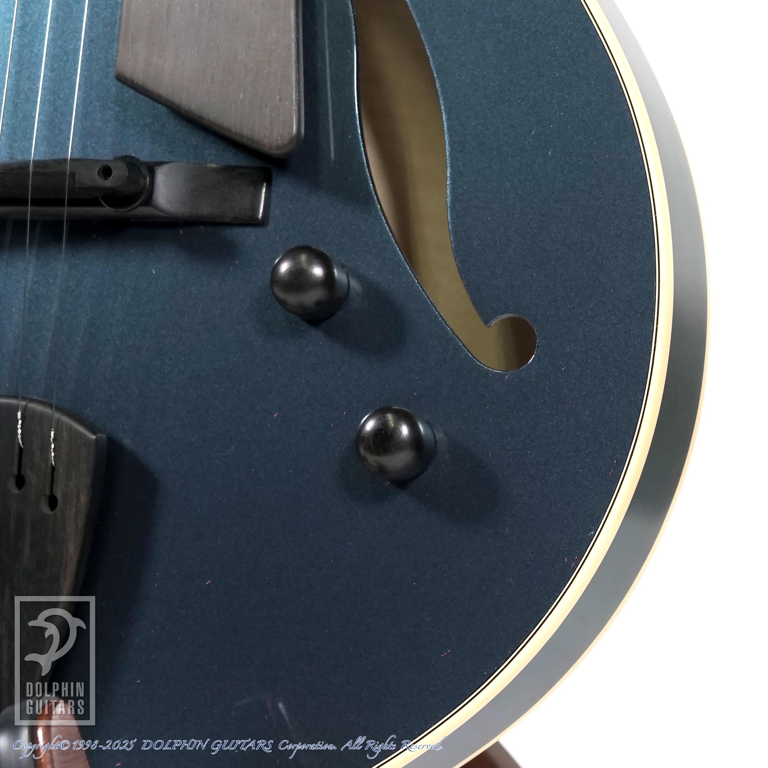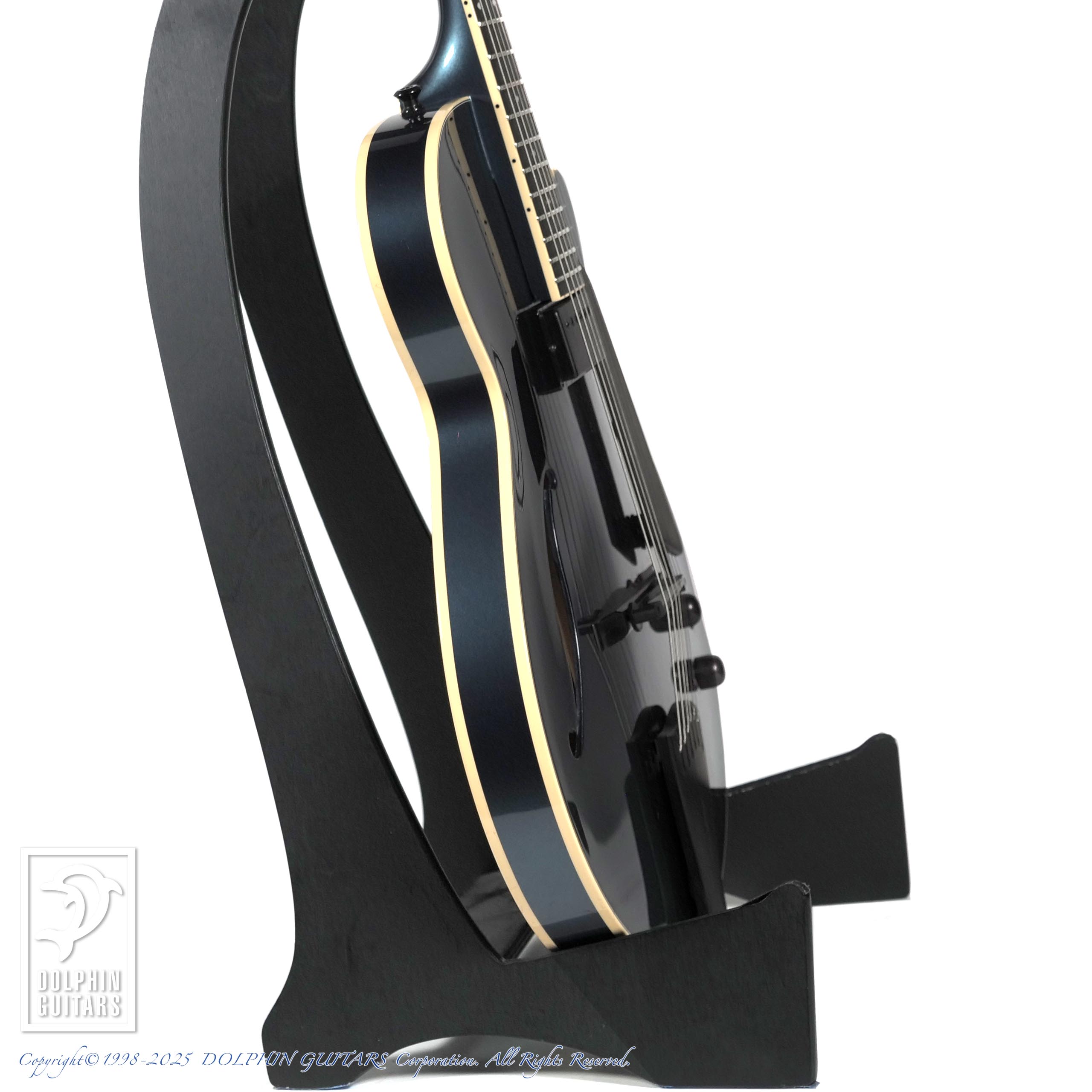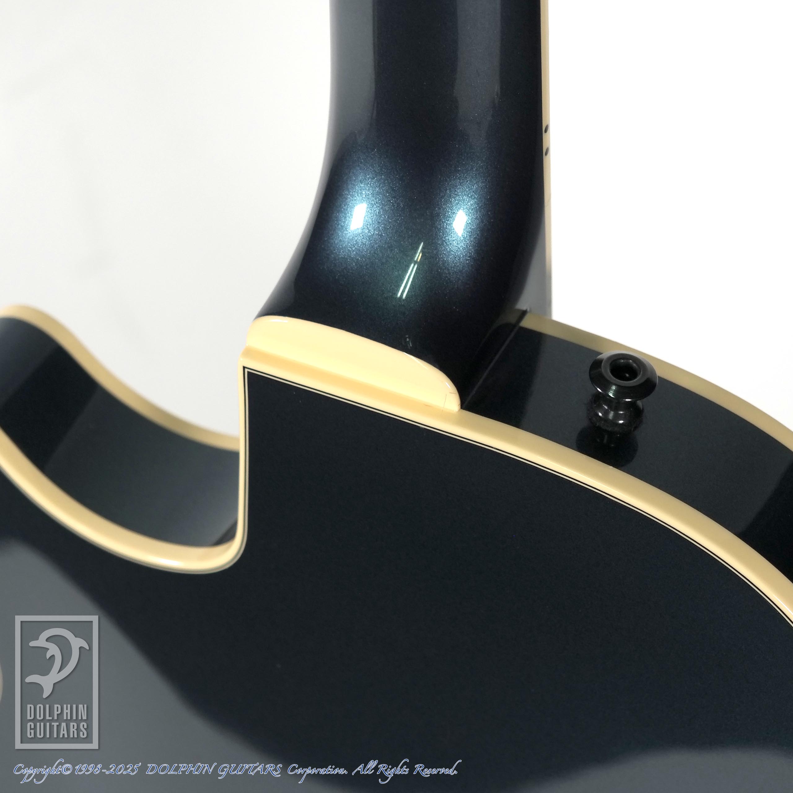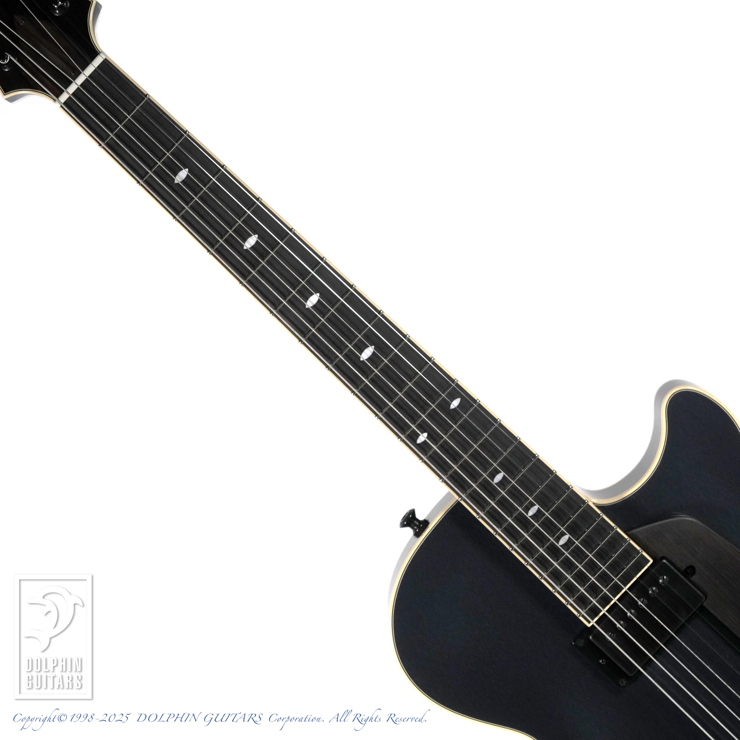 パーツ類は黒に統一されており、指板のポジションマークはシンプルなキャッツアイ・インレイと相まってスタイリッシュな外観です。