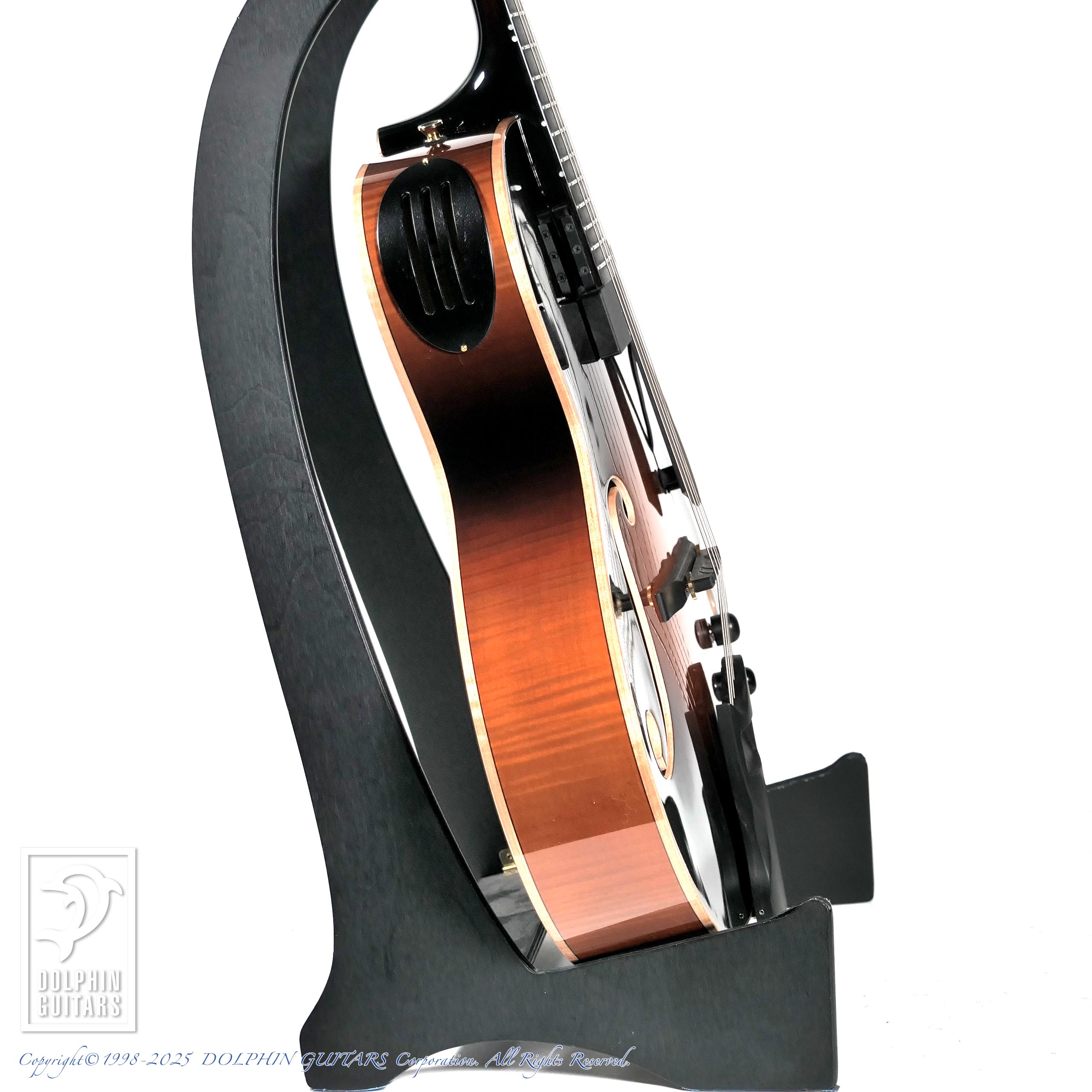 ボディやFホールのバインディングにも使われている、フレイムメイプルの美しい杢目が高級感を演出しております。