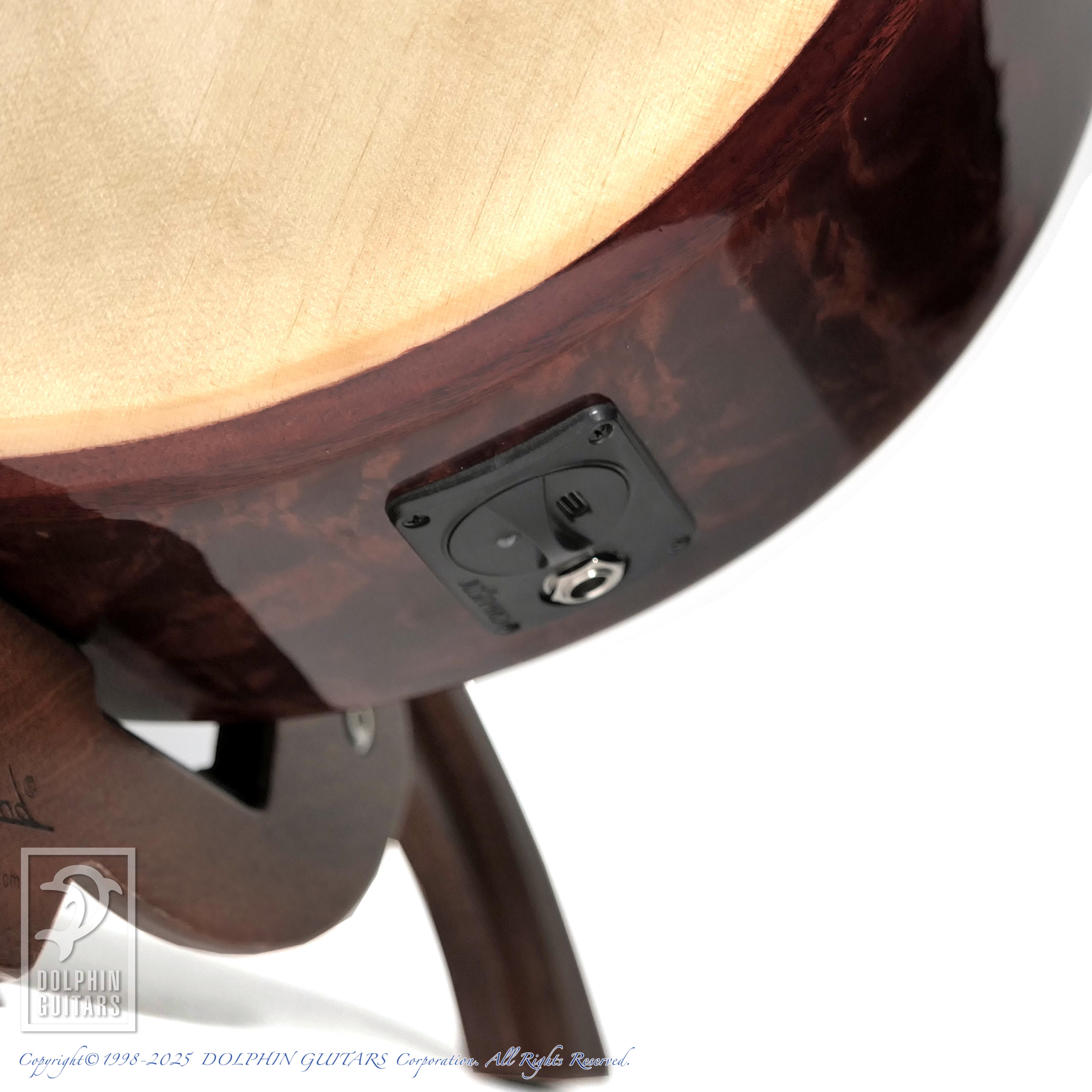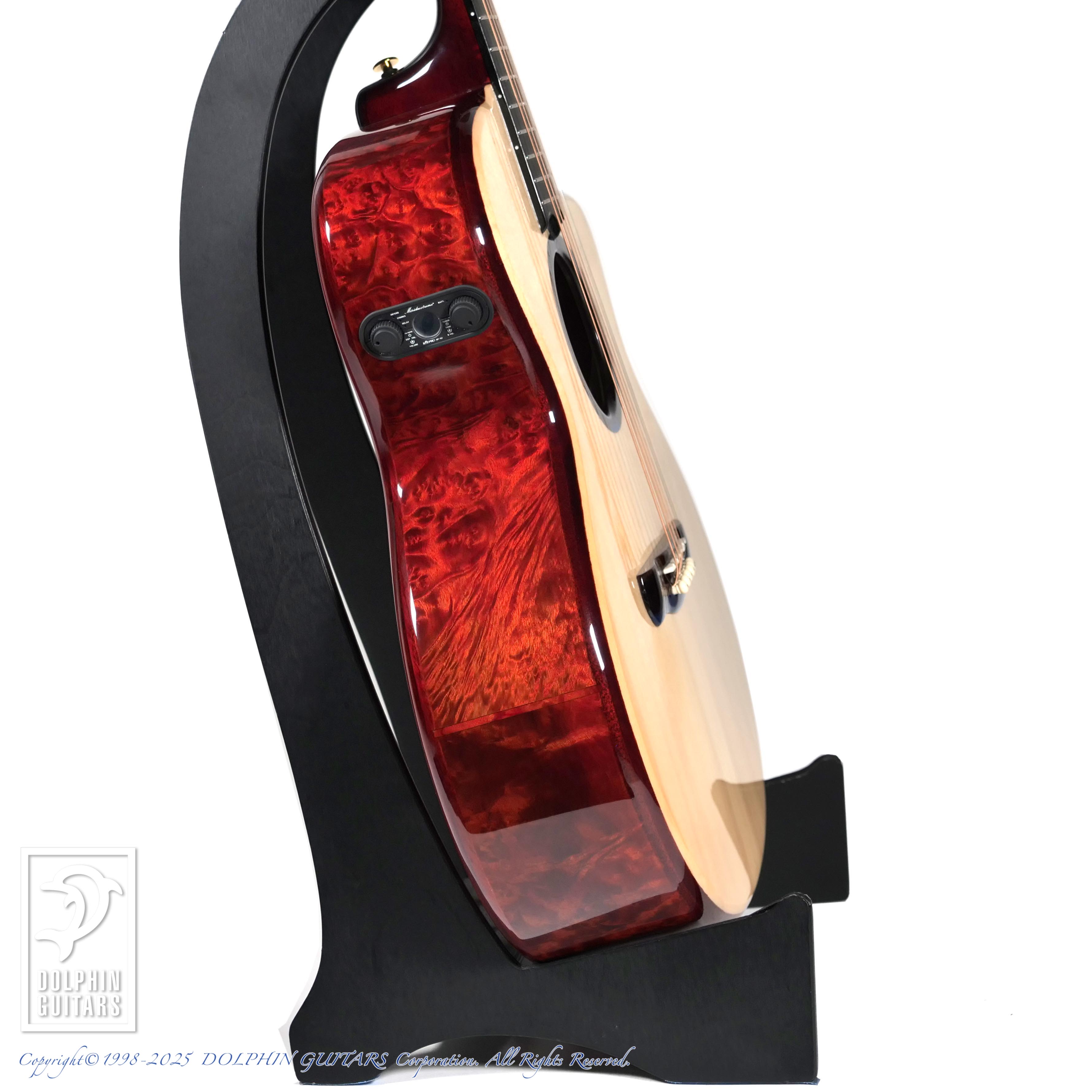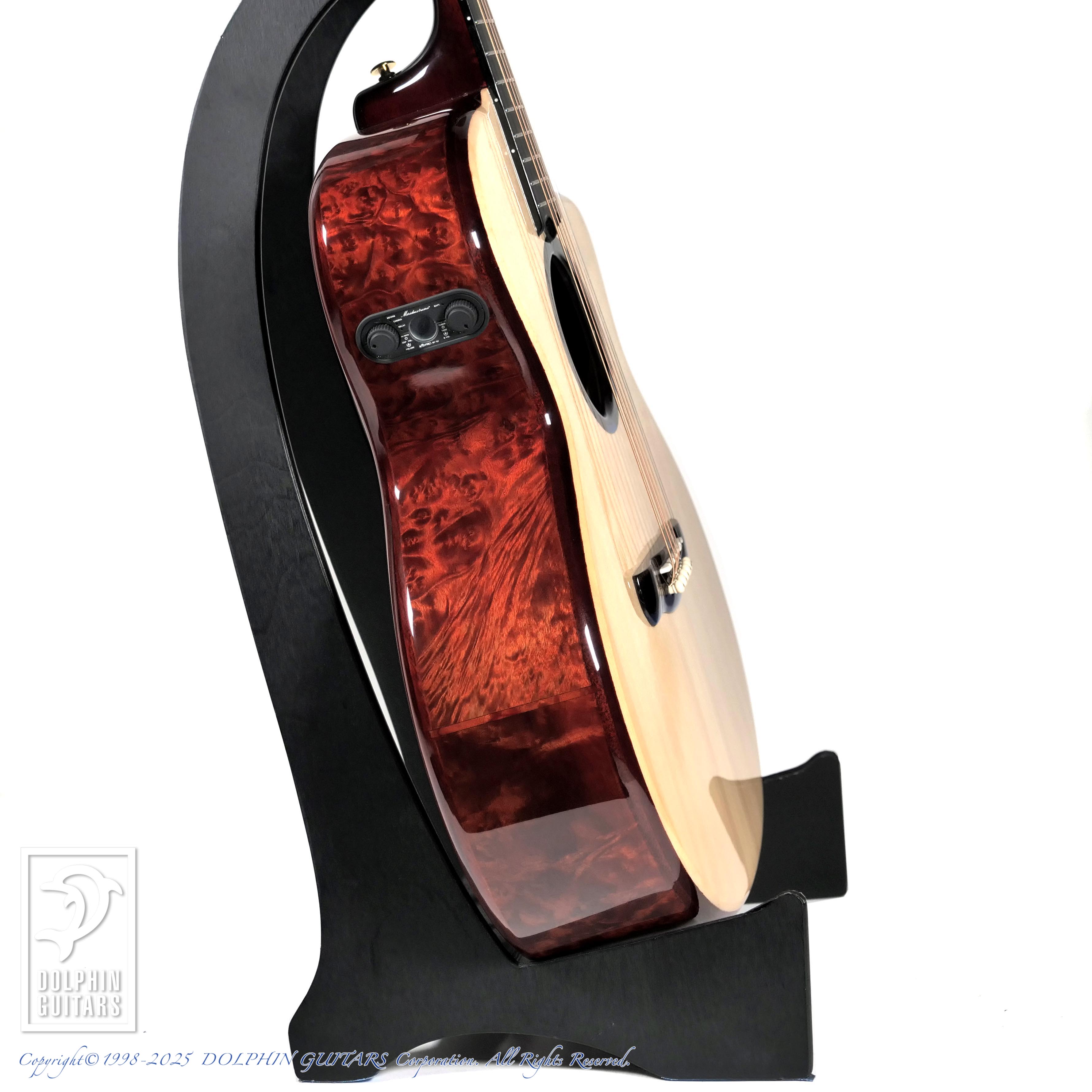 サイド&バックには、内側にマホガニー、外側に希少材“Grapha”のバールウッドを使用。まるでアートピースのように華やかなバール杢が目を引く外観です。トップには豊かなレスポンスと明瞭な音像を生むスプルース単板を採用し、サウンドとデザインの両立を実現しています。