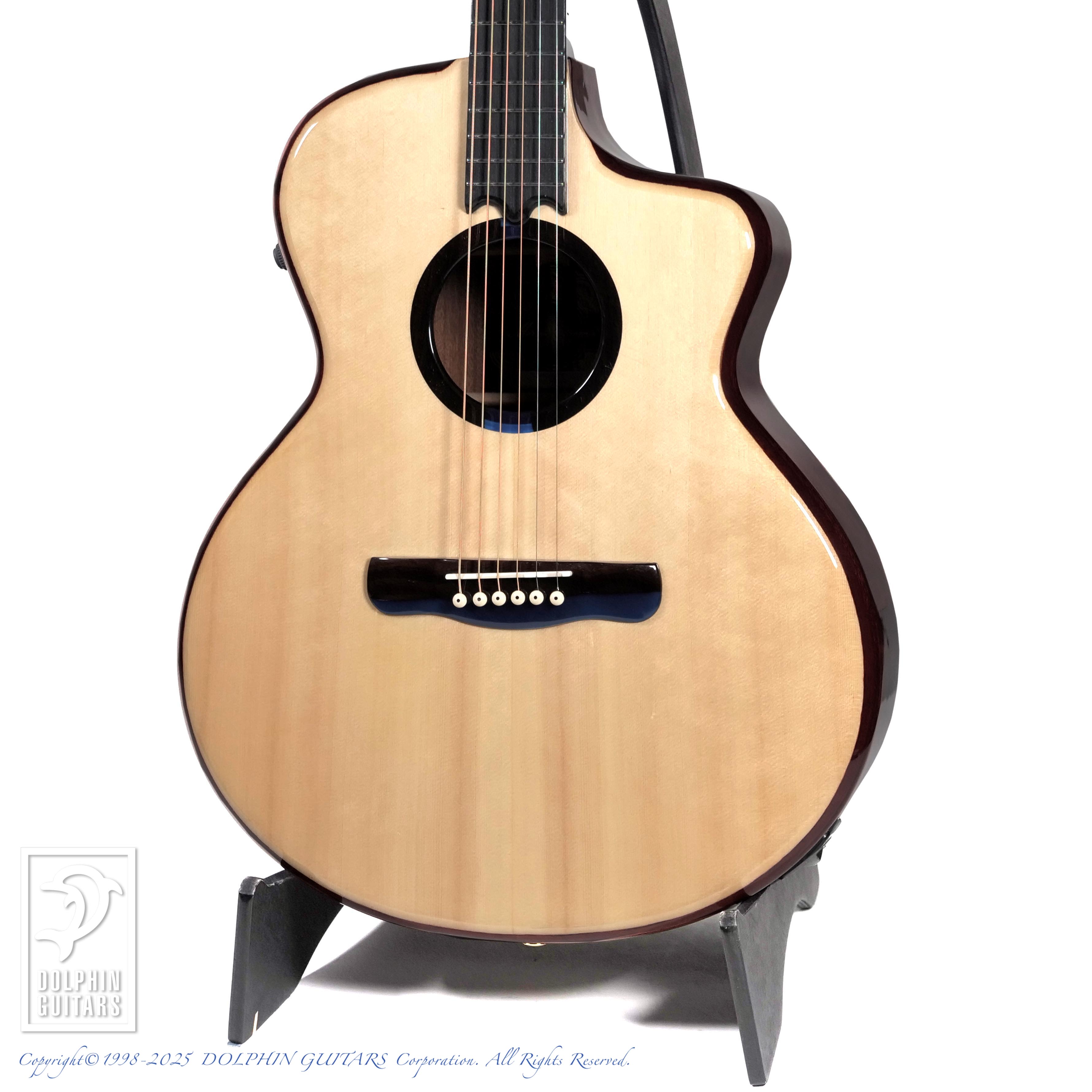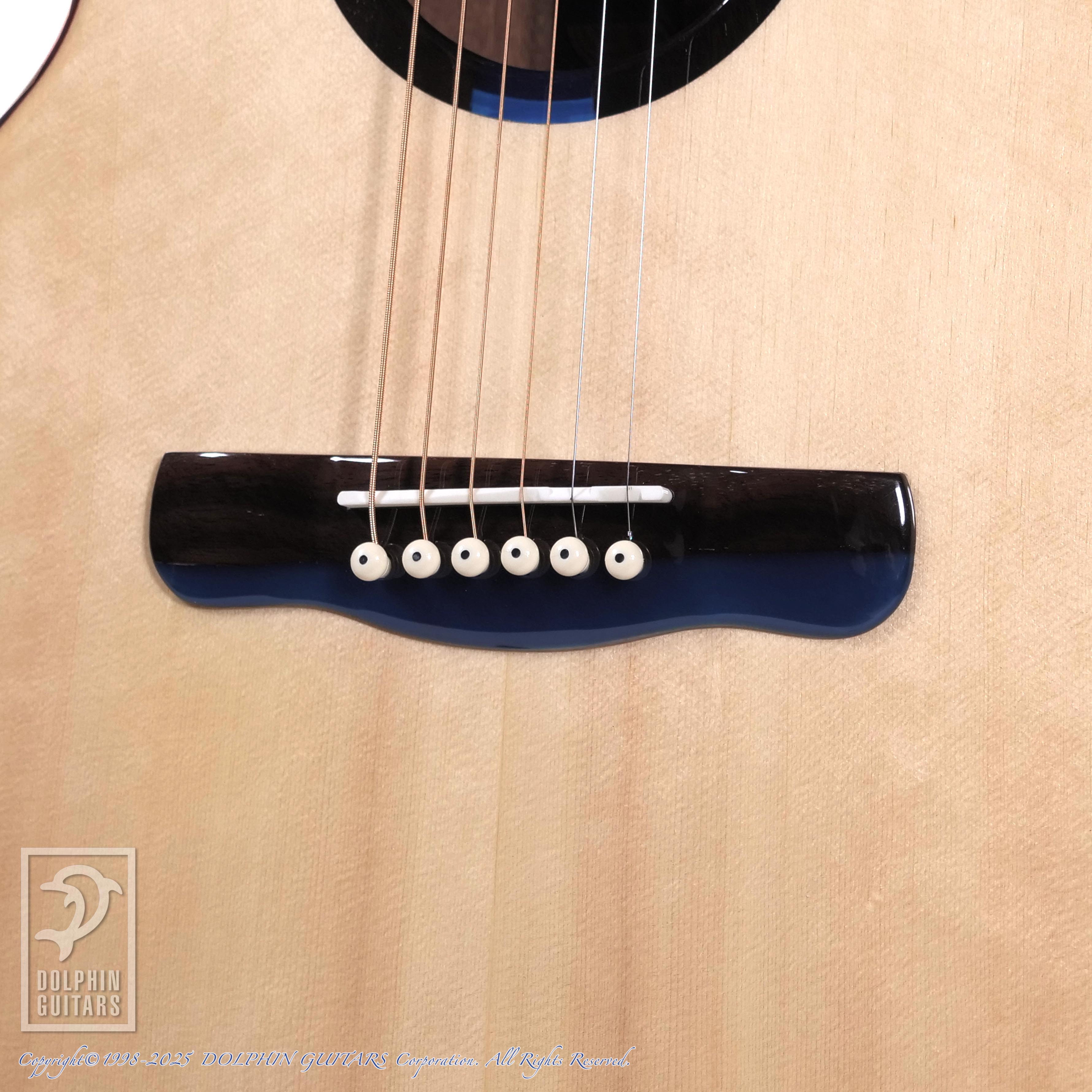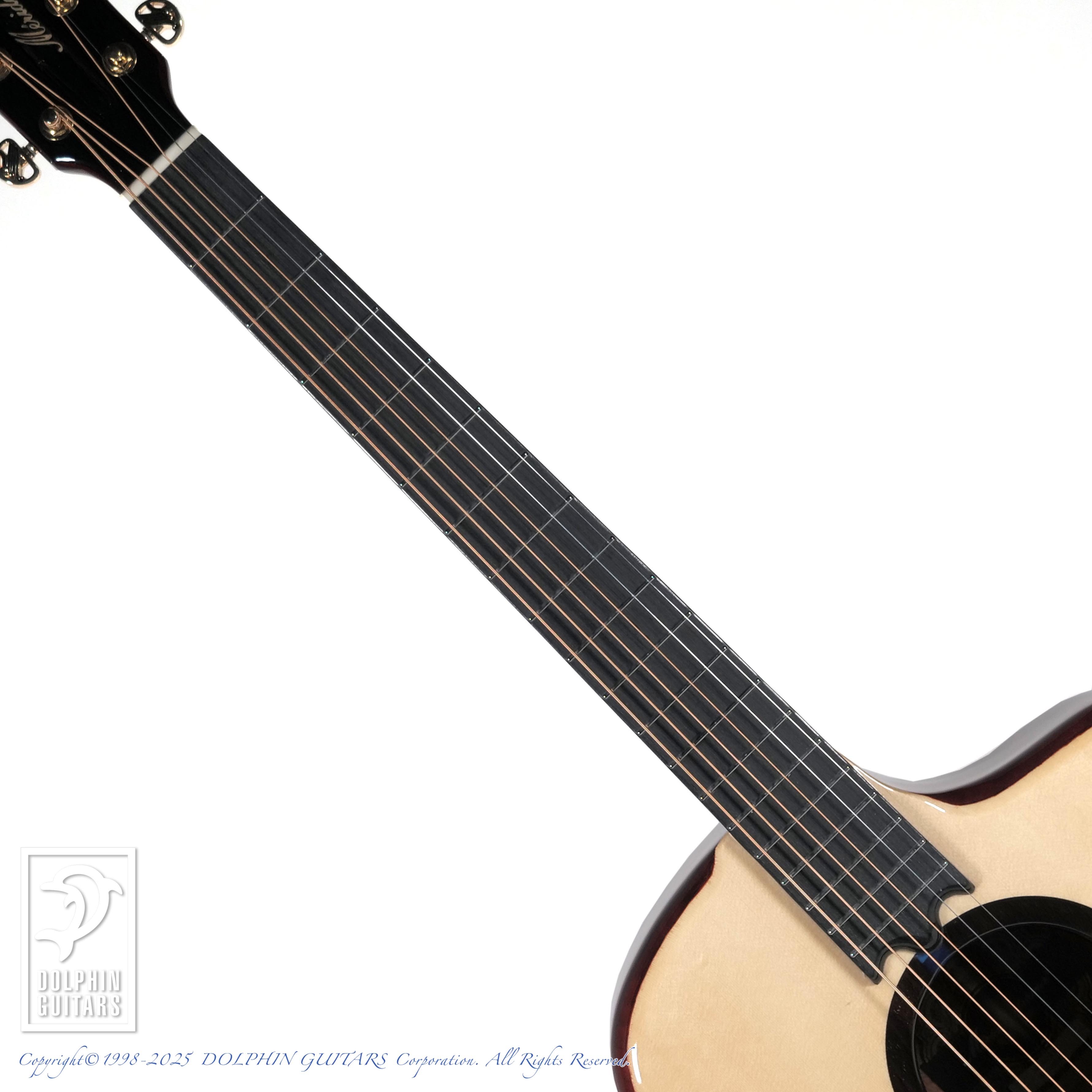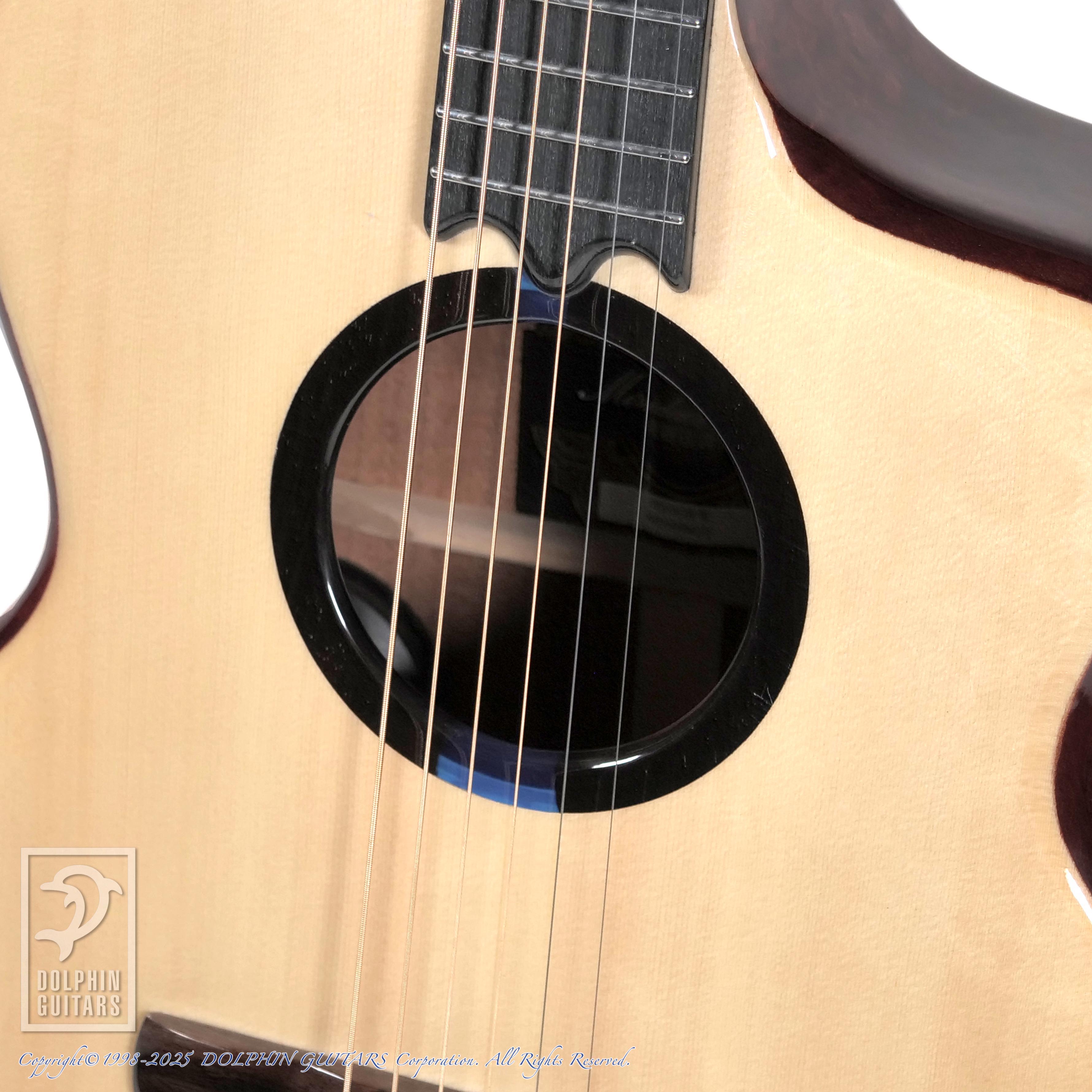 サイド&バックには、内側にマホガニー、外側に希少材“Grapha”のバールウッドを使用。まるでアートピースのように華やかなバール杢が目を引く外観です。トップには豊かなレスポンスと明瞭な音像を生むスプルース単板を採用し、サウンドとデザインの両立を実現しています。