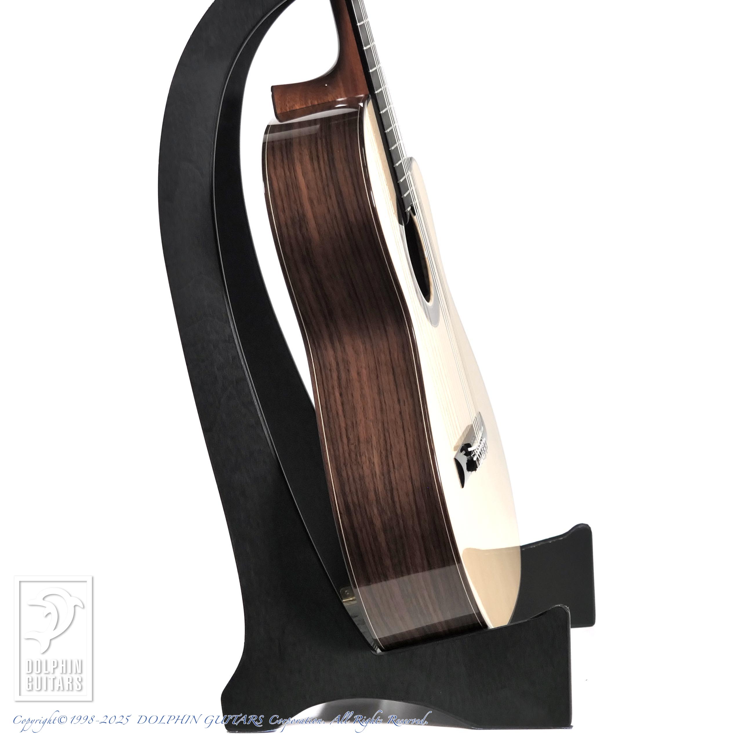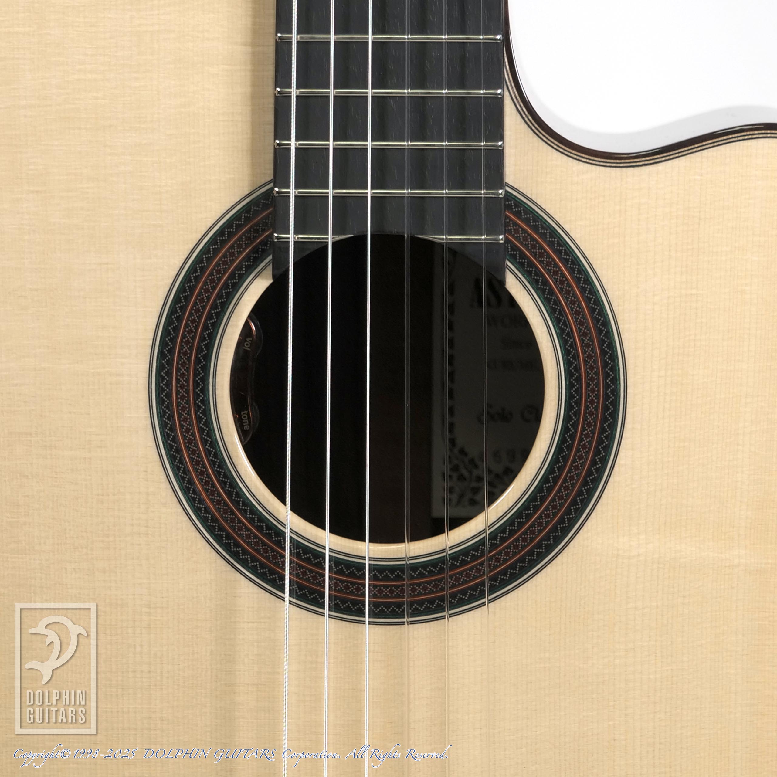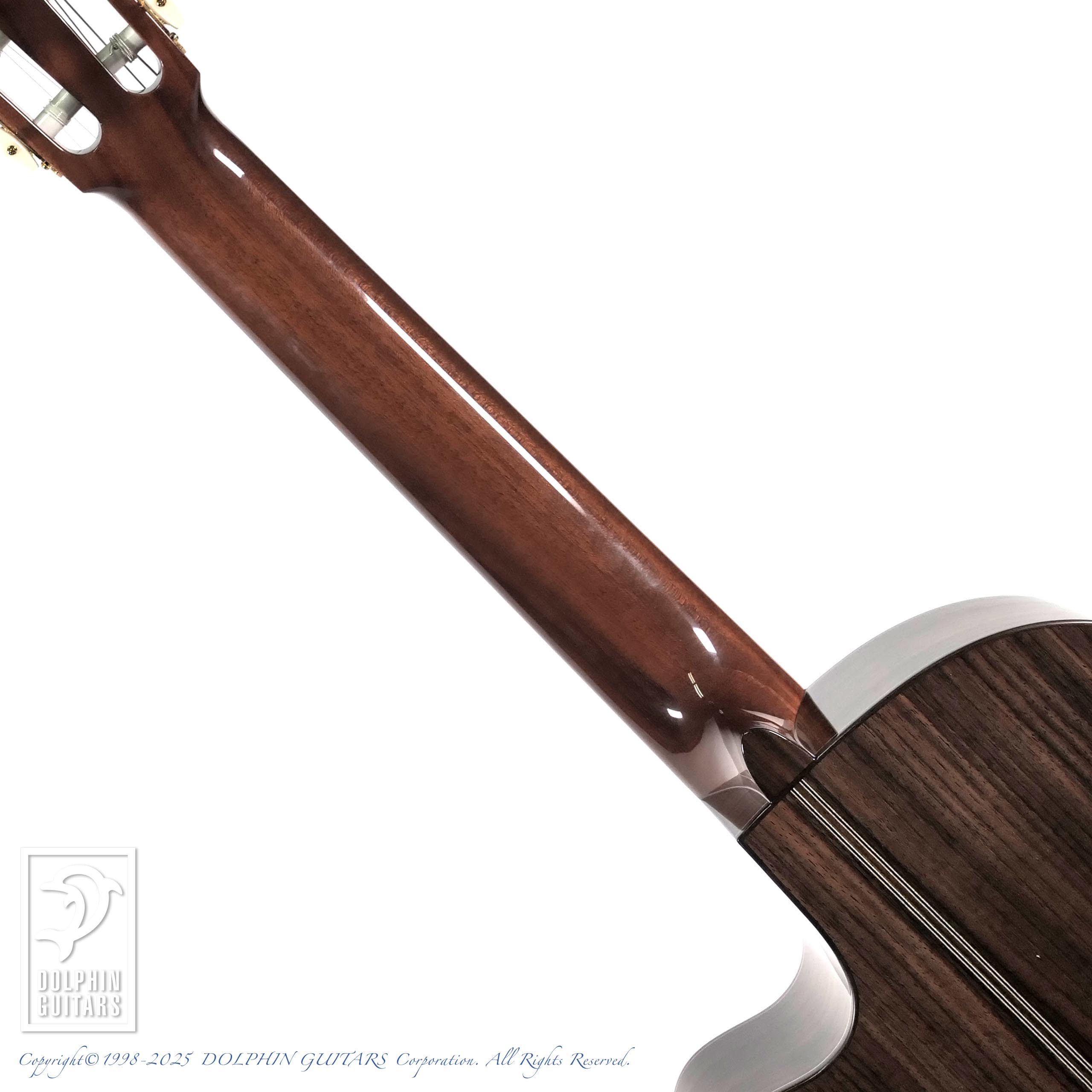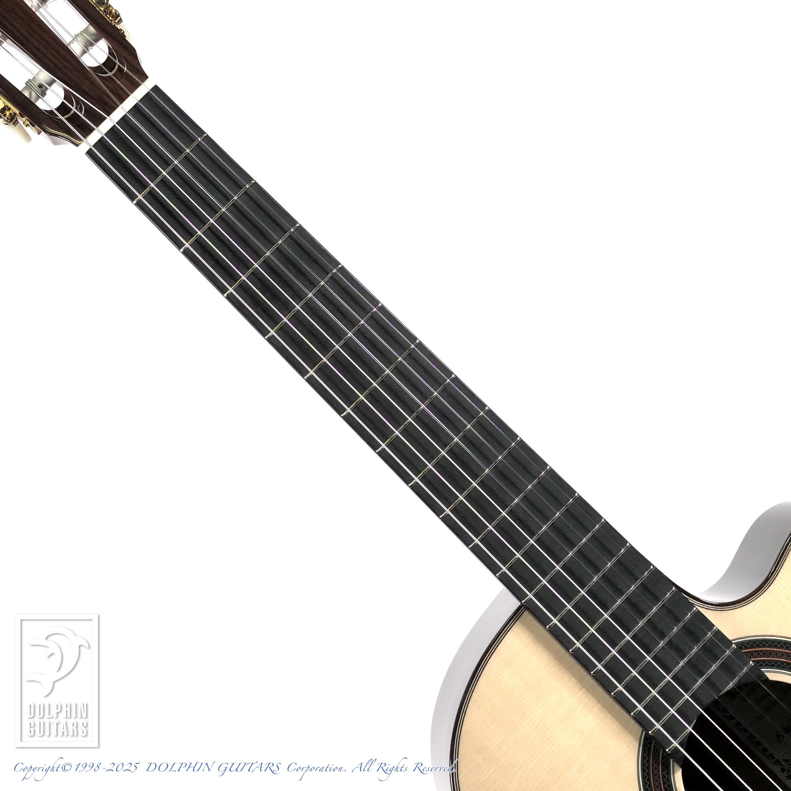 ハイポジションでのプレイアビリティを向上させるラウンドカッタウェイを施し、一般的なクラシックギターよりも僅かにコンパクトにした抱えやすいボディサイズであります。