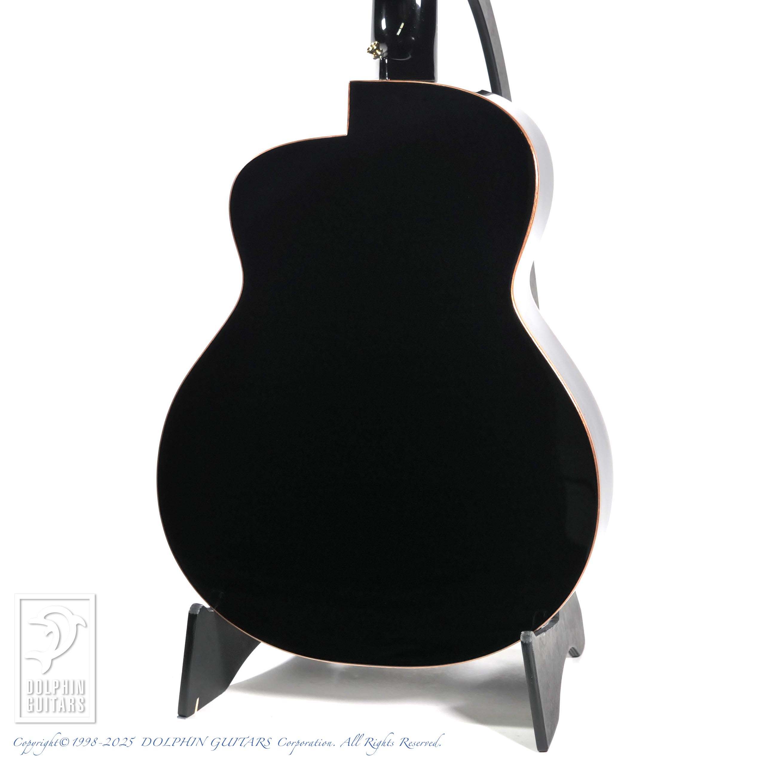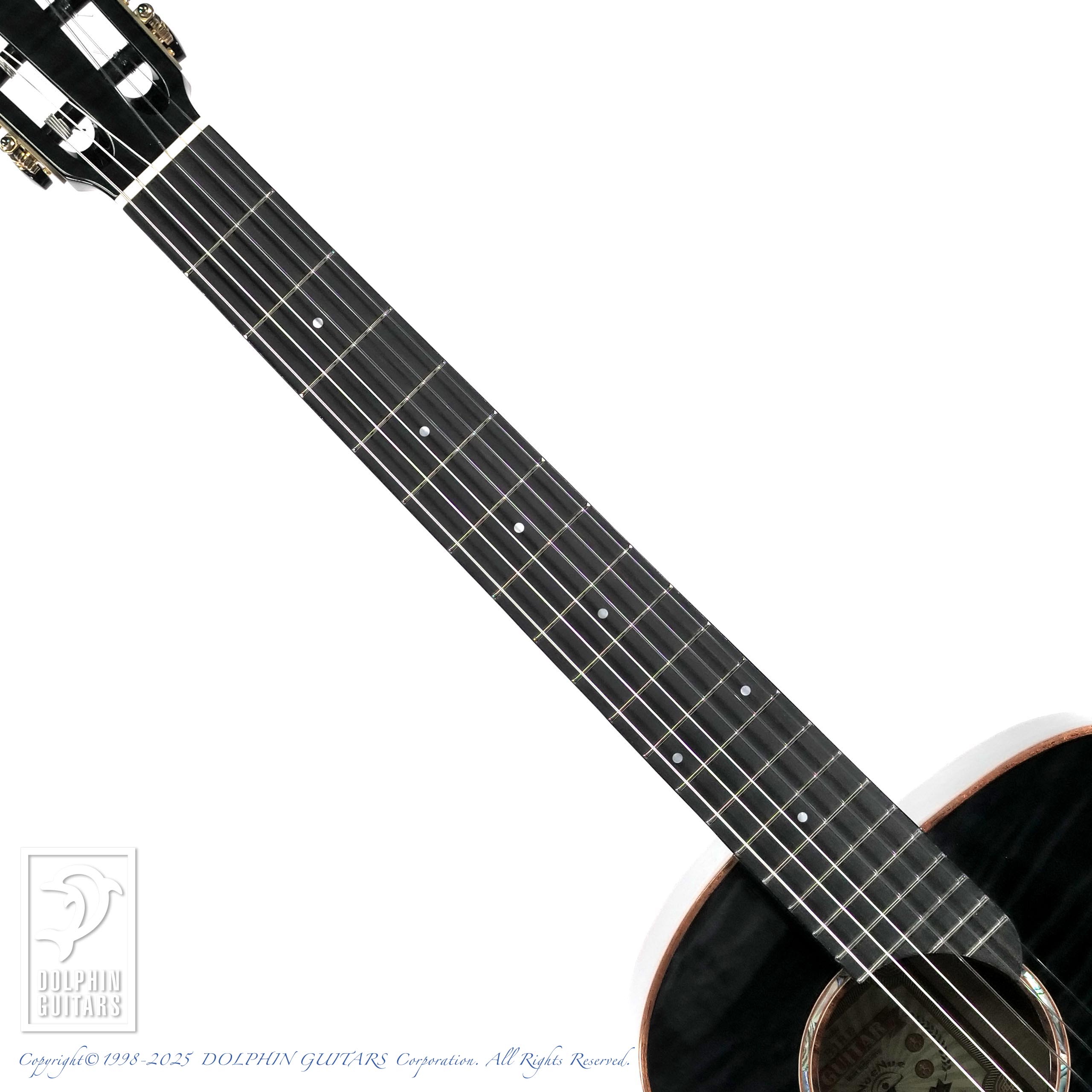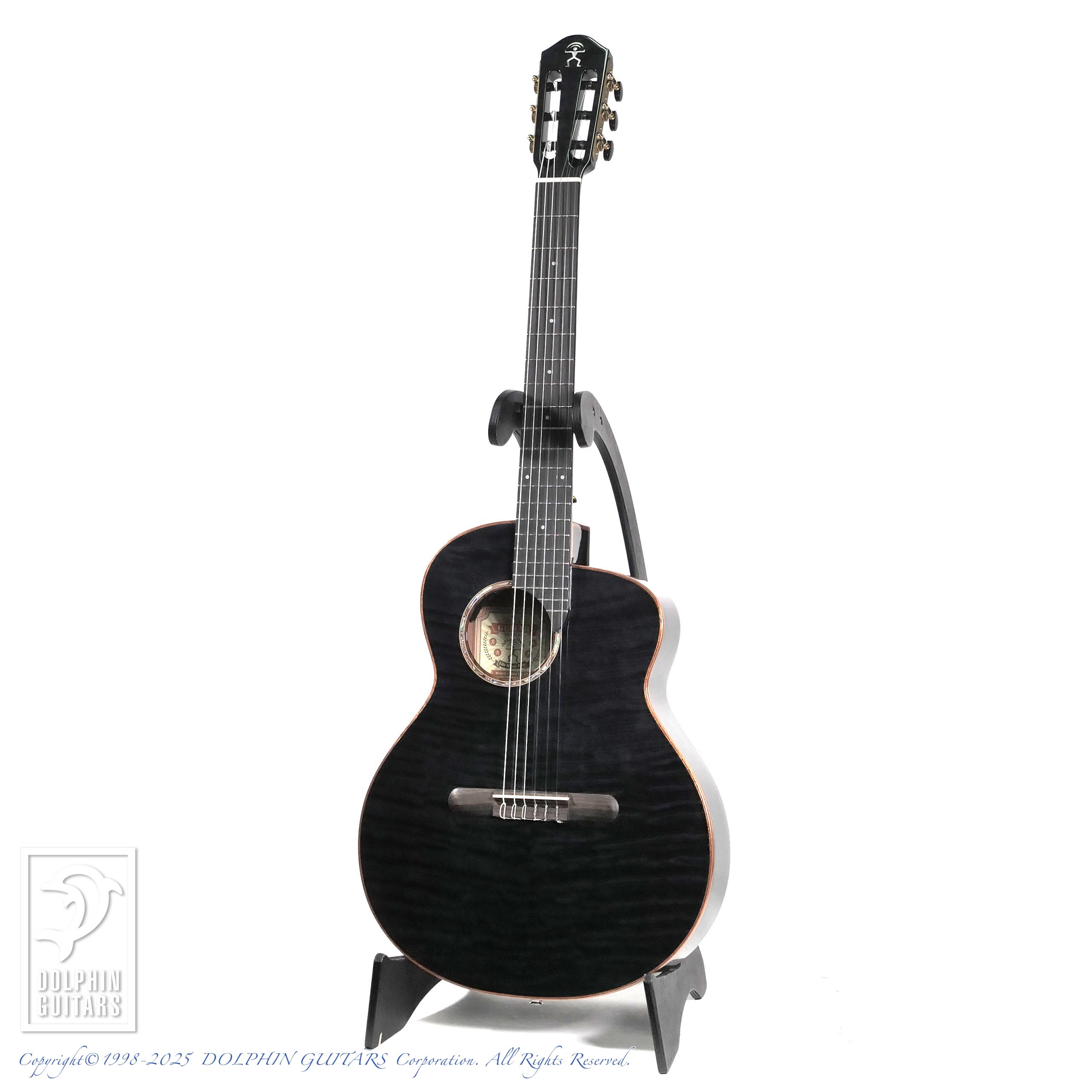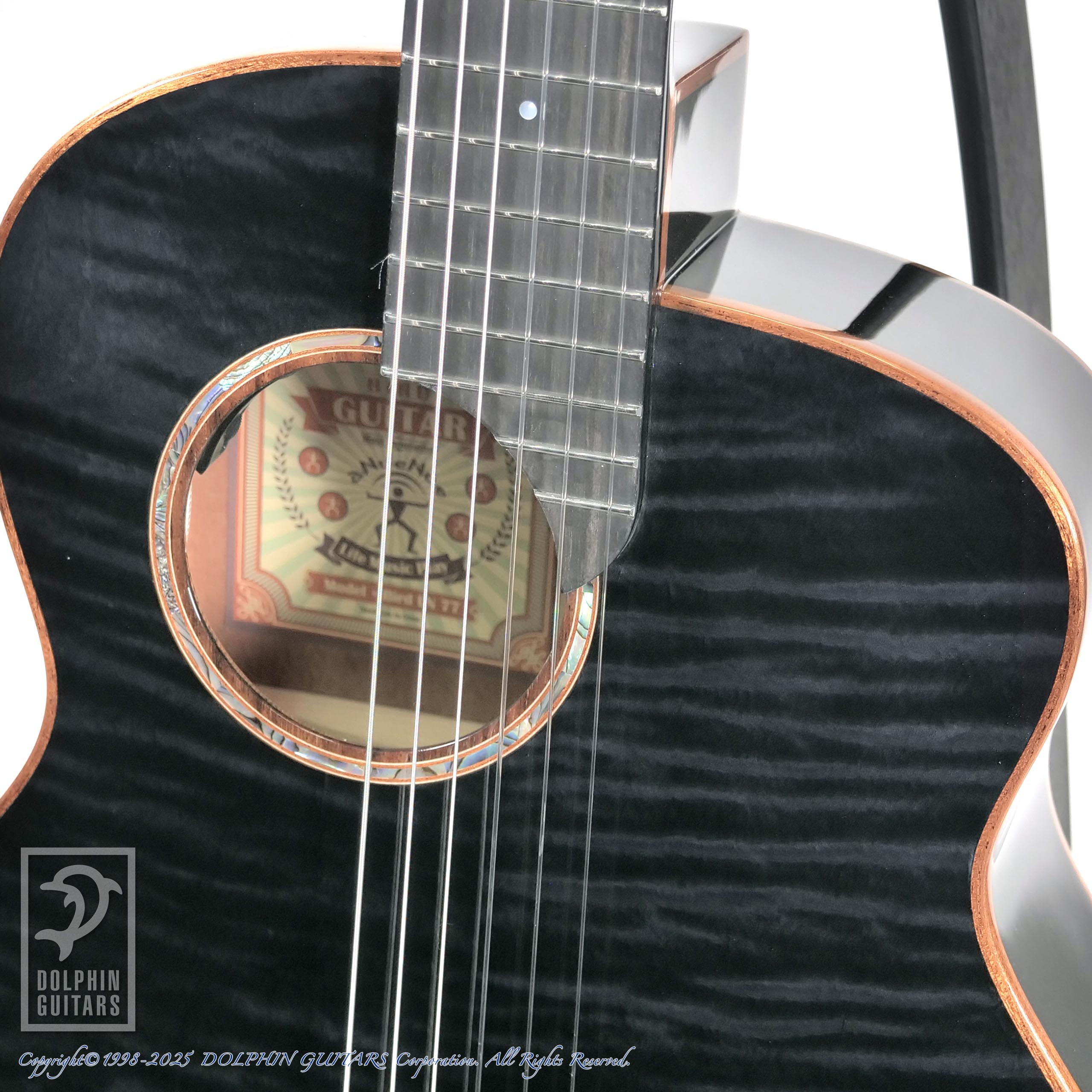カーリーメイプルをセダー材の表面に配した美しいギター。シースルーブラック塗装により、杢目が浮かび上がるような幻想的な印象を与えます。サイド&バックはほのかにラメが輝く凝った仕様です。