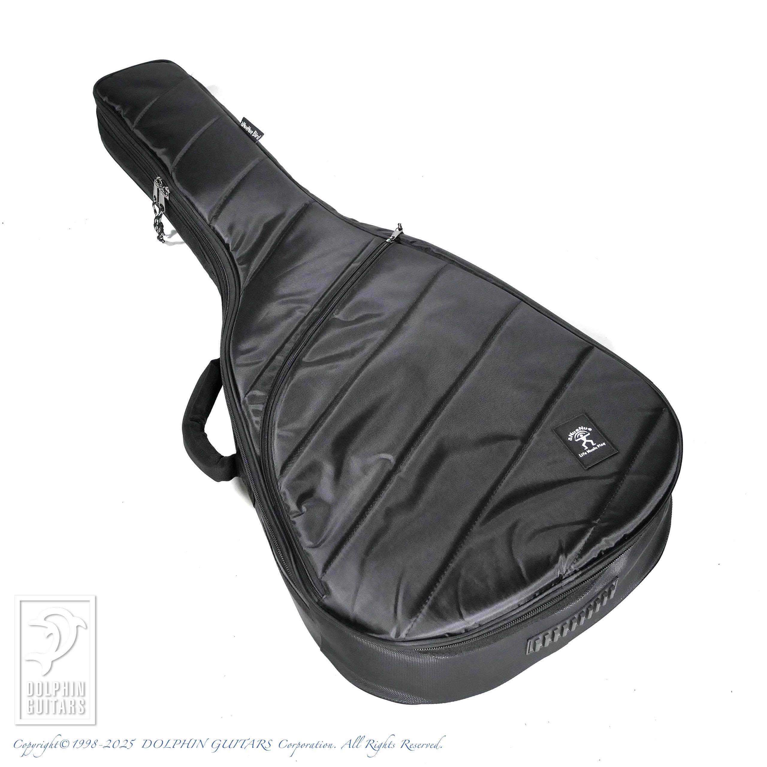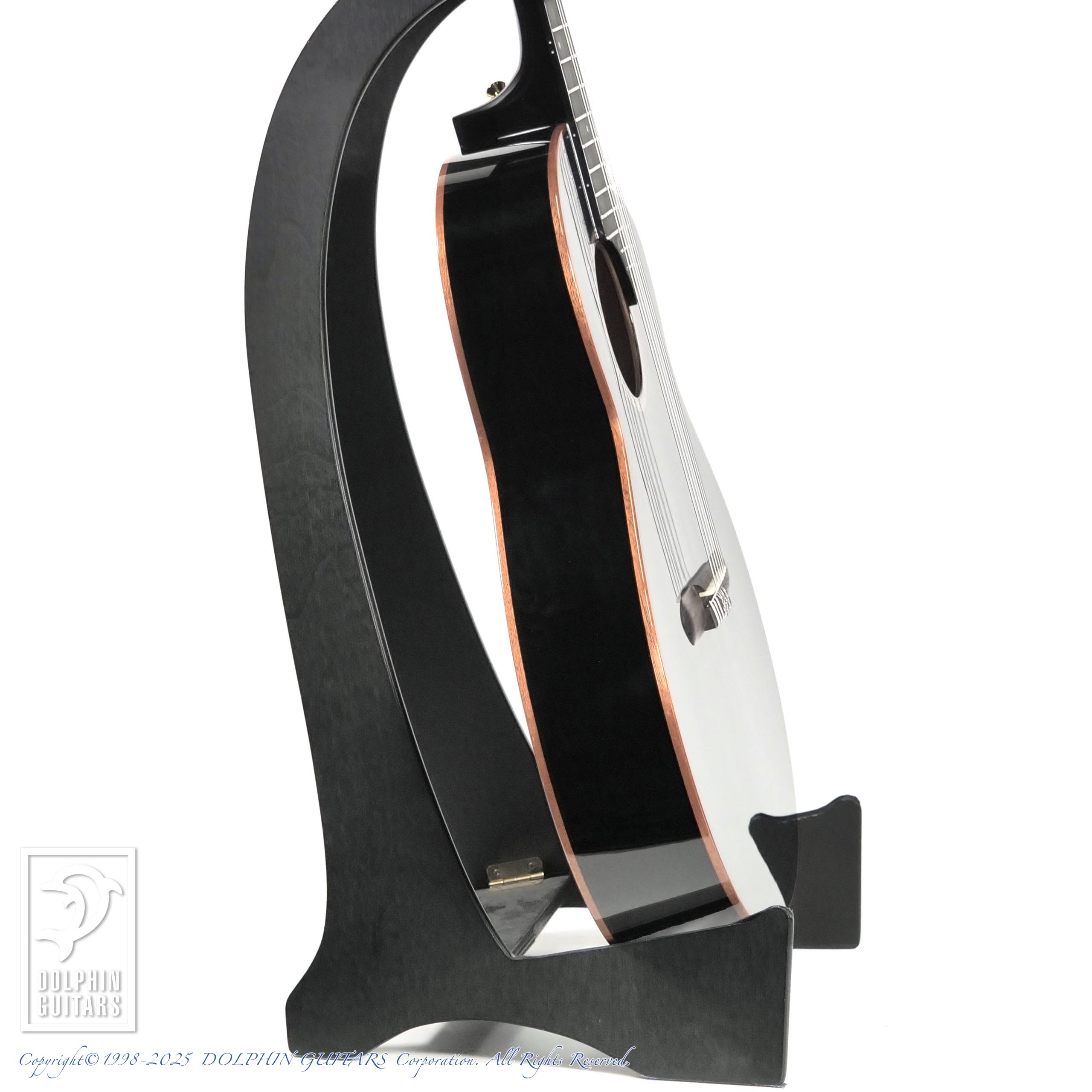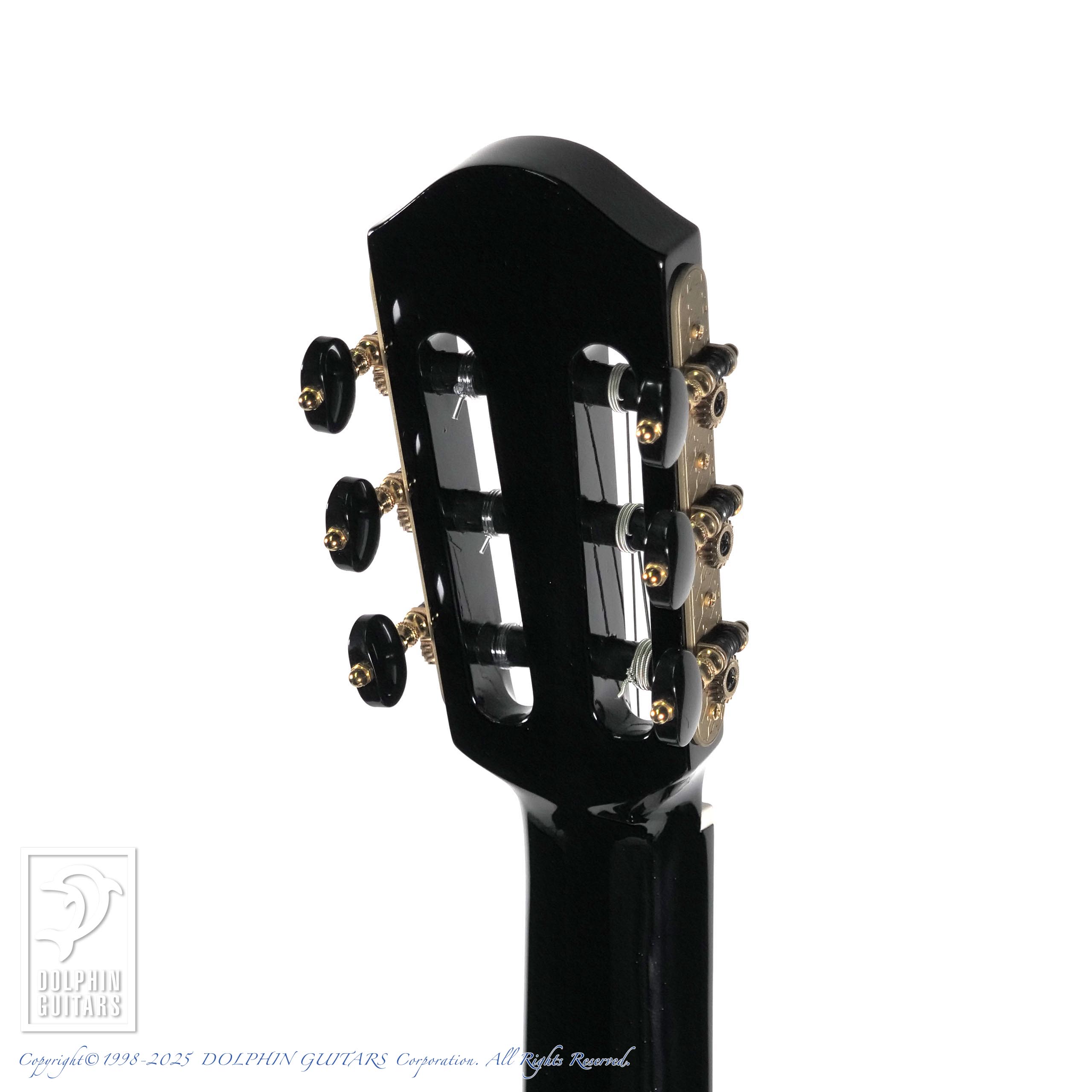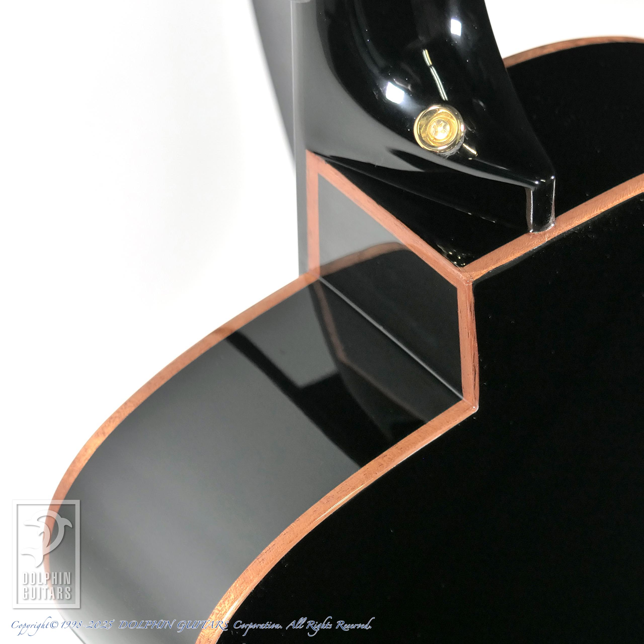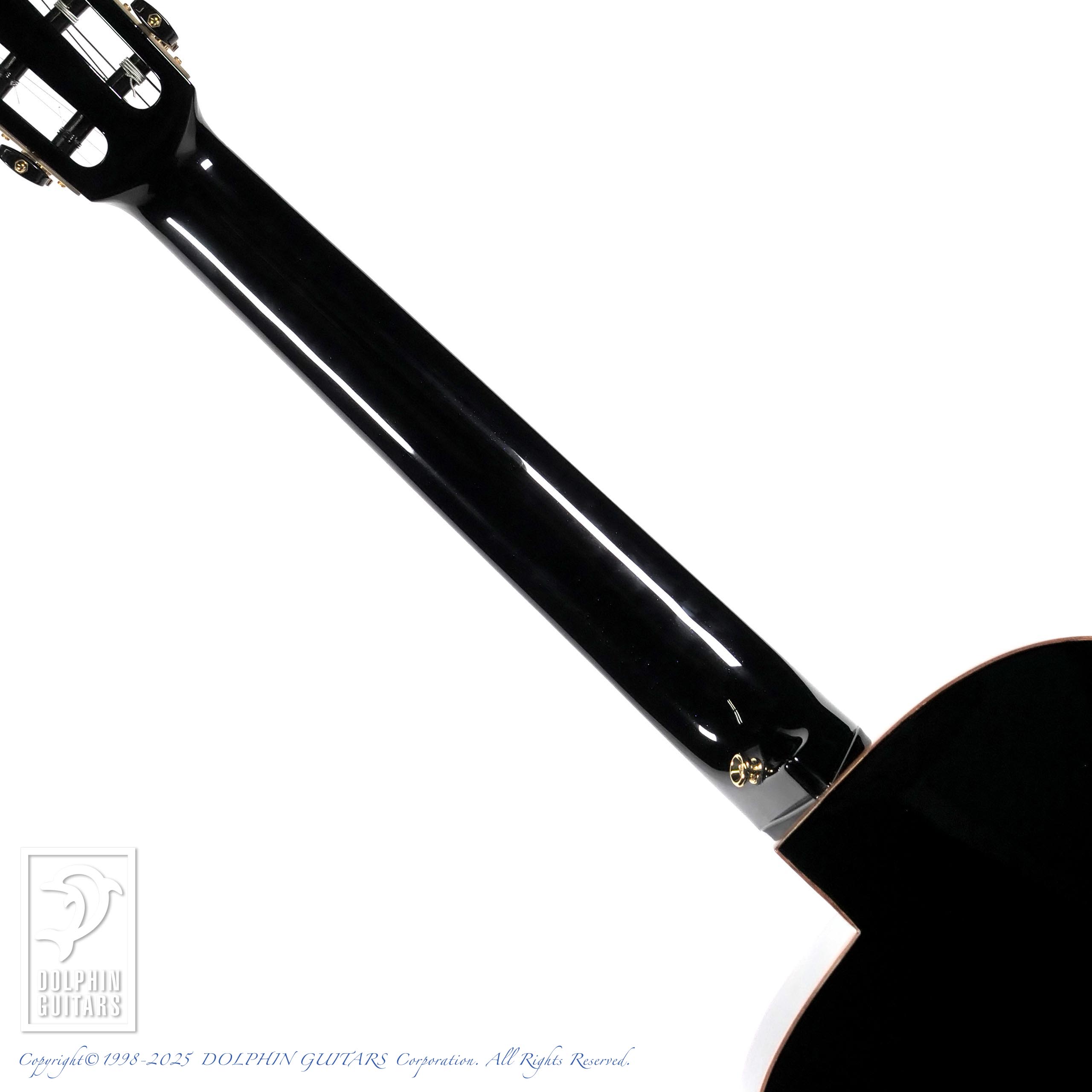 カーリーメイプルをセダー材の表面に配した美しいギター。シースルーブラック塗装により、杢目が浮かび上がるような幻想的な印象を与えます。サイド&バックはほのかにラメが輝く凝った仕様です。