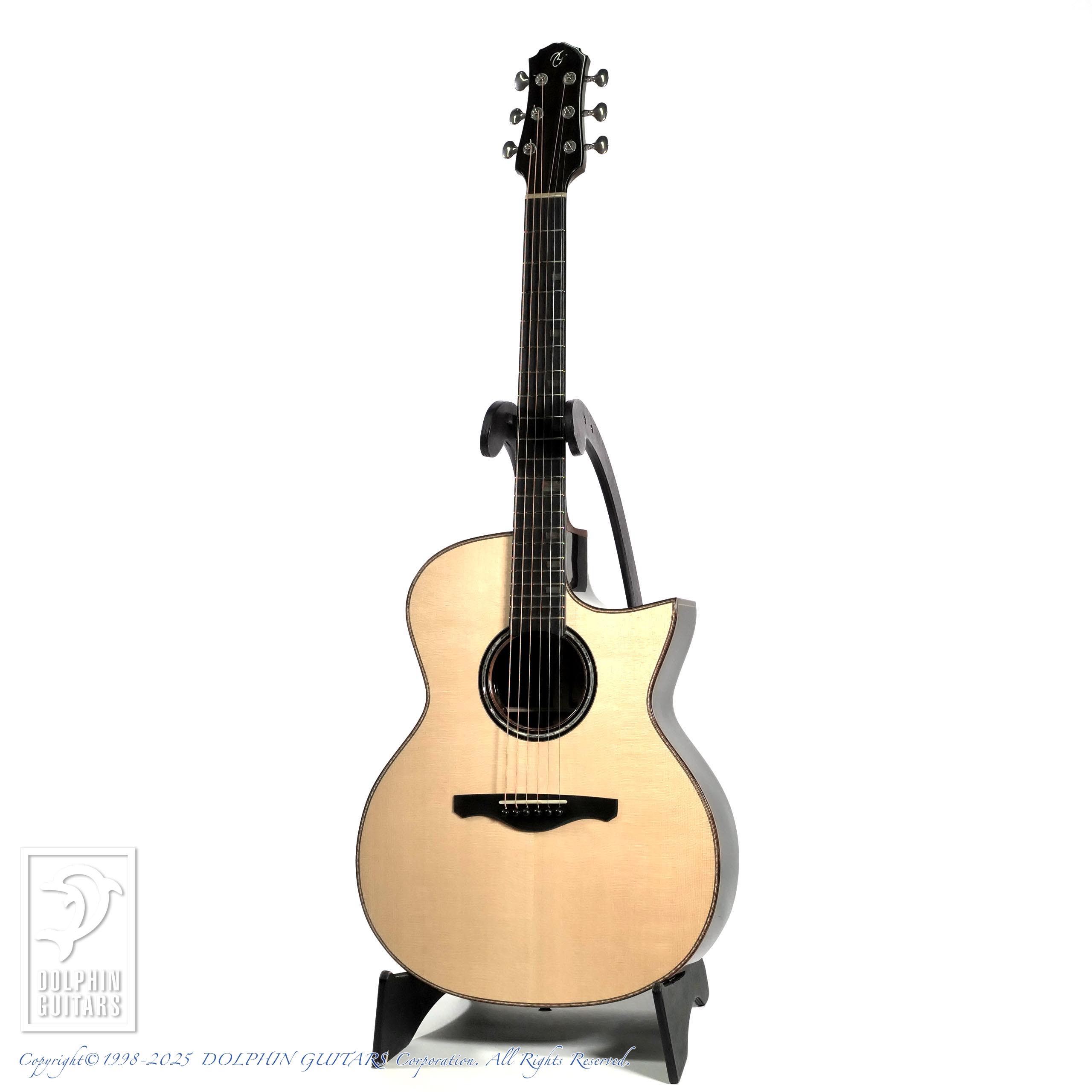 音色は繊細かつ芯のある美しい響きで、フィンガーピッキングにおいては極上のレスポンスを発揮します。イタリアンスプルースの柔らかで透明感あるトーンに、ハカランダの艶と重厚な低音が加わり、奥行きのある豊かなサウンドを味わえます。また、深いカッタウェイ仕様により、ハイポジションでの演奏性も申し分なく、ジャンルを問わず自在な表現を可能にします。