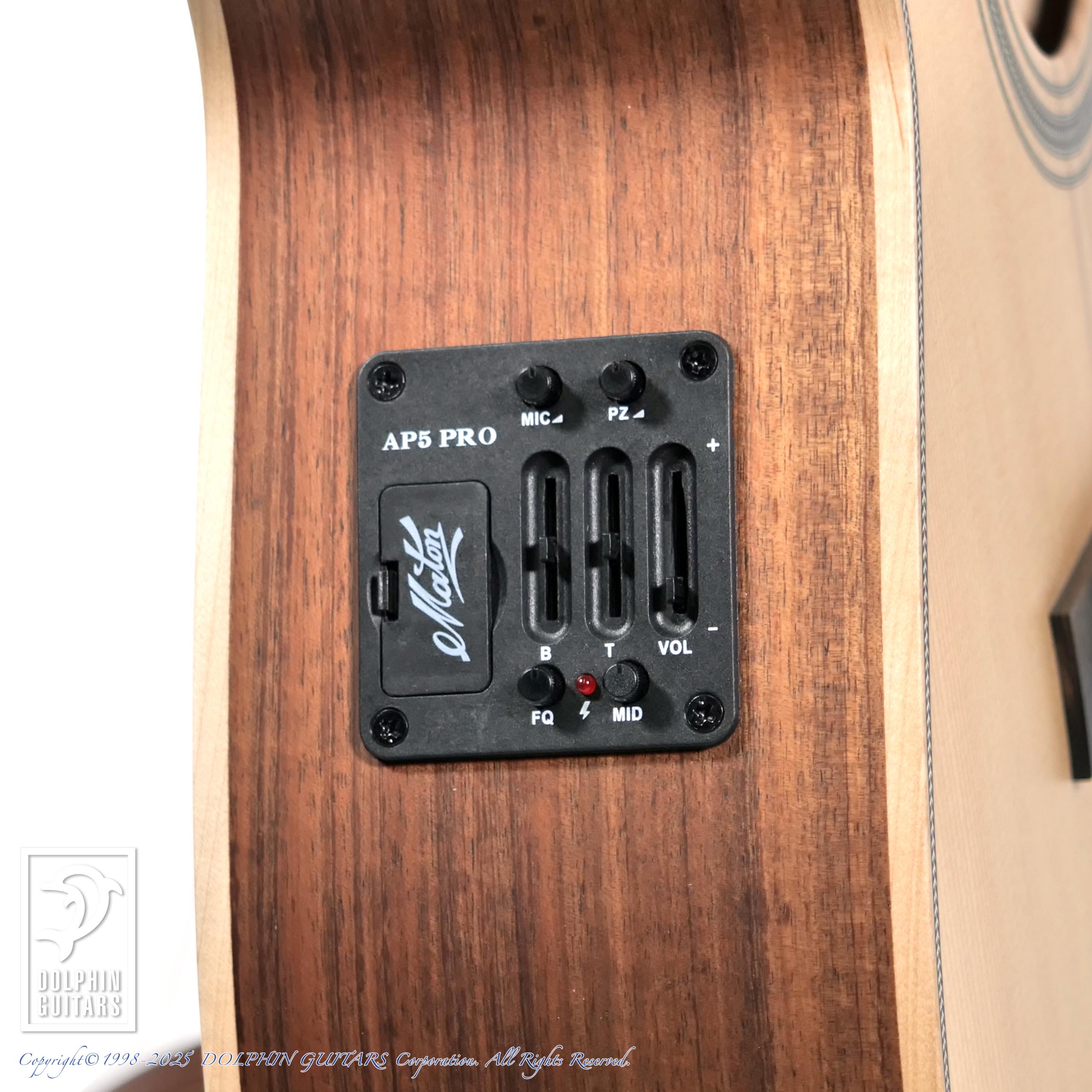 搭載されたAP5pro・ピックアップ・システムは、オリジナルのアンダーサドル・PUにコンデンサーマイクを併用する事により、奥行きのある音域と抜群なエアー感に加え、ボディー・ヒット音も余すことなくアウトプットします。また、高い出力を持つプリアンプを内蔵しておりますので、外部プリアンプ等を使用せずとも、そのままプラグインしていただければ極上のサウンドをお楽しみいただけます。PUとマイクVolは完全に独立しており、手元での出力バランス調整が可能ですのでお好みや現場に合わせてご使用下さい。