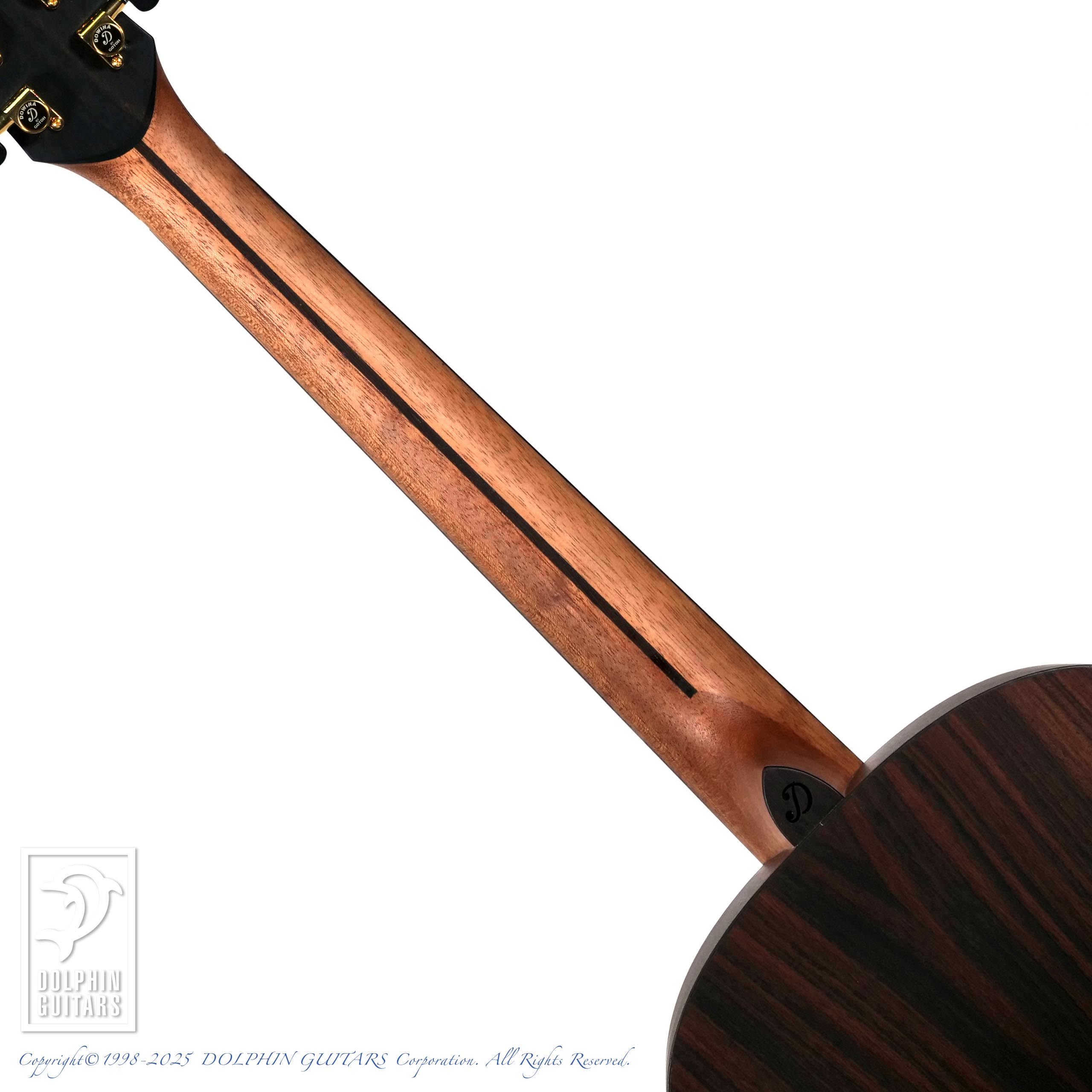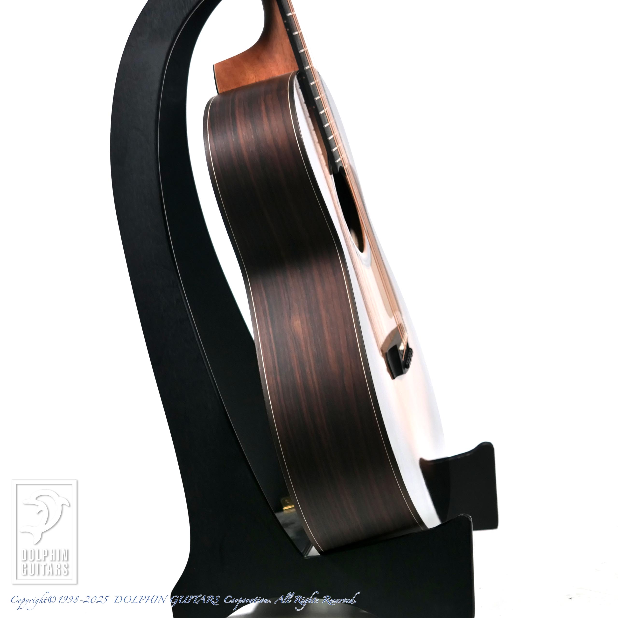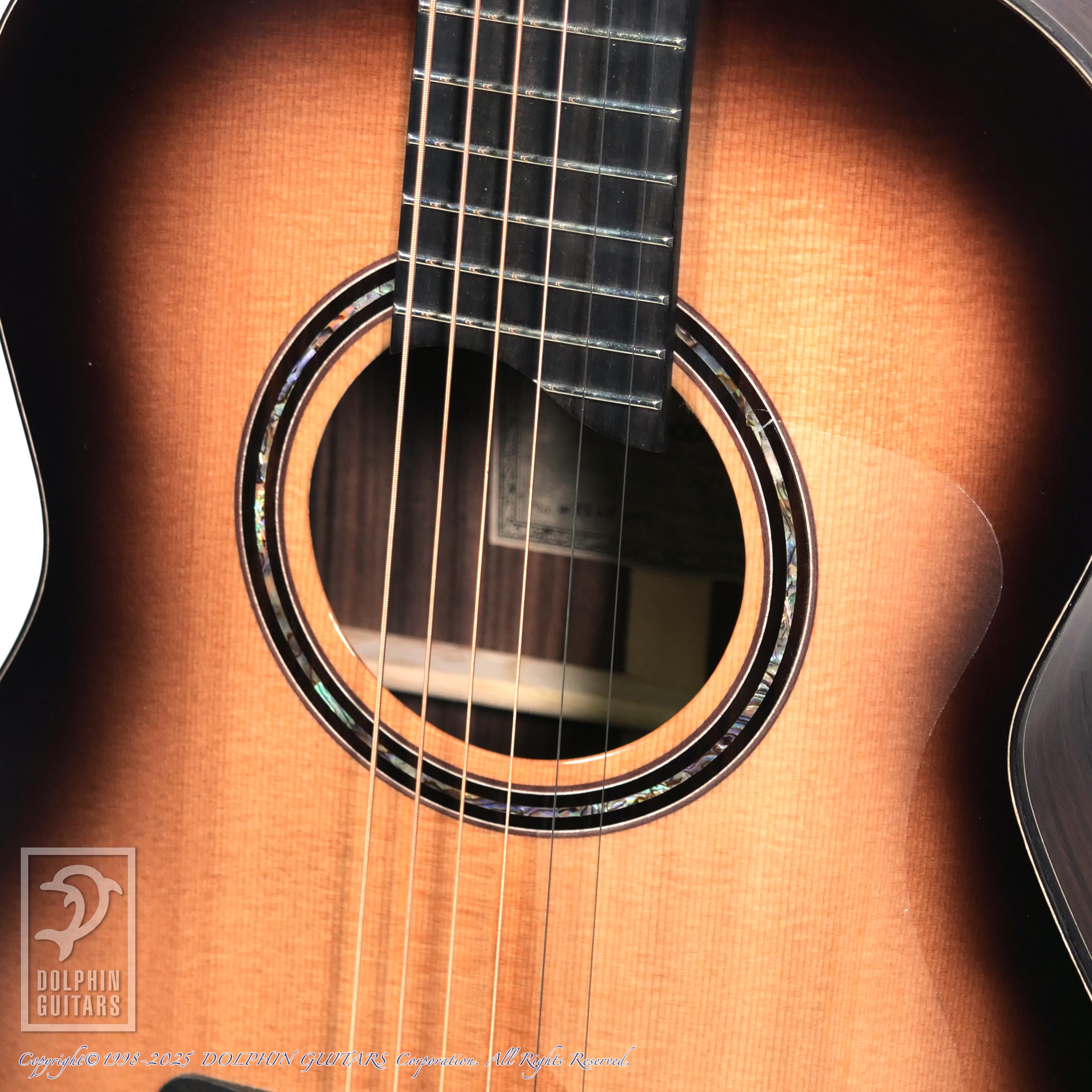 オールド・ストックのシトカ・スプルース材をトップに、インディアン・ローズウッドを組合せたボディ、さらに指板やブリッジ、ヘッド表のみならずヘッド裏までエボニー材を採用した木材へのこだわりも随所に見られる1本で、独特のサンバーストも手作りならではの味のあるフィニッシュです。