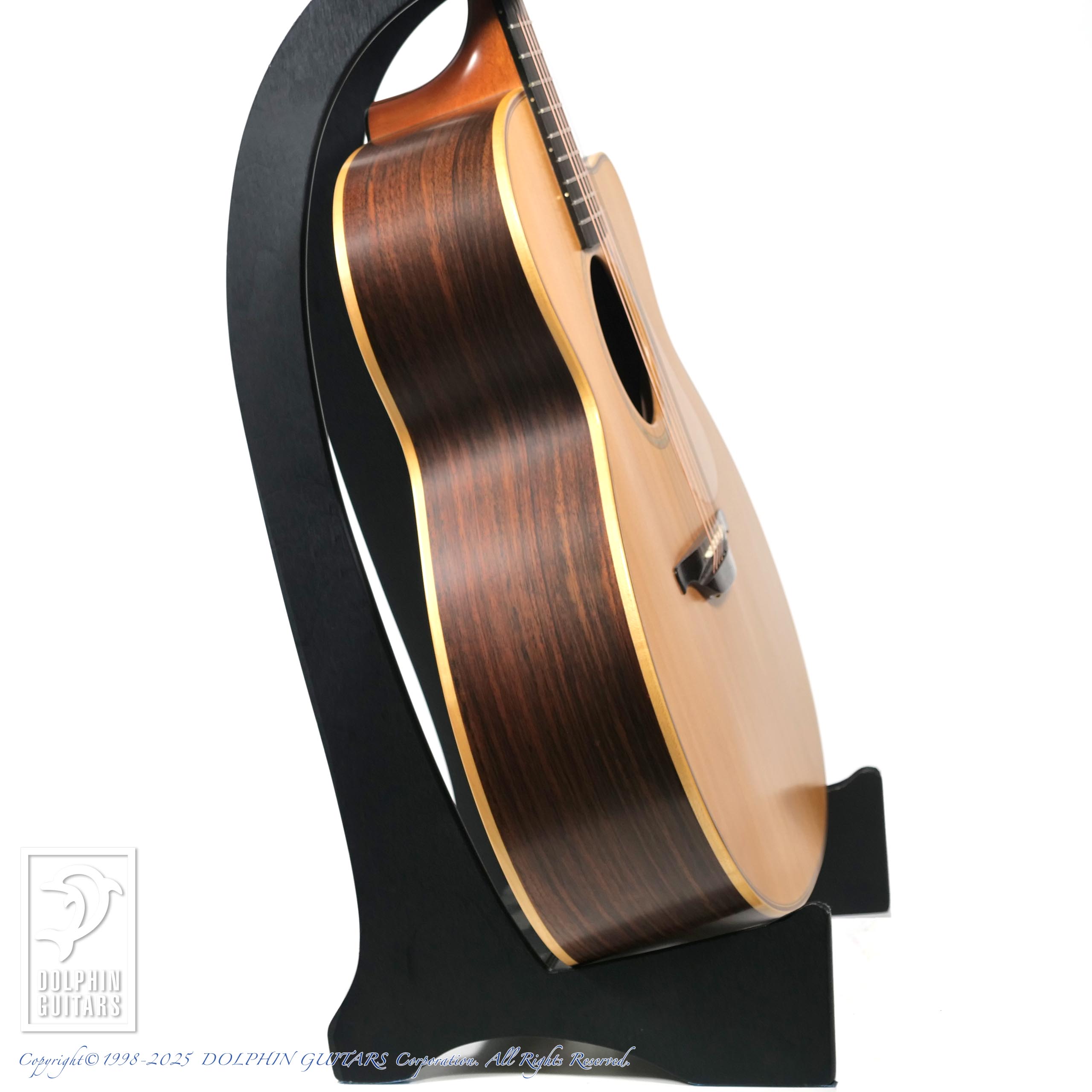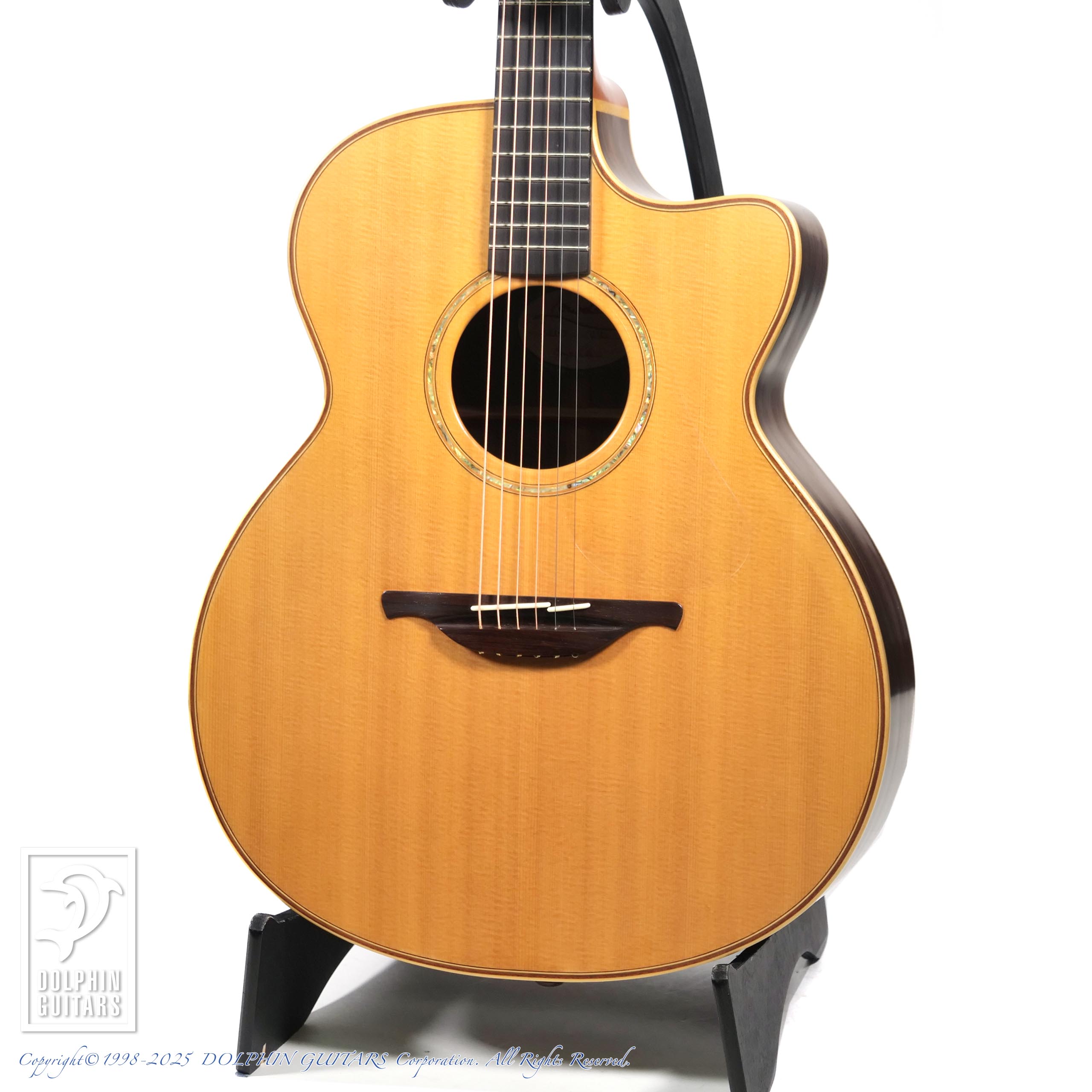 ジャンボボディをさらに強調する迫力ある響き、インディアンローズの深みがマッチして圧倒的な存在感を放つサウンドです。ナチュラルリヴァーブを感じさせる倍音成分の豊かさ、適度に乾いたトーン、ロングサスティーンなど素晴らしい表現力の個体です。