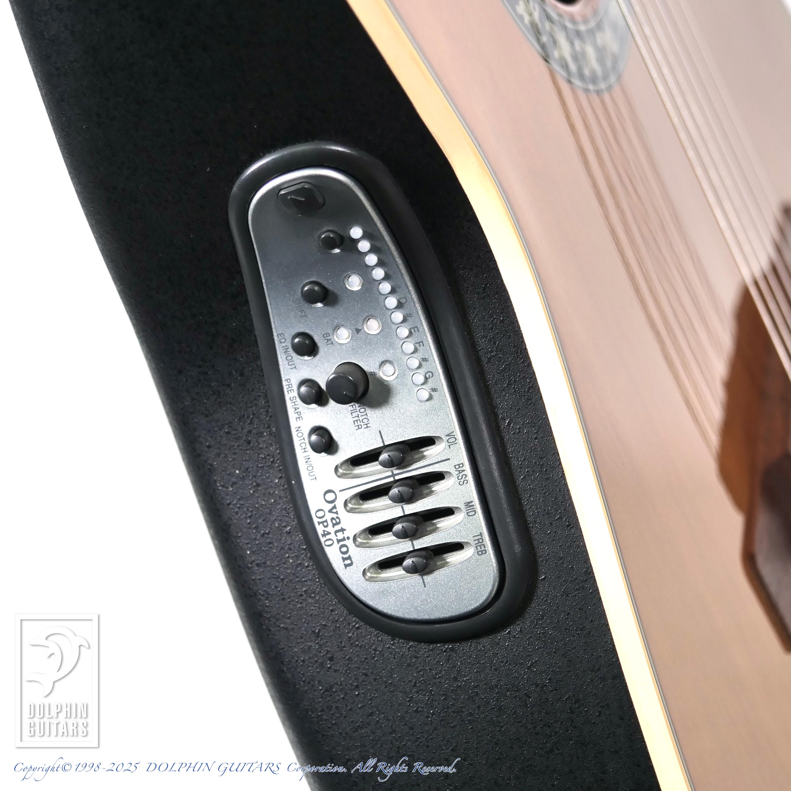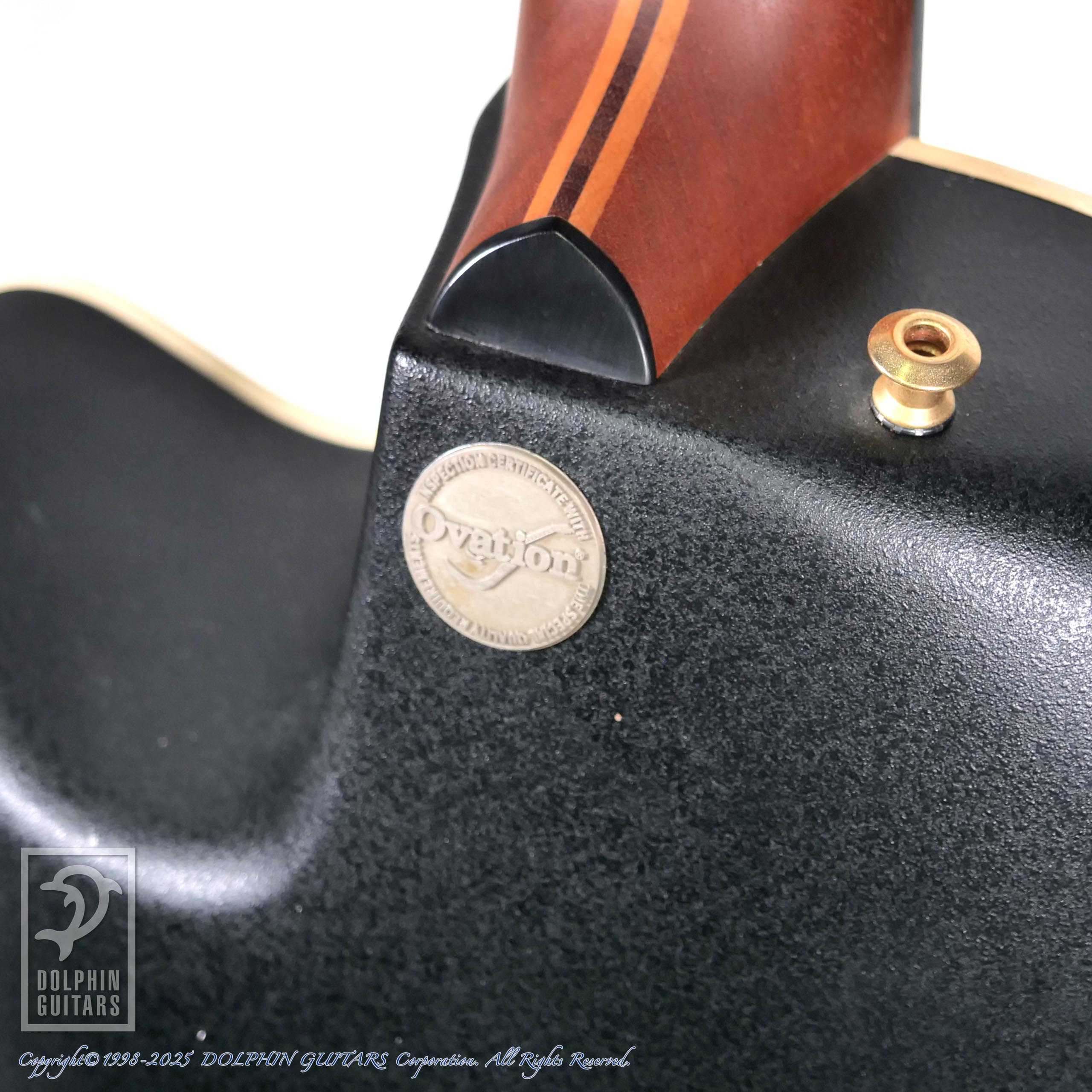 一弦側ブリッジ下に弦飛びキズがございますが、その他目立つキズはほとんどなく、全体的には綺麗な状態での入荷です。演奏面のコンディションは良好です。電装系は若干ハムノイズが出ているのと、EQセクションにややガリがございます。この時代のオベーションは電装系のメーカーサポートが受けられませんので、予めご了承ください。