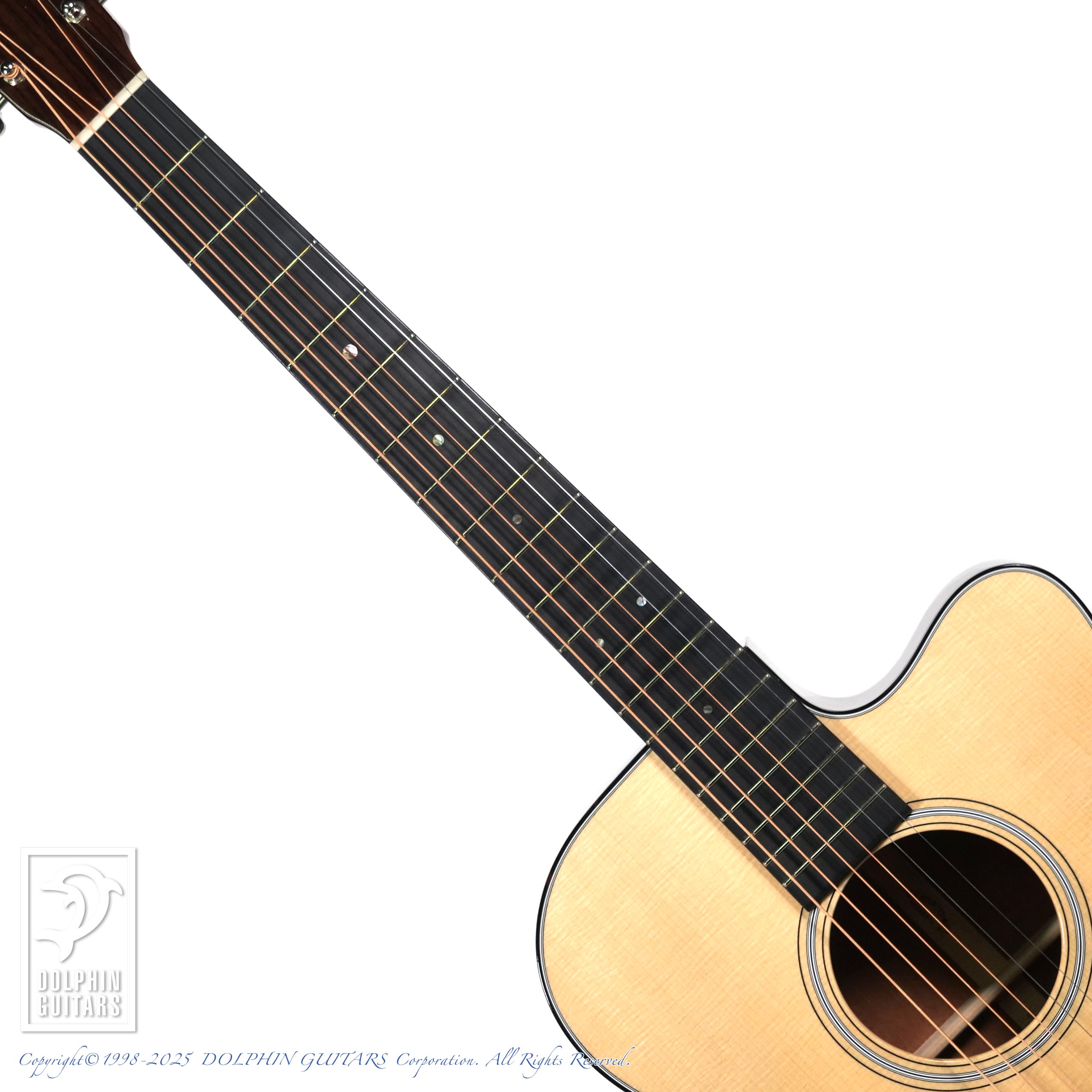 アディロンダックとマホガニーの組み合わせは蜜月の関係と言えます。甘く深い低域と伸びのある高音は、フィンガーピッキングに相性抜群です。OMサイズにしてこのボリューム感は流石の一言。時間を忘れて弾いてしまいそうな心地よさがございます。