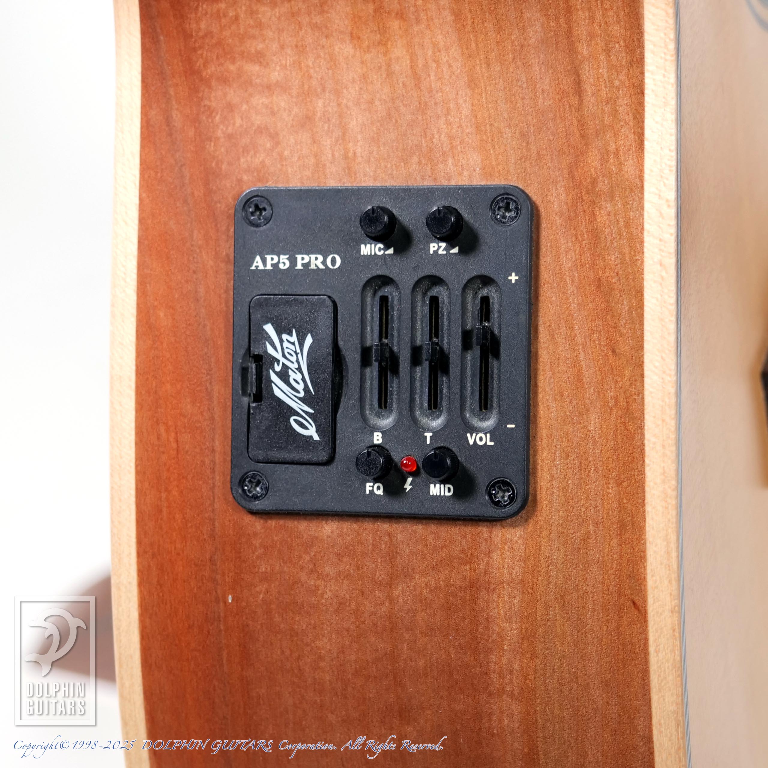 PUシステムはメイトン社オリジナルのAP5 Pro。アンダーサドルPUとコンデンサーマイクを併用する事により、エアー感に加えボディヒット音もアウトプットし、リアルなアコースティックサウンドを出力します。
