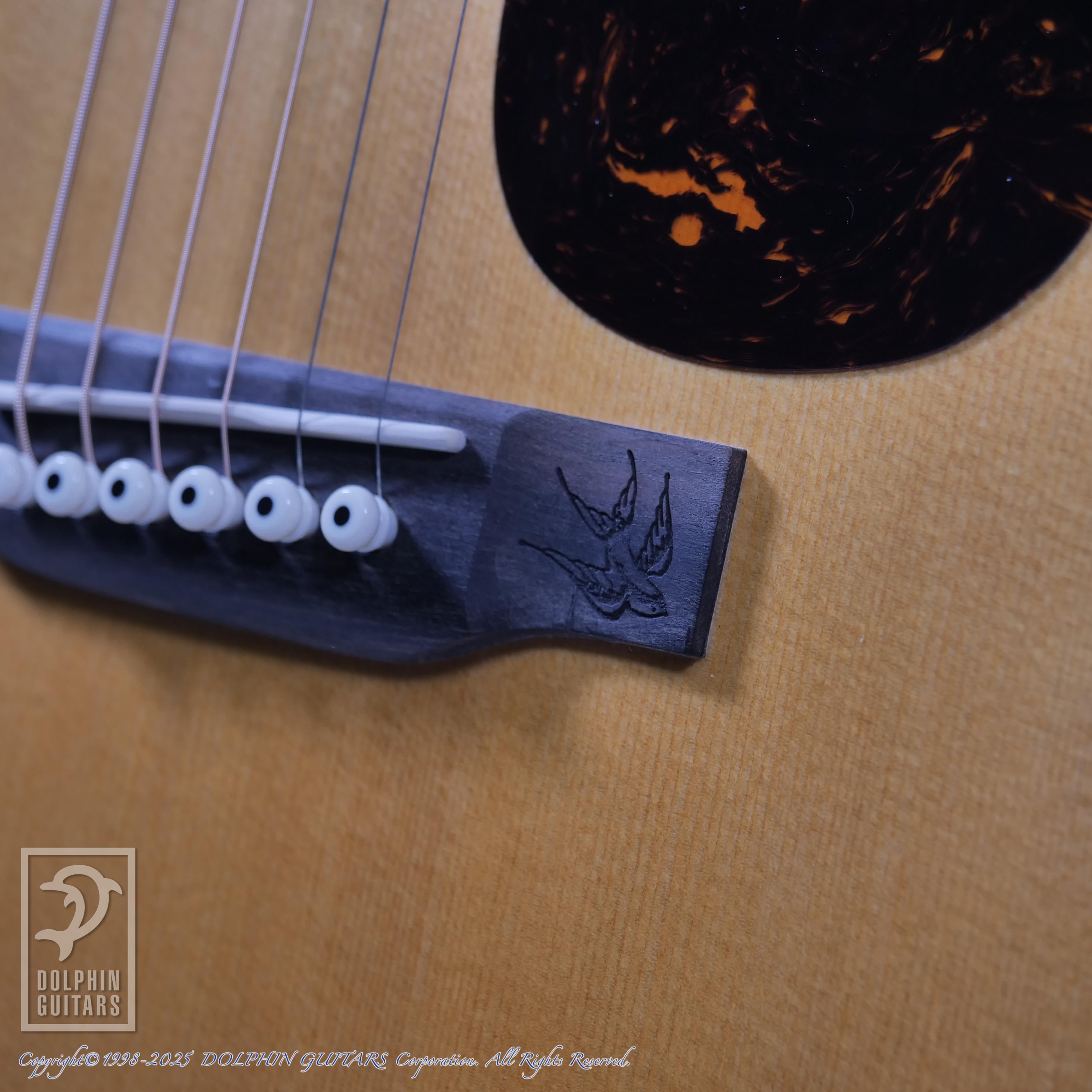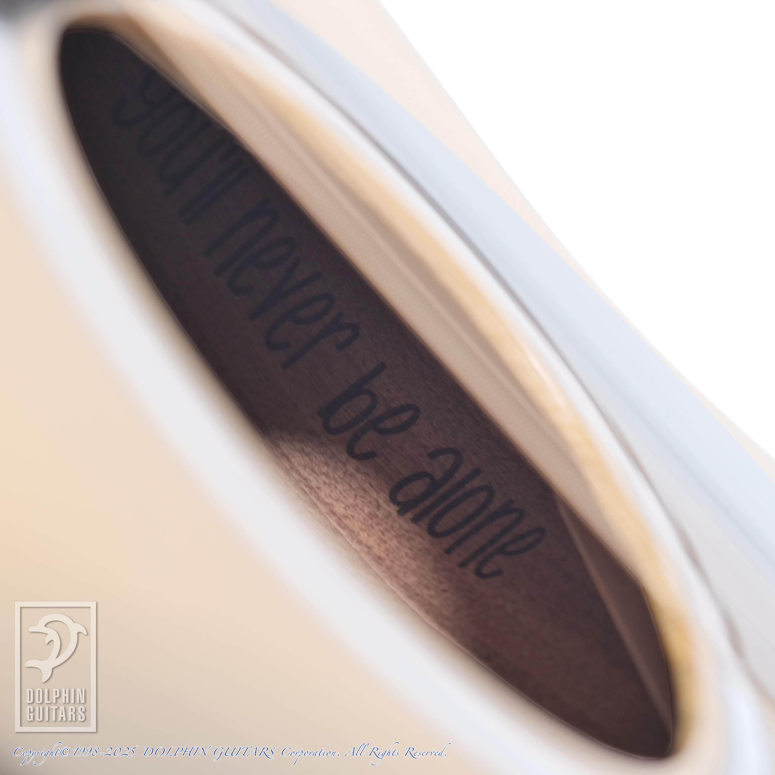 ブリッジ両脇には彼の手にツバメのタトゥーをモチーフとした彫刻が施されています。ボディ内部のメッセージも粋な仕様。