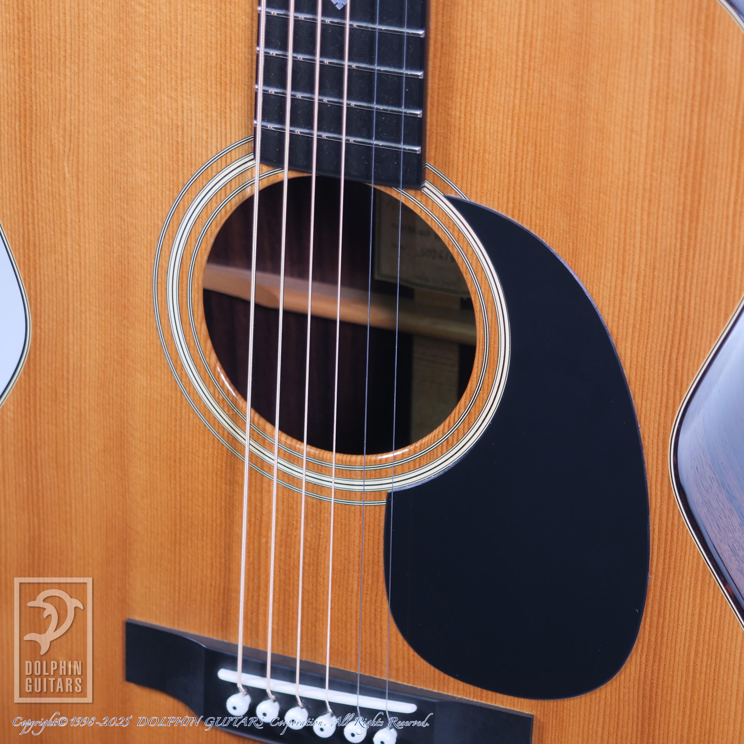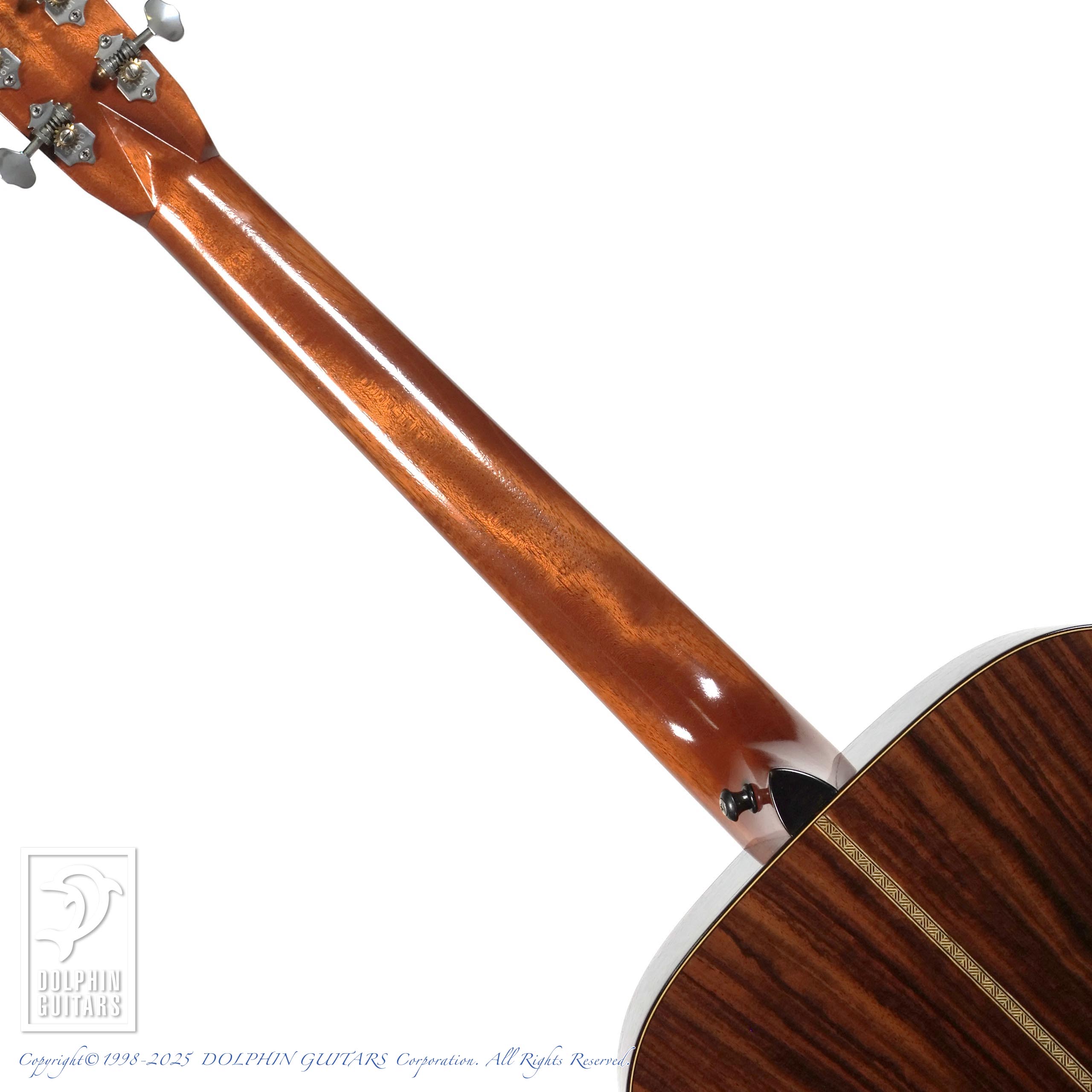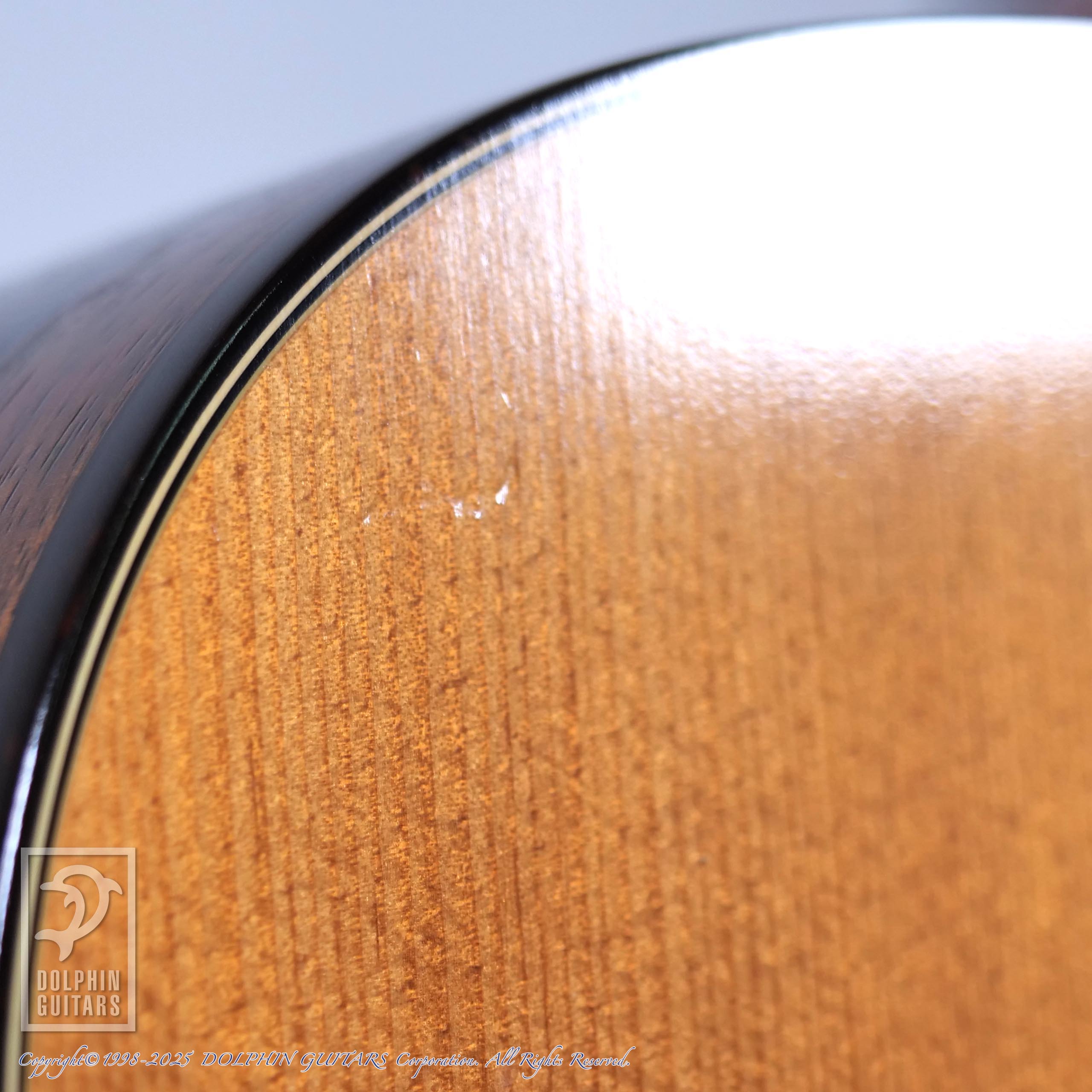 漆塗りモデルの大きな特徴の一つが表面の質感。一見オールドギターにも見えるその質感は、塗膜が非常に薄く形成される漆塗りならではのもの。ボディサイドバックのインディアンローズウッドとネックのアフリカン・マホガニーは導管の一つ一つに沈んだ漆が味わい深い質感を生み出します。ボディトップのシトカスプルースやバインディングの仕上がりも、一般的なポリウレタンやポリエステル、トップラッカーの様なシャープなツヤとは対照的な、手作業ならのあたたかみがあって味のある質感です。