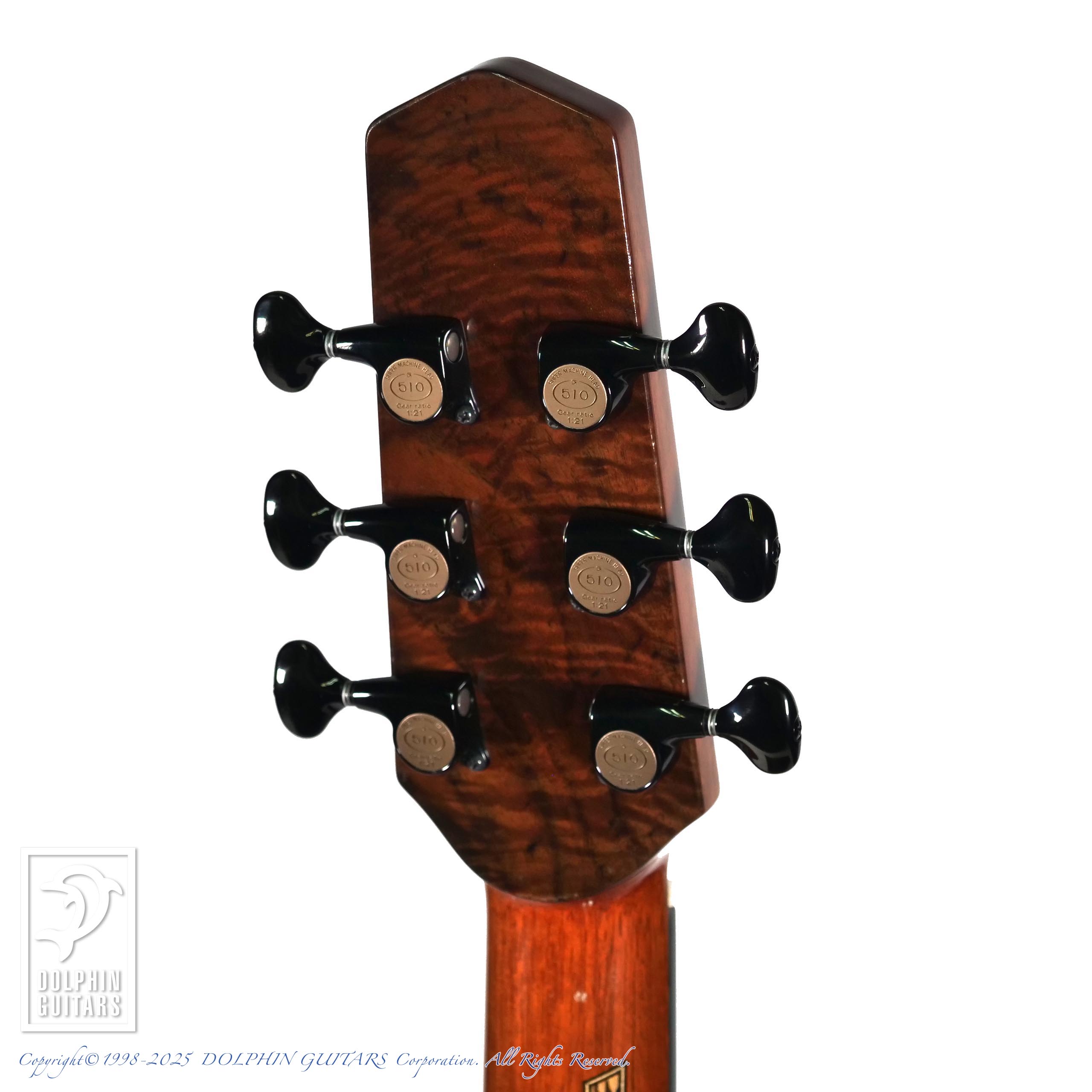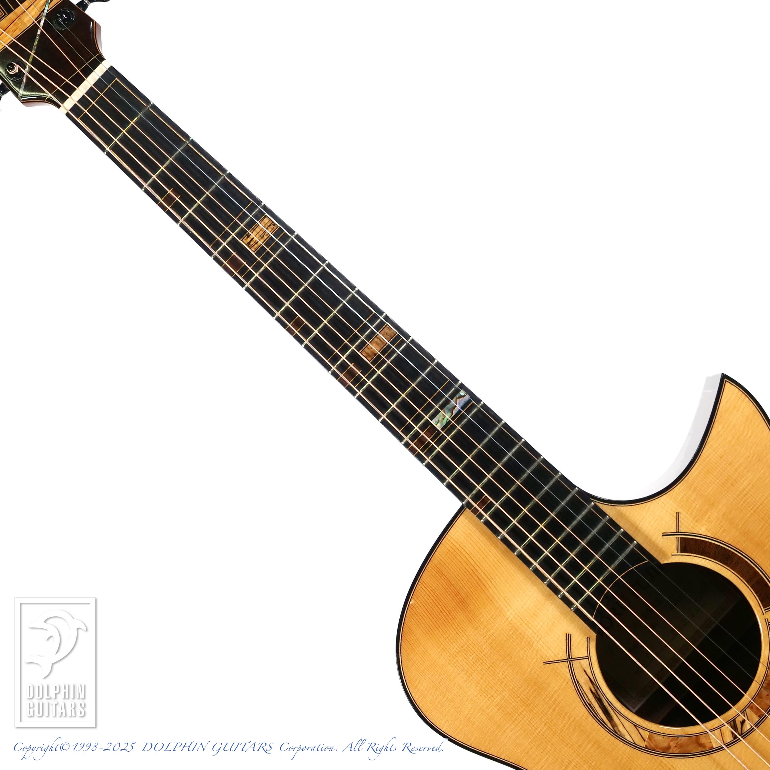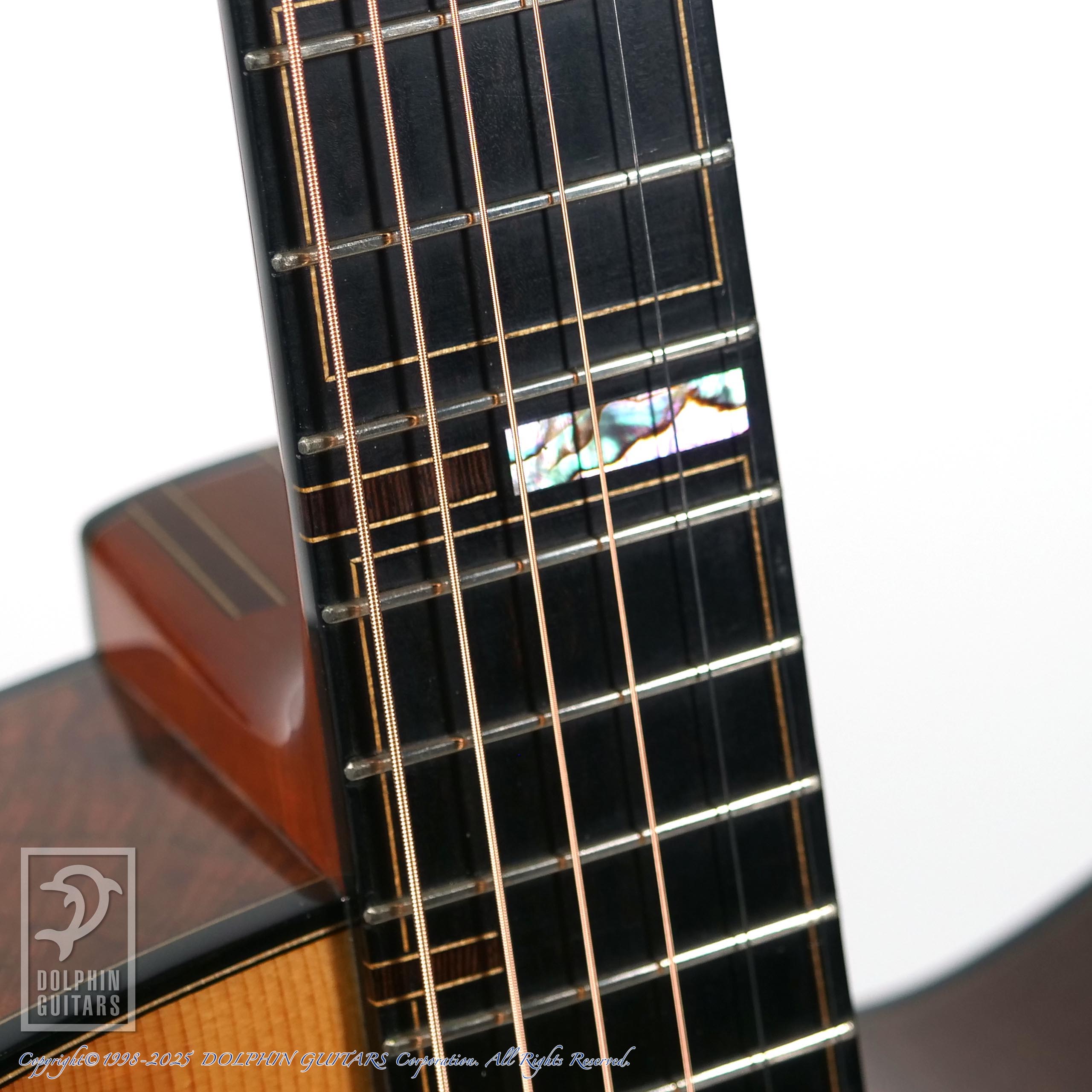 ヘッド、指板、ロゼッタまで、凝った装飾が目を引くモデル。モダンなフィンガースタイルギターを意識してか、OMシェイプのボディはボトム部で112mmのディープ仕様となっております。