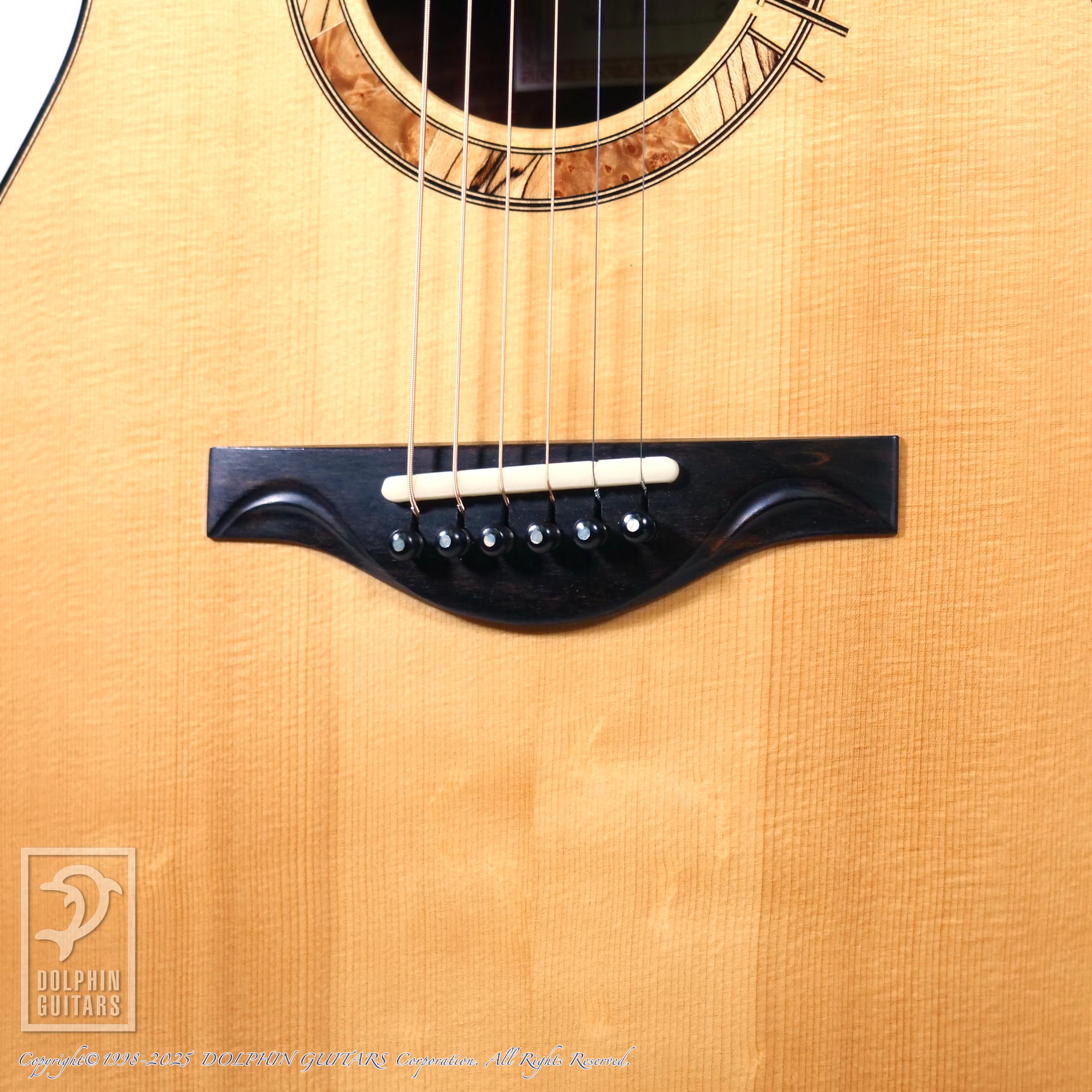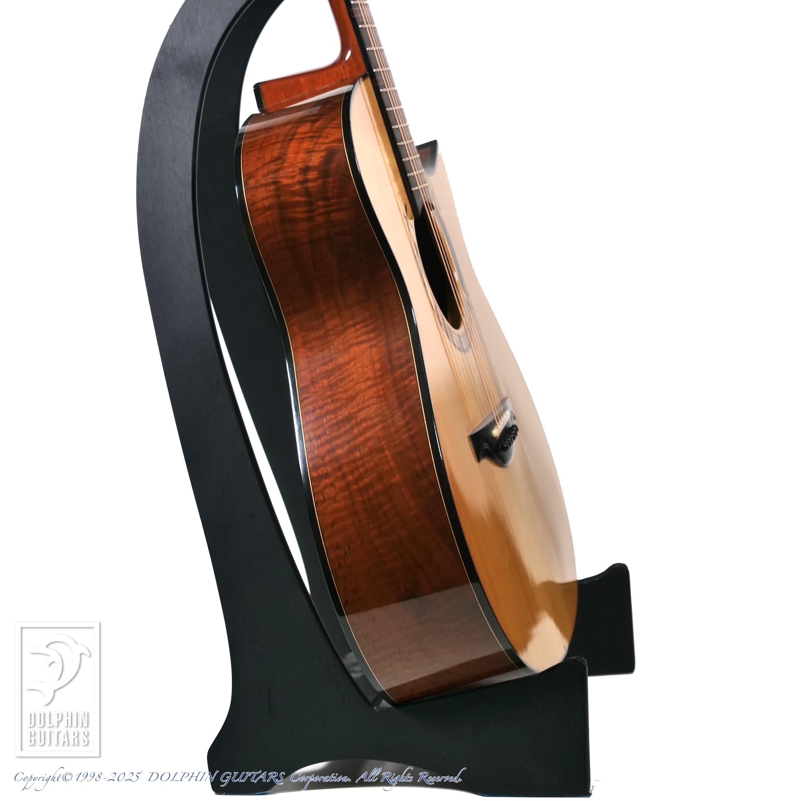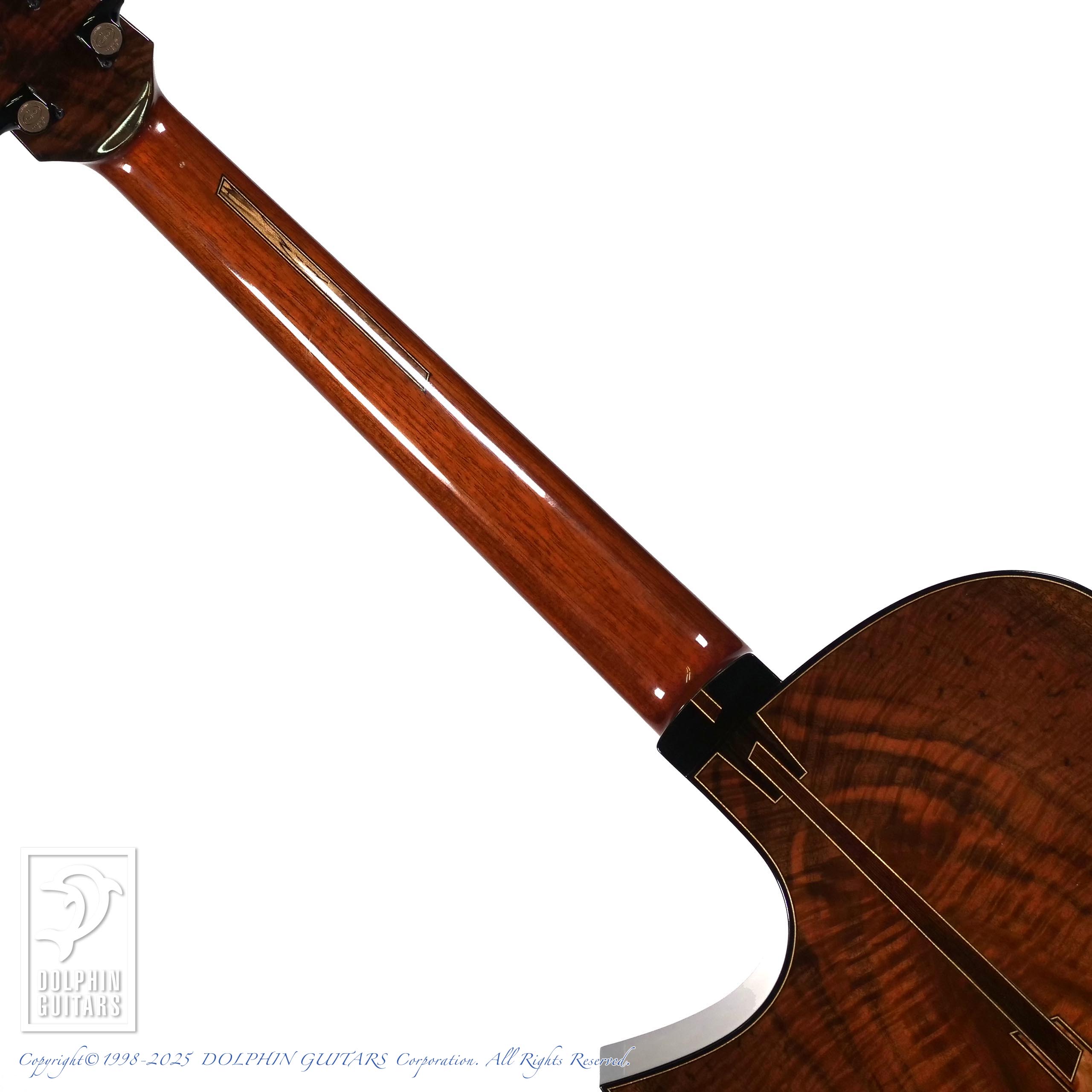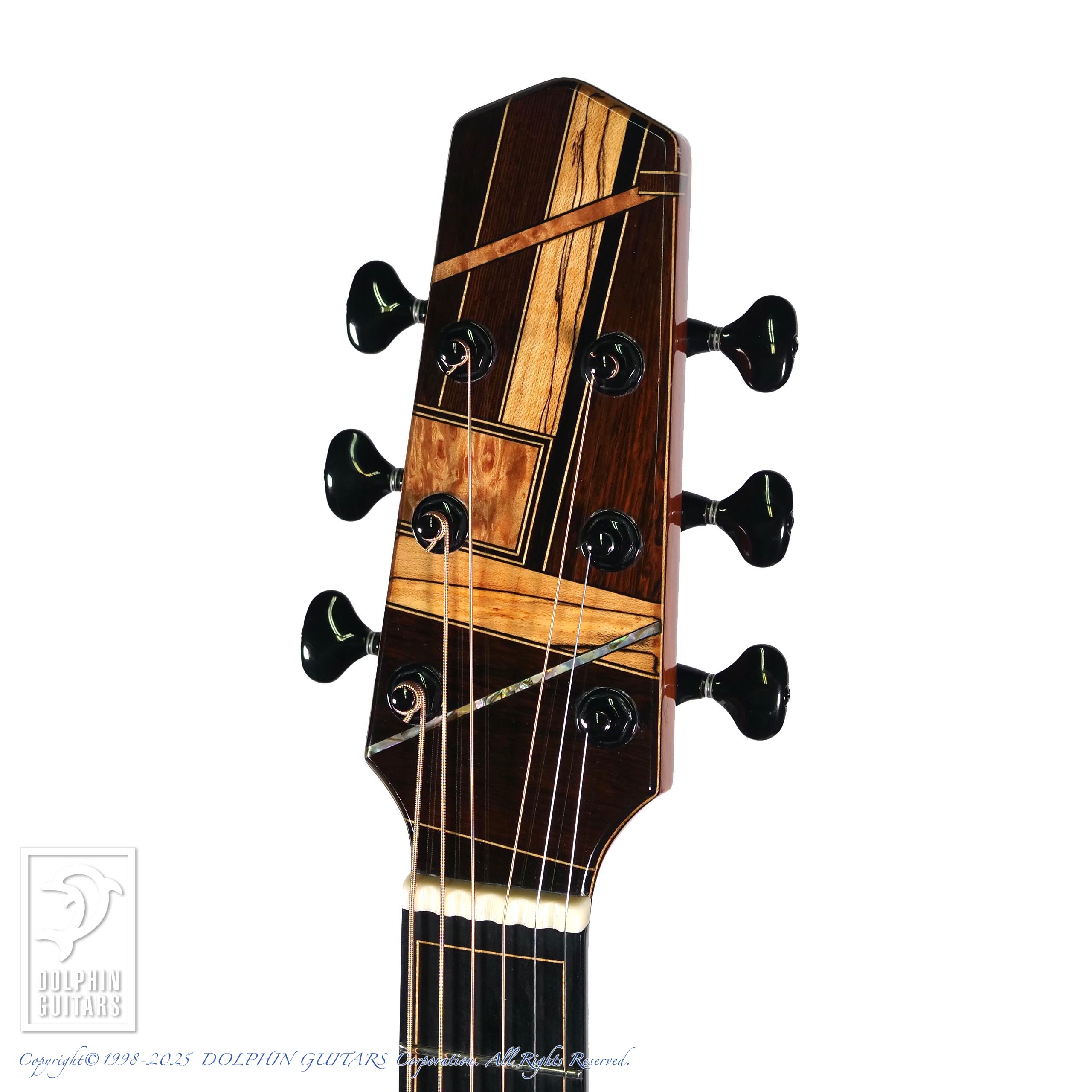 ヘッド、指板、ロゼッタまで、凝った装飾が目を引くモデル。モダンなフィンガースタイルギターを意識してか、OMシェイプのボディはボトム部で112mmのディープ仕様となっております。