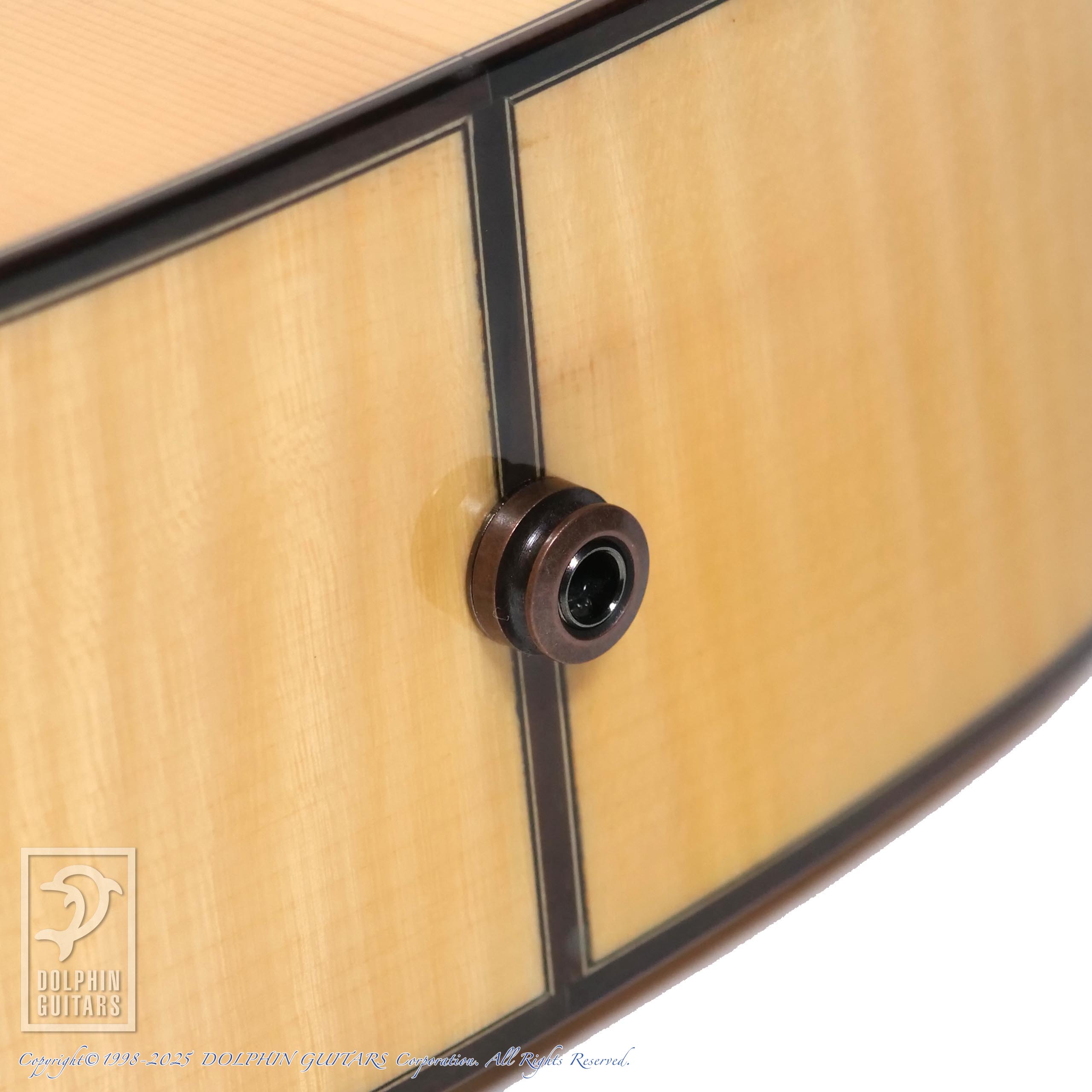 Solista CE SP/MPは通常、サイドにオンボードプリアンプが載っておりますが、こちらはその部分の裏の当て木こそあるものの、加工はエンドジャックのみで当初はB-BANDのピエゾ搭載しておりました。現状はL.R.Baggs製Lyricに載せ替えられており、生音に忠実なライン出力が可能となっております。