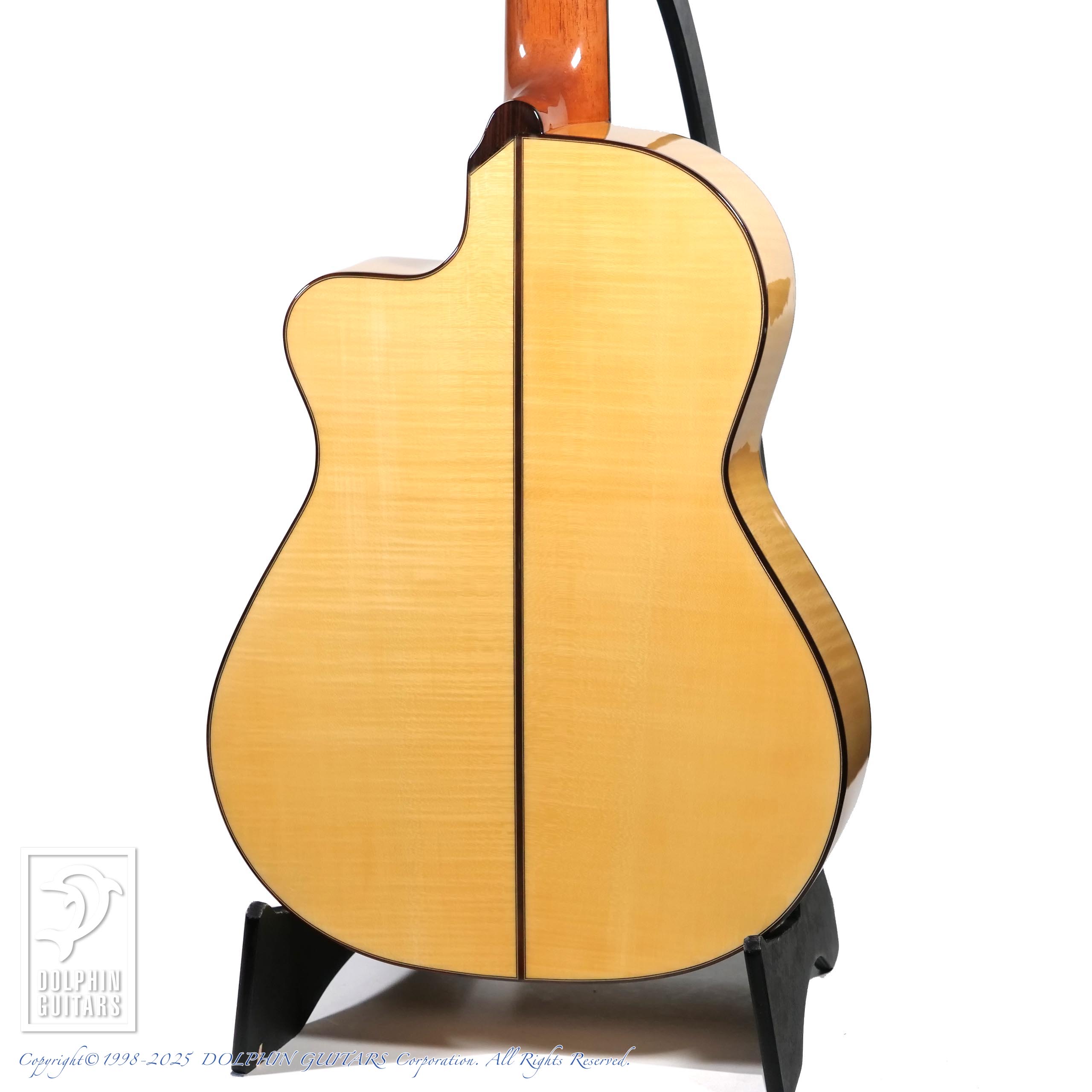 美しいフレイムメイプルを使用したフラメンコタイプのエレガットですが、少しイレギュラー仕様なのか、本器はピックアップの仕様が通常と異なるようです。