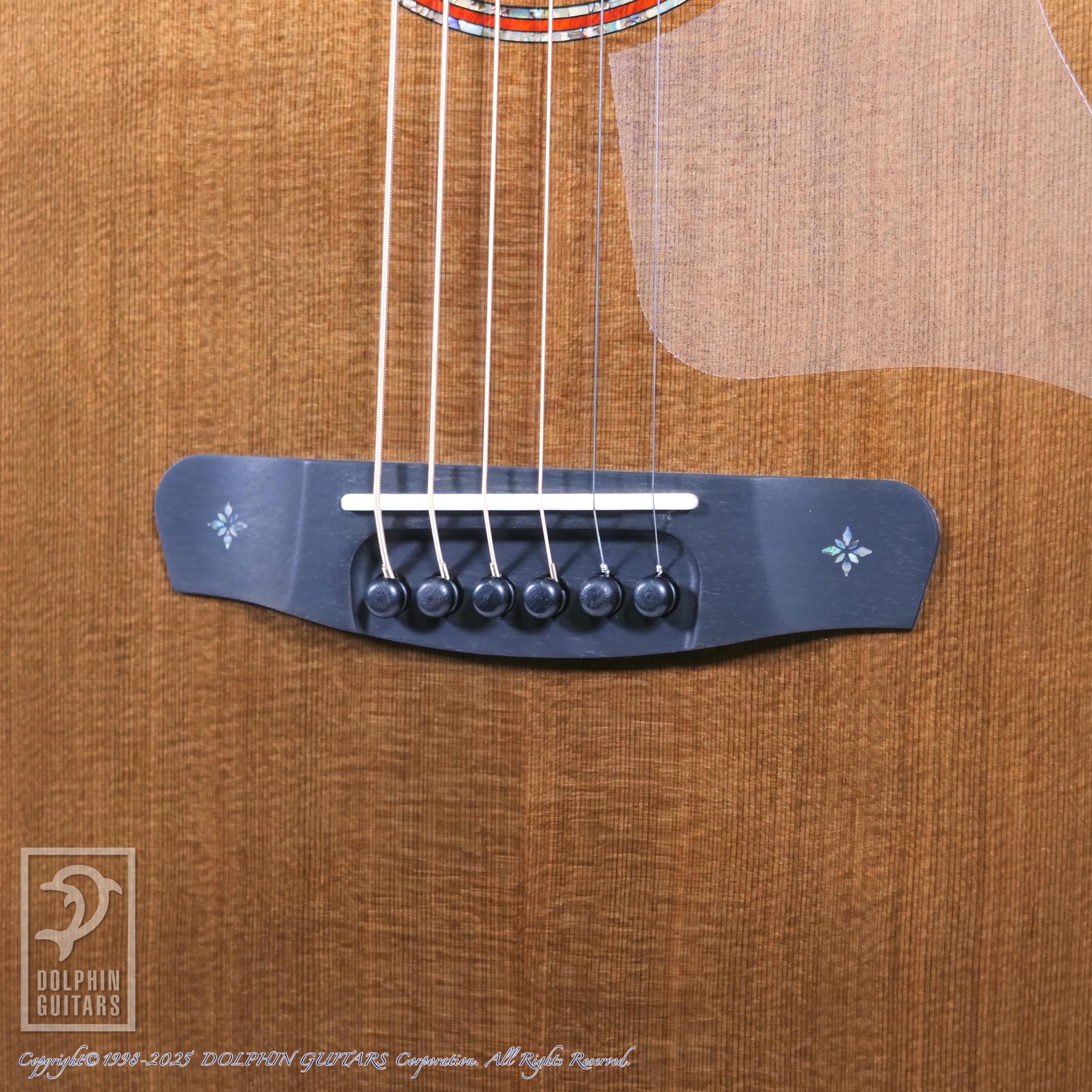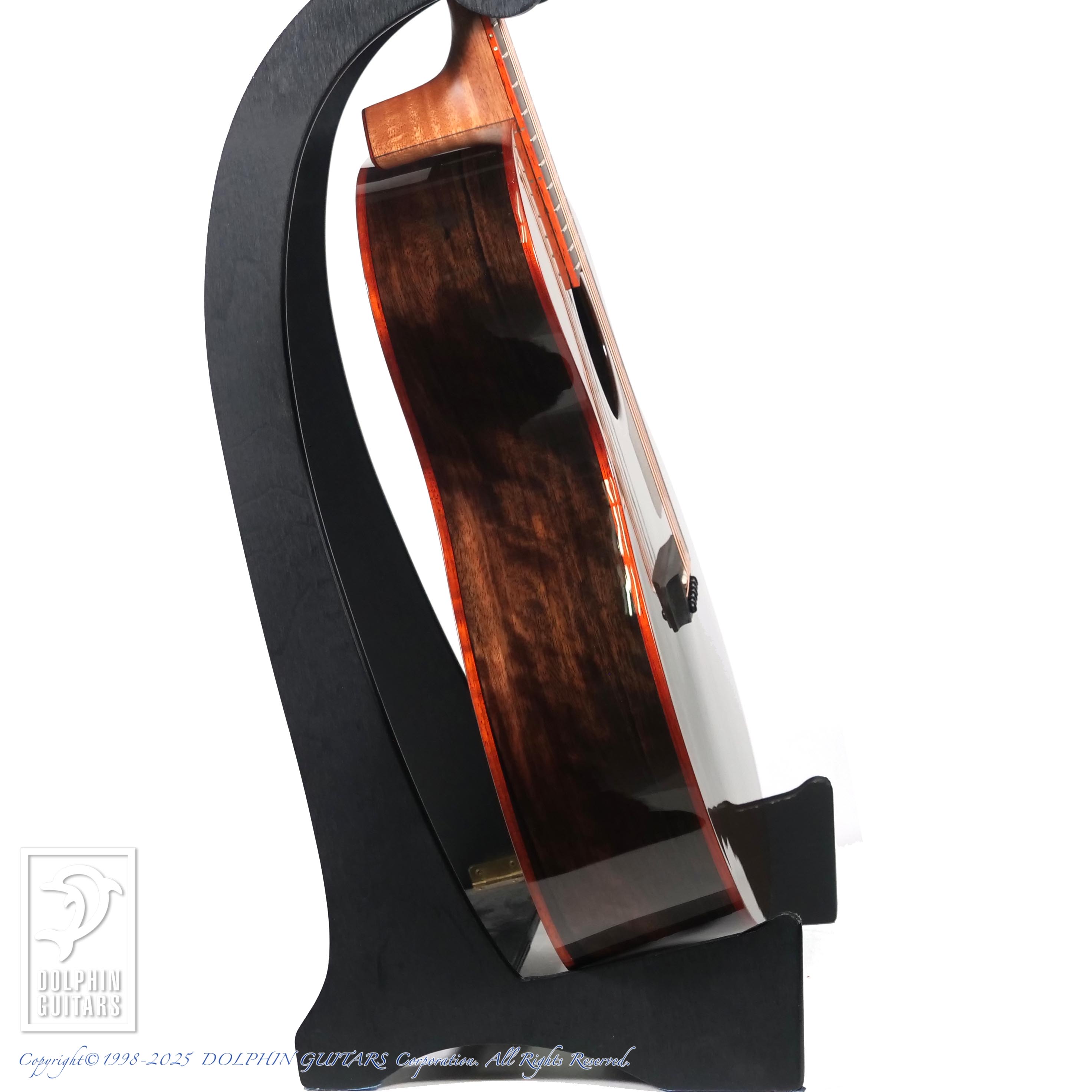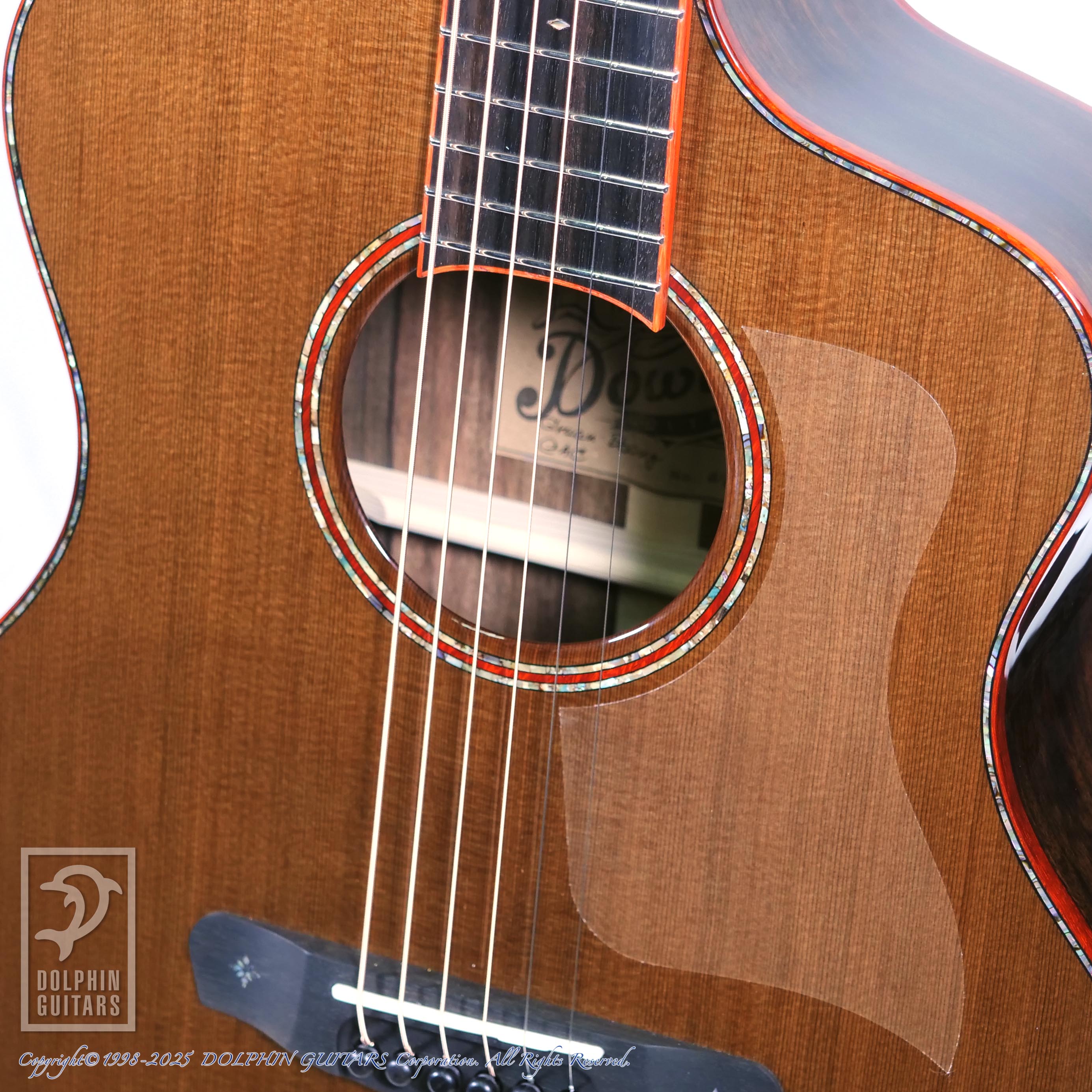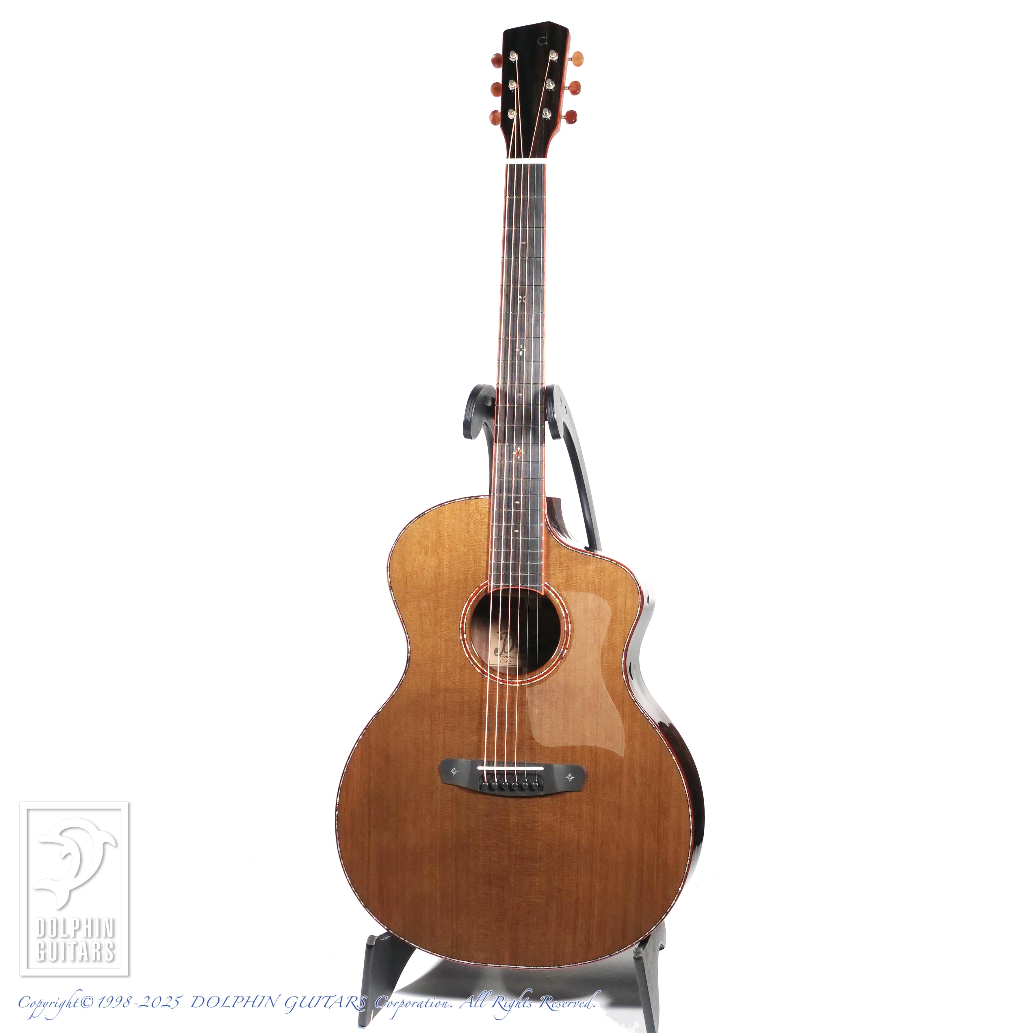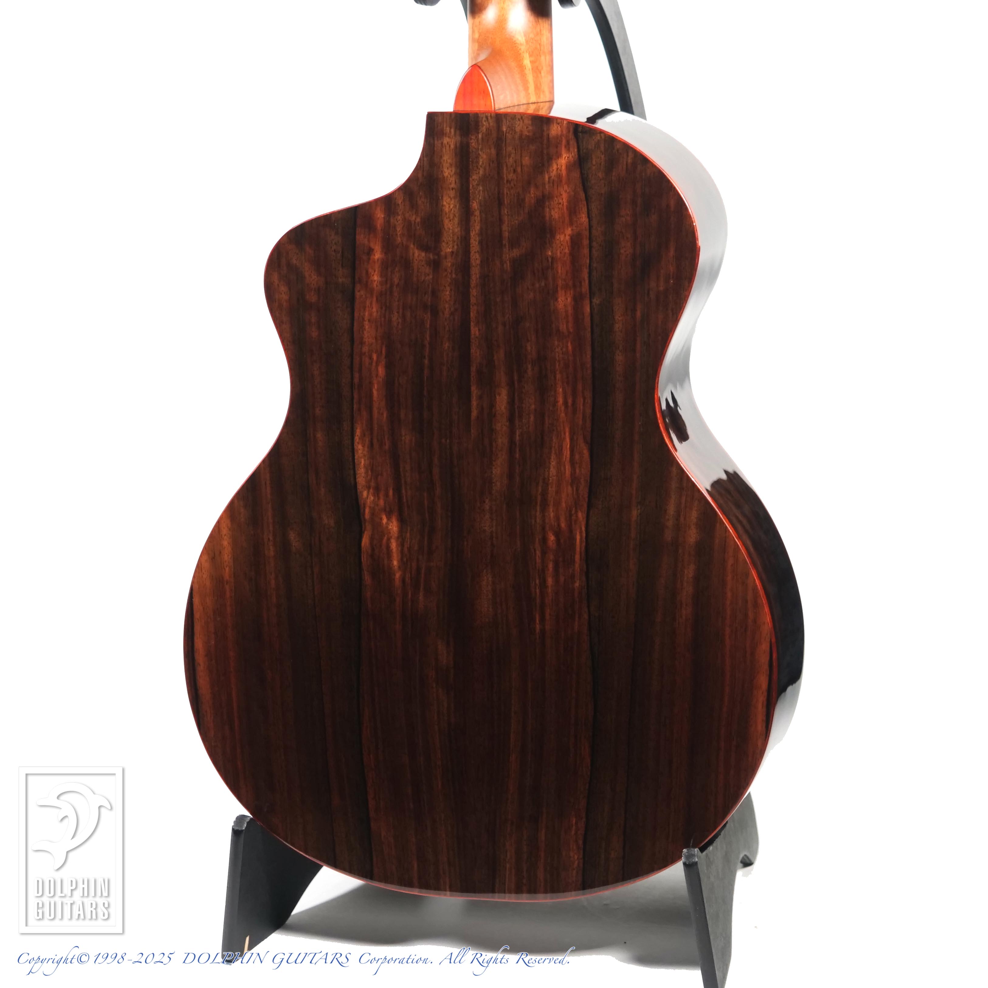 使用されたエキゾチックな木材は落ちついたトーンの外観ですが、パドゥークの赤いバインディングや、細いアバロンのパーフリングが品良く輝き、独特のオーラを放つギターとなっております。