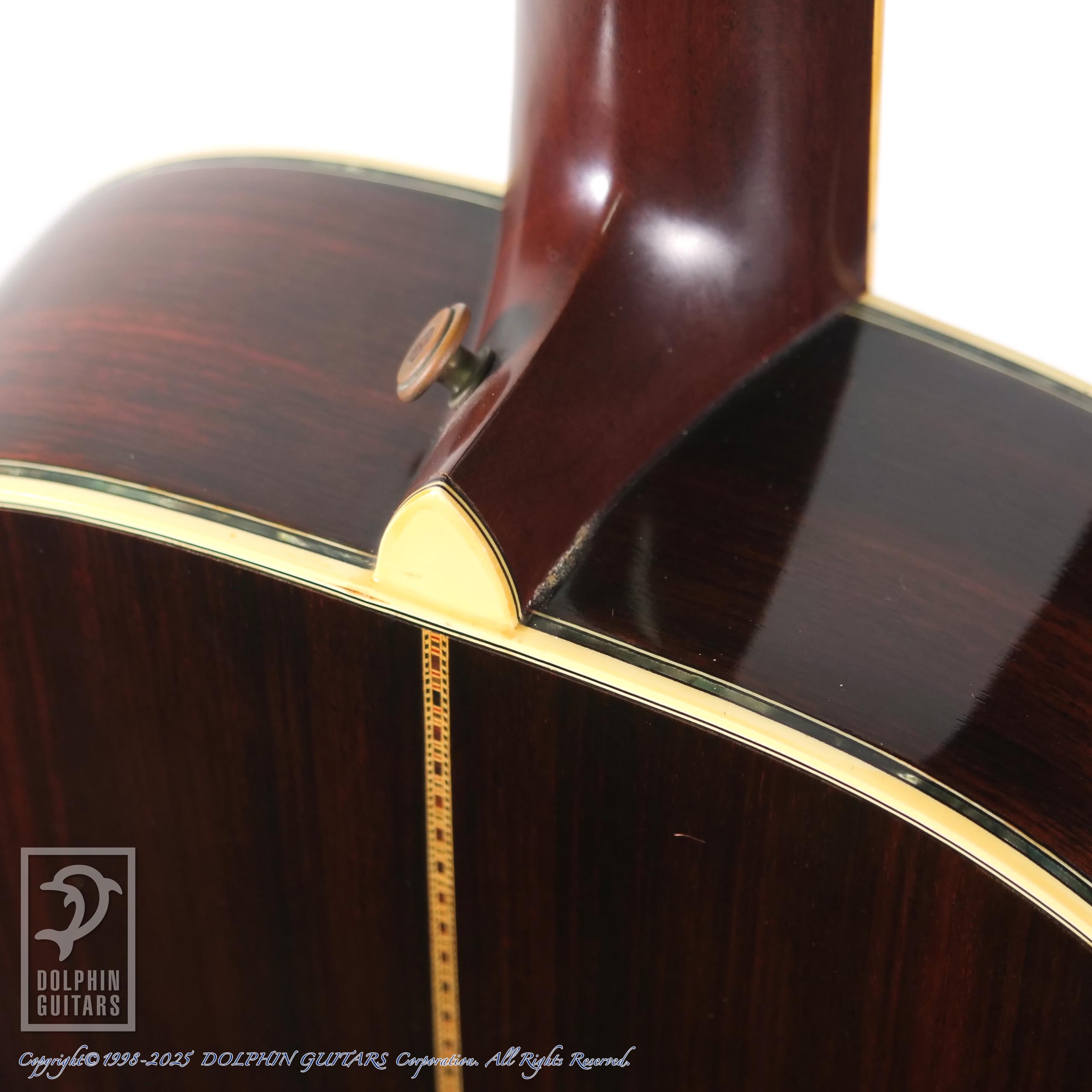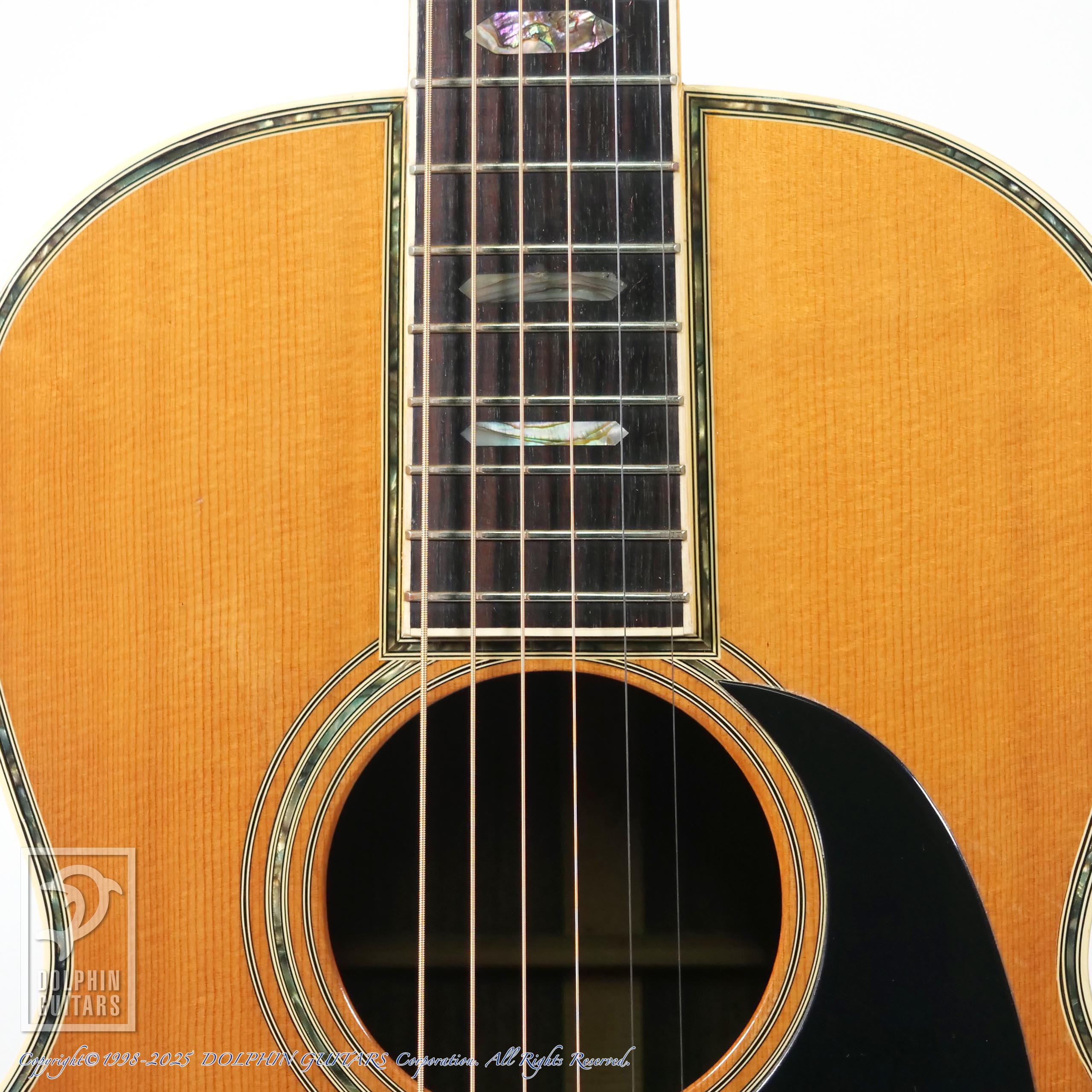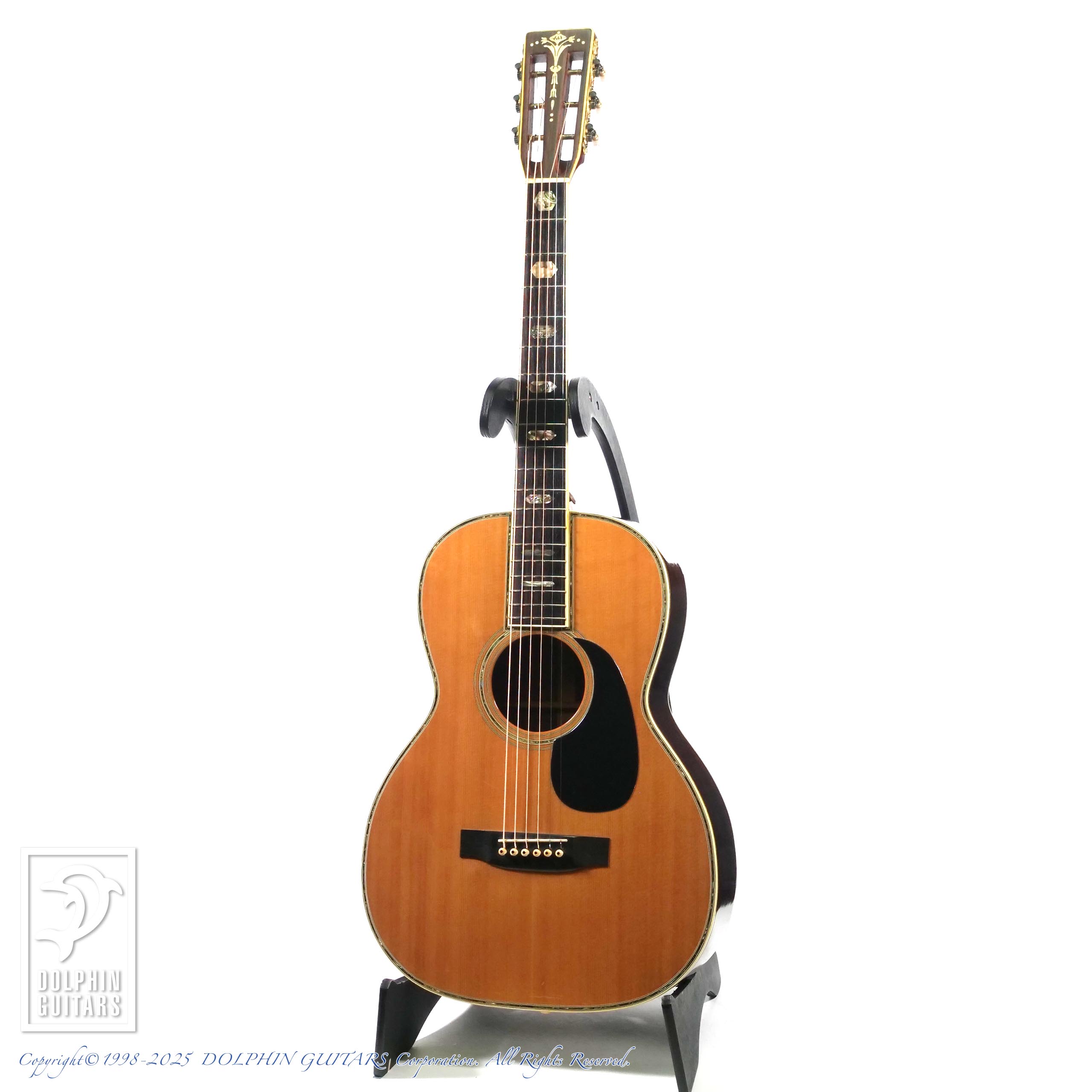言わずもがな、00-45のオマージュ機種で、1970年代製だと思われます。イミテーションではありますが、アバロン風トリム、パーフリング、ヘキサゴンインレイ(こちらは本物です)にブラックピックガードは、まさに70年代の顔つきです。