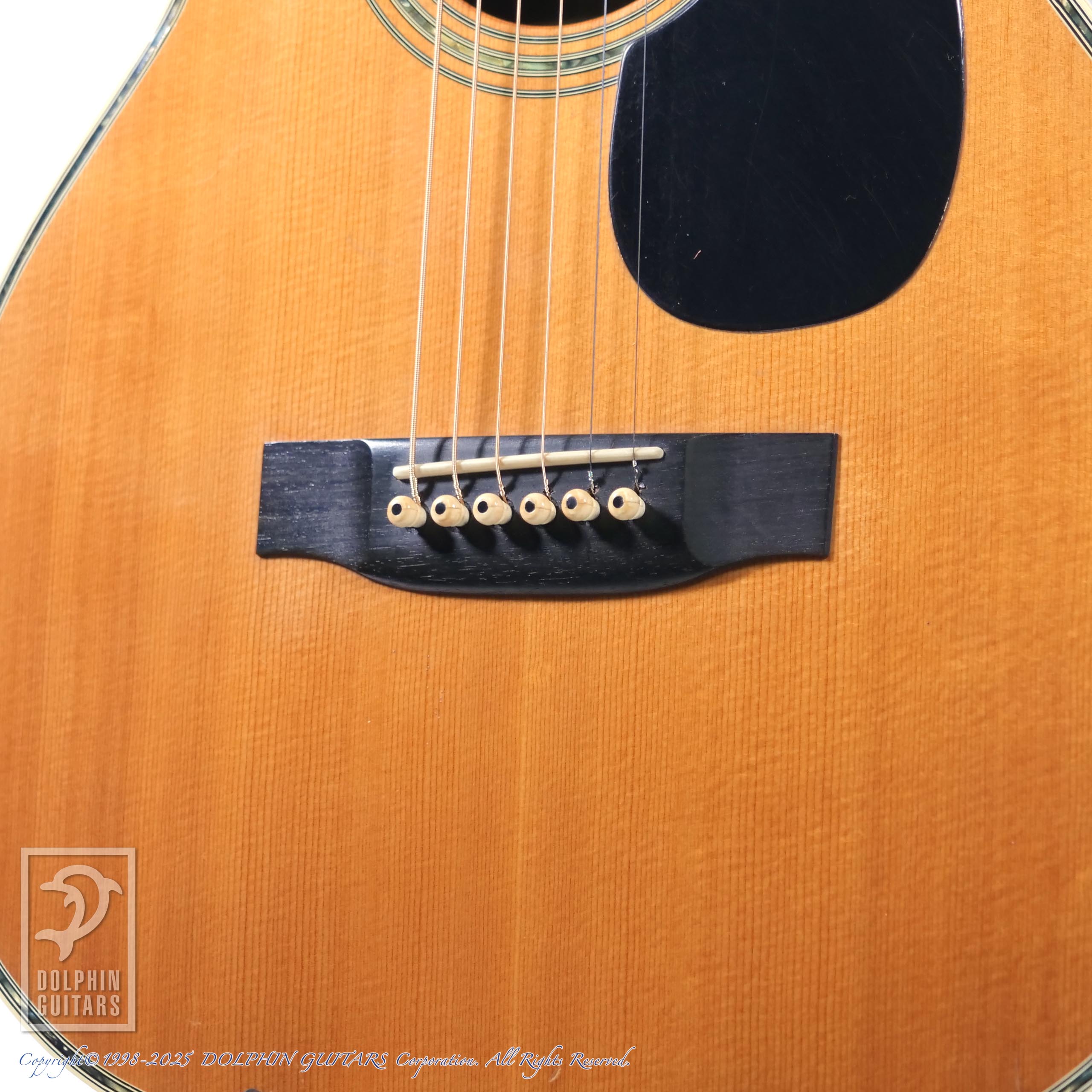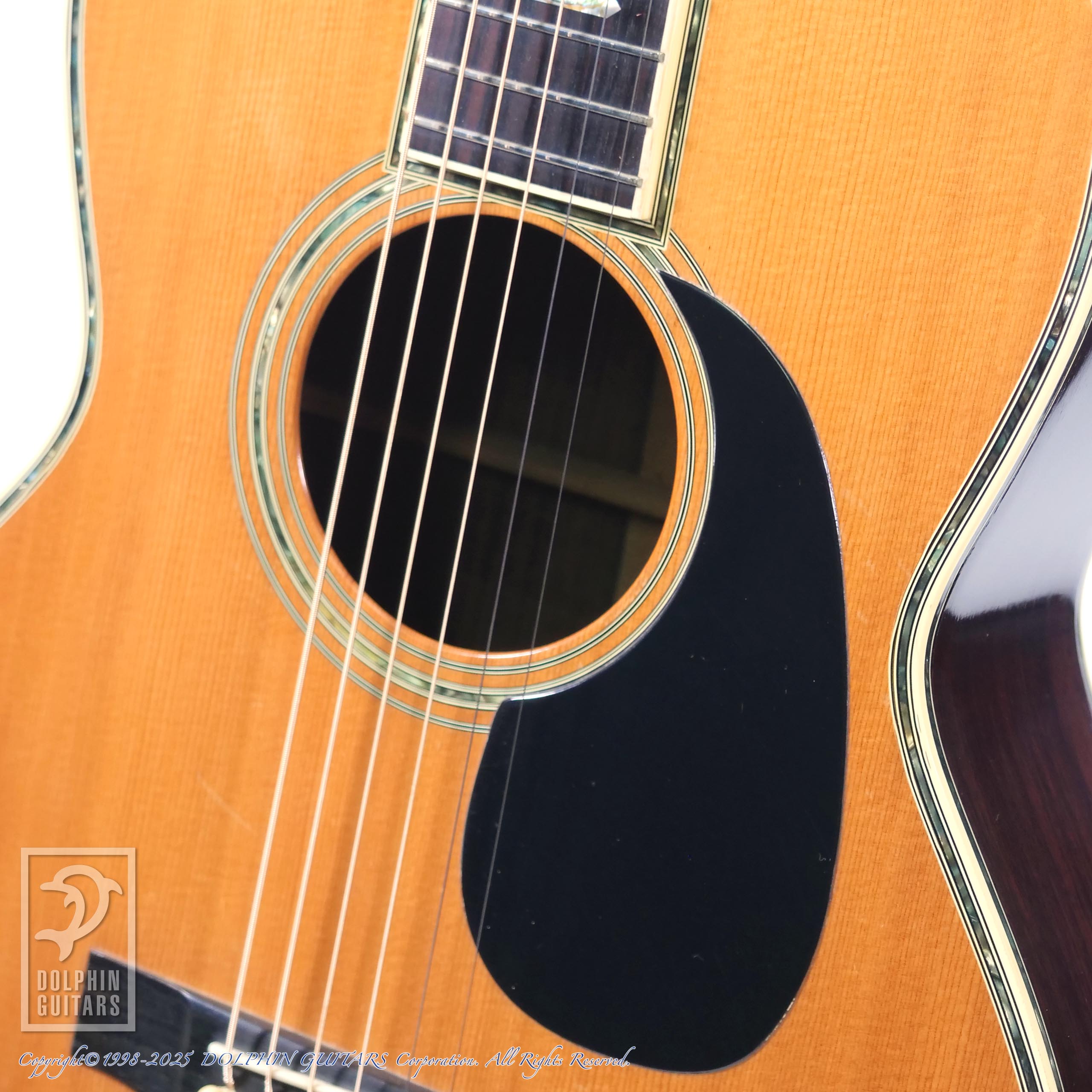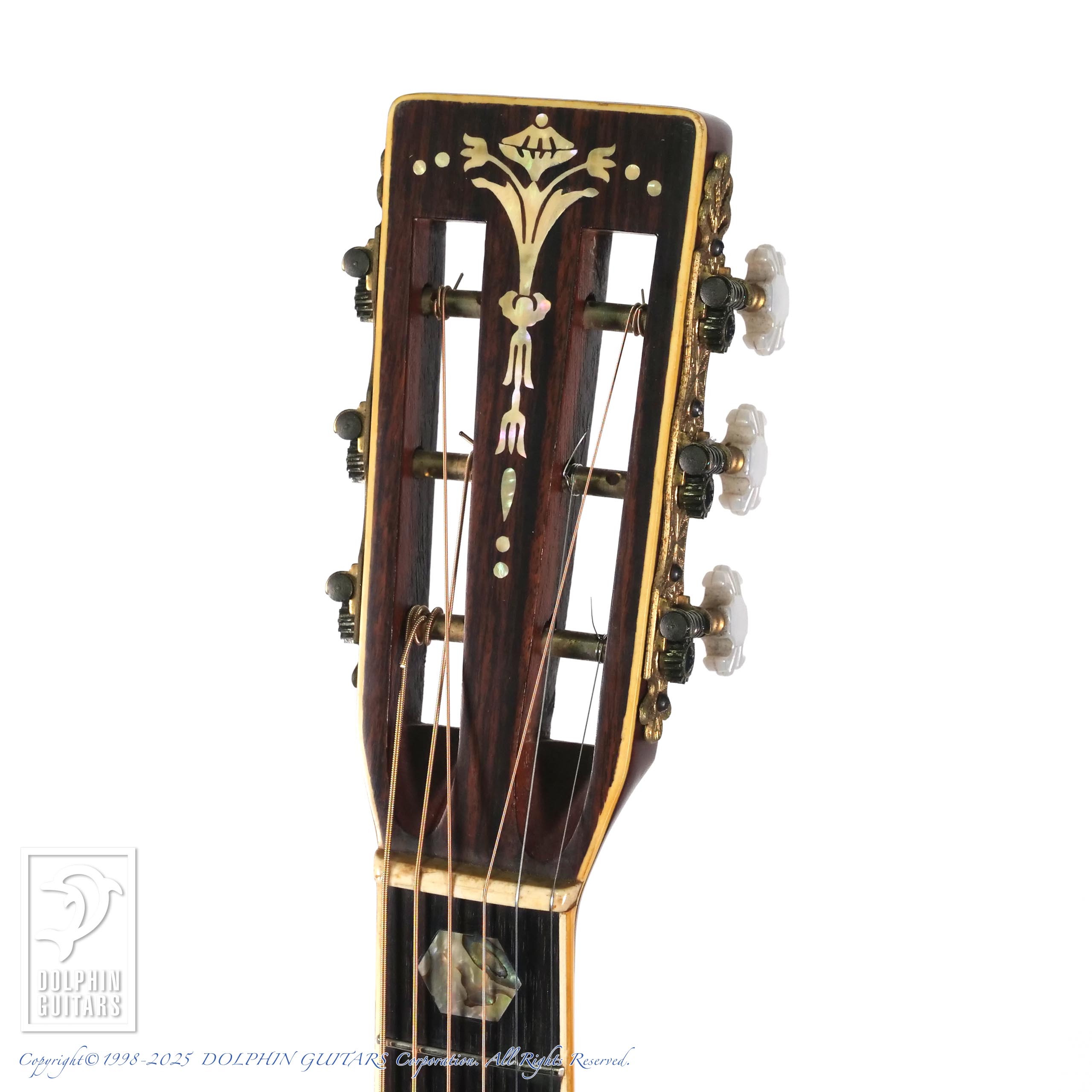 言わずもがな、00-45のオマージュ機種で、1970年代製だと思われます。イミテーションではありますが、アバロン風トリム、パーフリング、ヘキサゴンインレイ(こちらは本物です)にブラックピックガードは、まさに70年代の顔つきです。