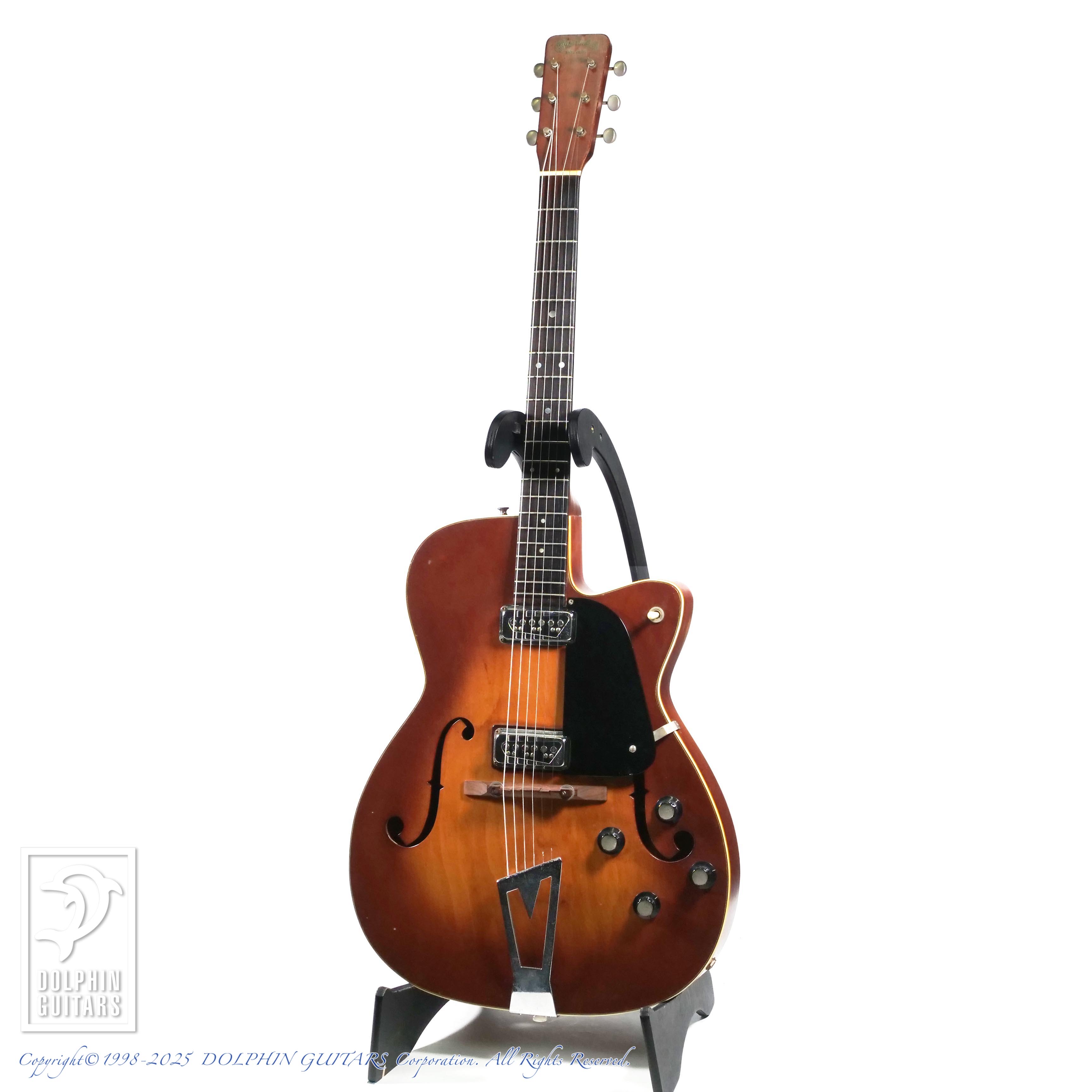 エレクトリック市場にも目を向け、1961年にエレクトリックギターの開発に着手、1962年にF-55が生産開始されました。このフル・ホロウのシンライン構造を持つギターは、プレス加工されたラミネート・メイプルボディ、トップのFホール、2基の DeArmond DynaSonicピックアップ、そしてアコースティックギターのトップブランドらしく、ネックにはマホガニーを採用。ローズウッド指板と組み合わせることで、心地よいタッチと優れた演奏性を実現しています。