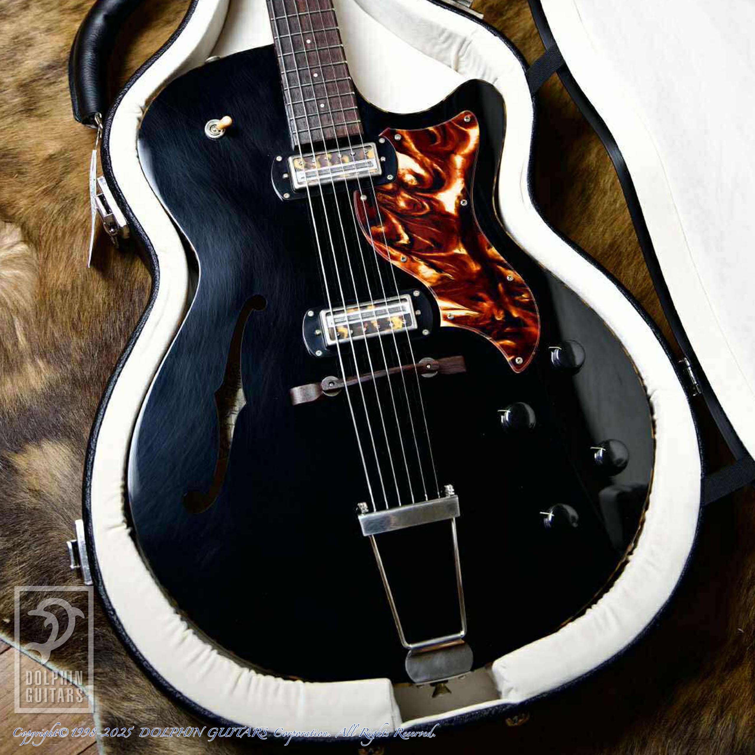 プライ構造のポプラ材をボディ、ネックに使用、元ネタがビザールギターという事で納得できるデティールです。アンティーク仕上げのニトロセルロース・ラッカーフィニッシュは、新品でありながら長年弾き込まれたギターのような風合いと質感を再現しております。またヒョウ柄のバインディングはコリングスの自社製造(もちろんピックガードも)も本機種の魅力的なスペックでしょう。