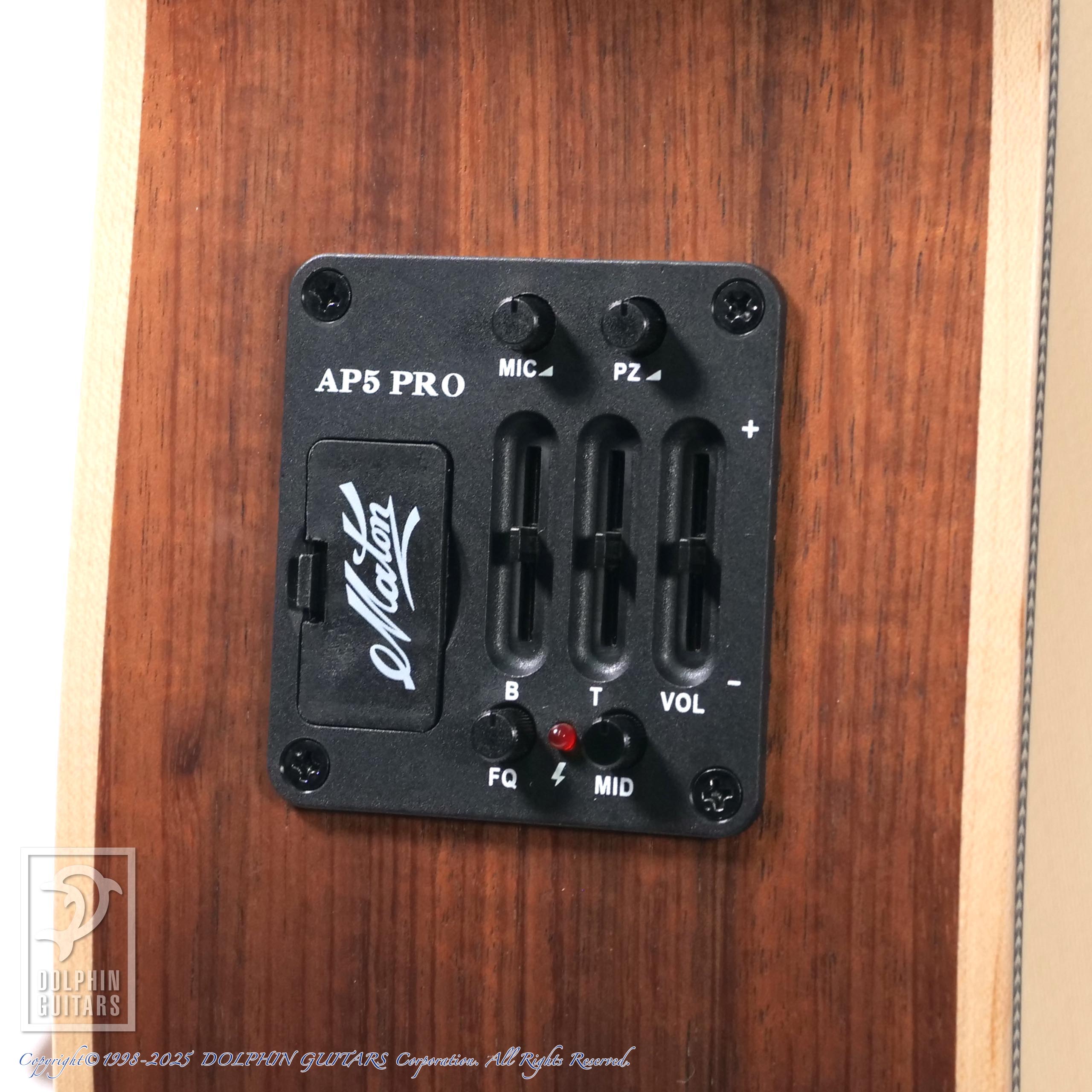 搭載されたAP5pro PUシステムは、オリジナルのアンダーサドルPUにコンデンサーマイクを併用する事により、奥行きのある音域と抜群なエアー感に加え、ボディーヒット音も余すことなくアウトプットします。また、高い出力を持つプリアンプを内蔵しておりますので、外部プリアンプ等を使用せずとも、そのままプラグインしていただければ極上のサウンドをお楽しみいただけます。PUとマイクVolは完全に独立しており、手元での出力バランス調整が可能ですのでお好みや現場に合わせてご使用下さい。