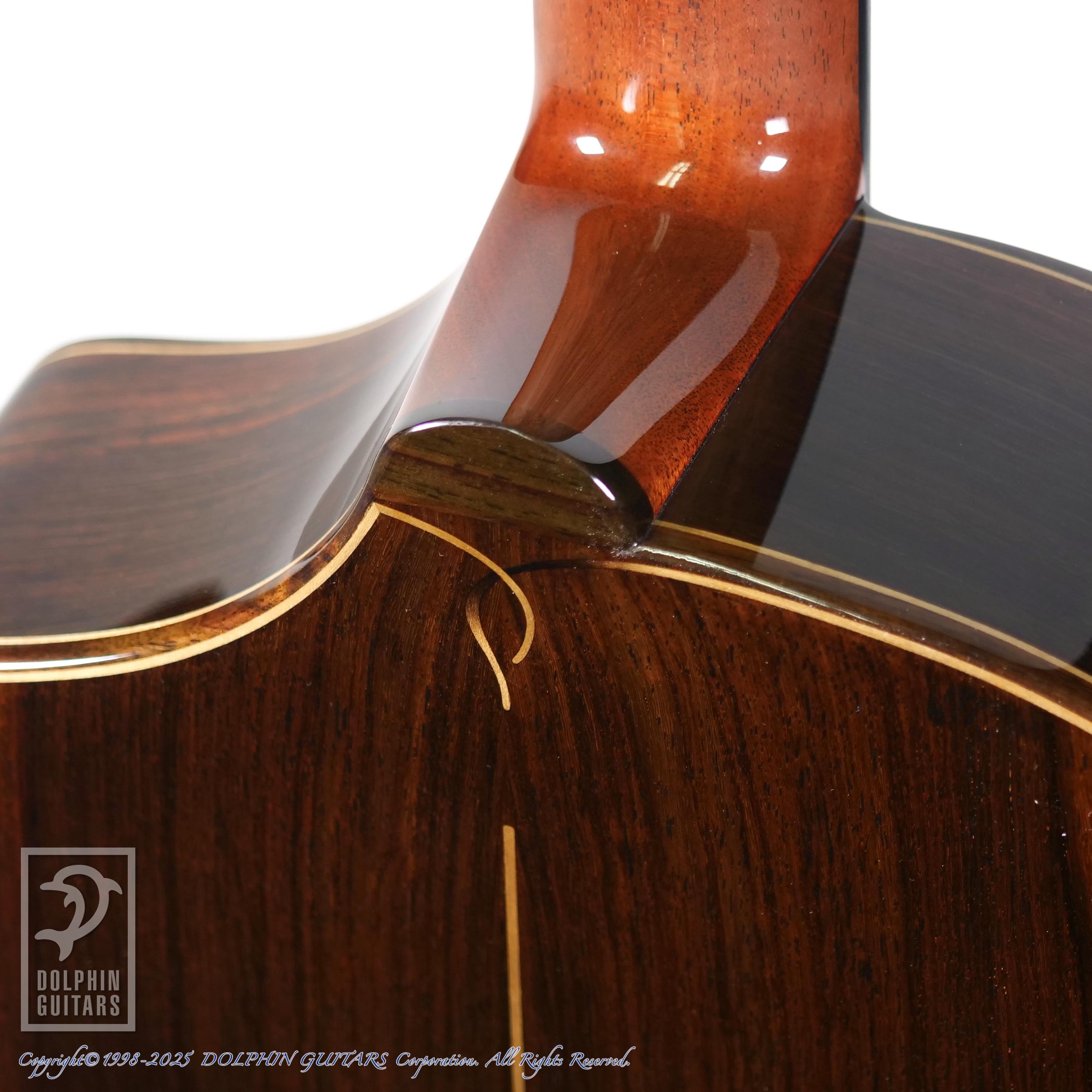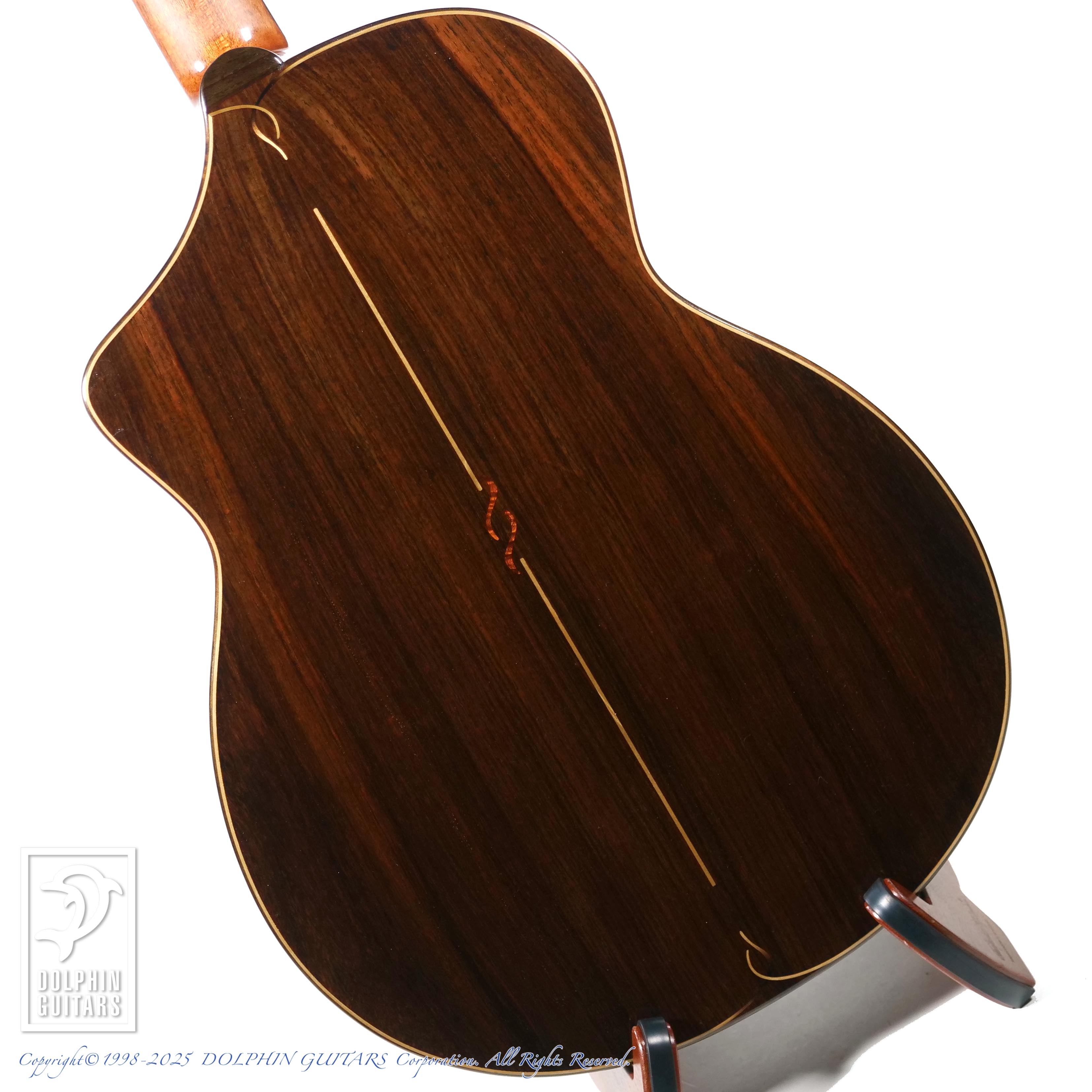 パドゥーク材の赤を基調としたデザイン。ビルトインPGを含めて板厚を調整したトップ板、ベヴェルドカッタウェイ、ネックジョイントは杉田氏が独自に改良したスパニッシュジョイントとなっておりますので、十分な強度を保ったままヒールレスにすることを可能にし、木工に長けた杉田氏自慢のネックジョイントです。ヒールレスジョイントがもたらすハイポジションの優位性は絶大で、13Fまでカポタストの装着を可能とし、それほどハイポジションの演奏性にも重視した構造となっております。