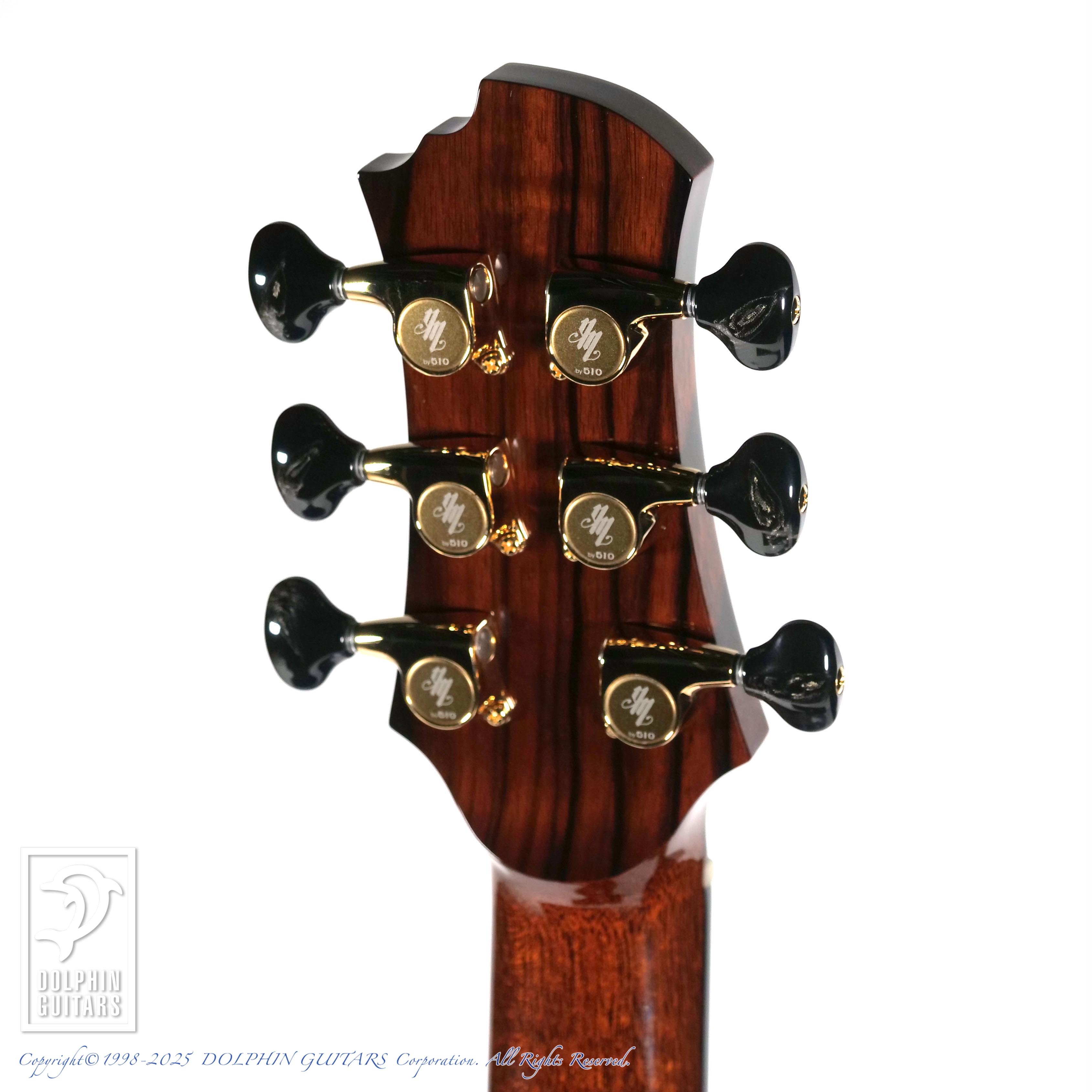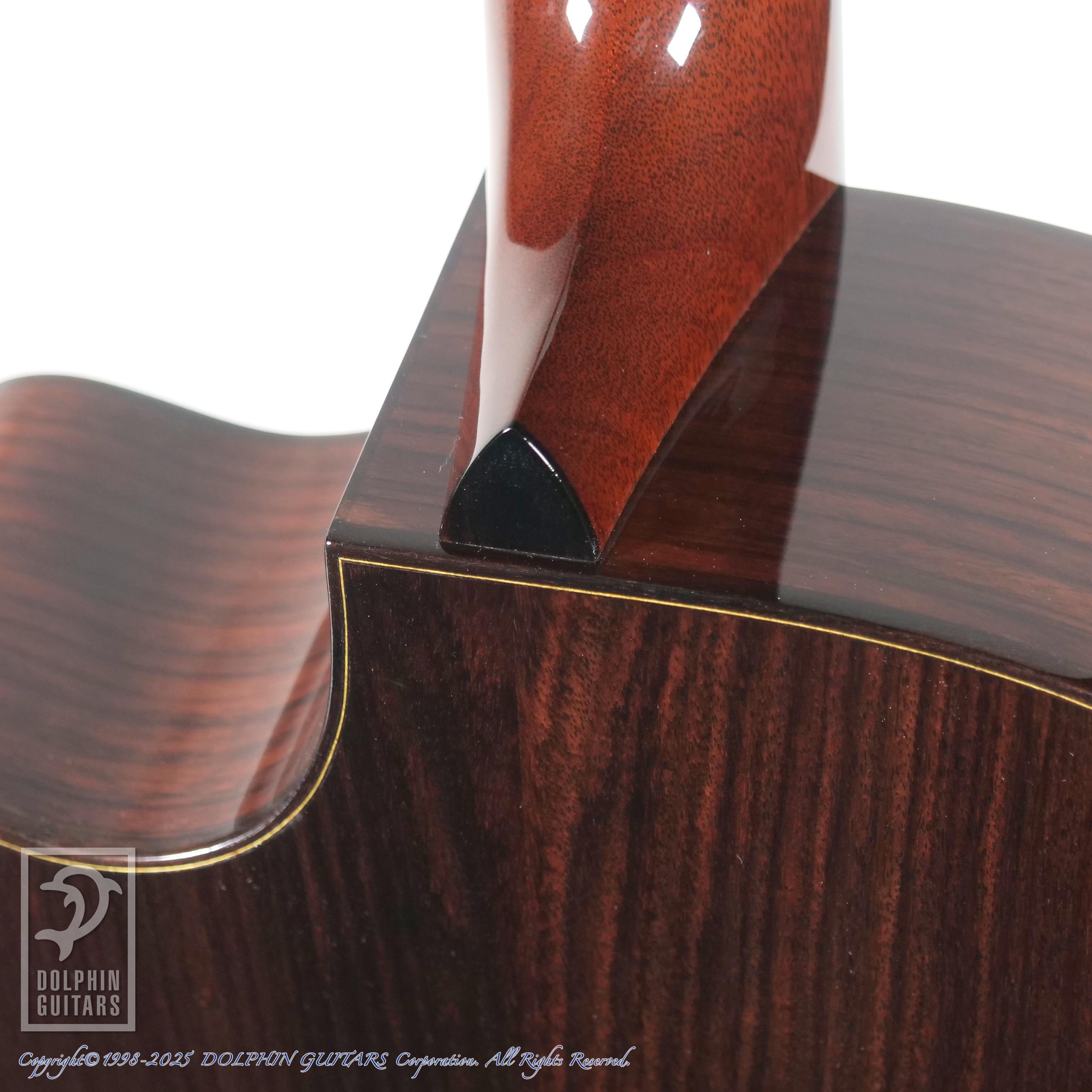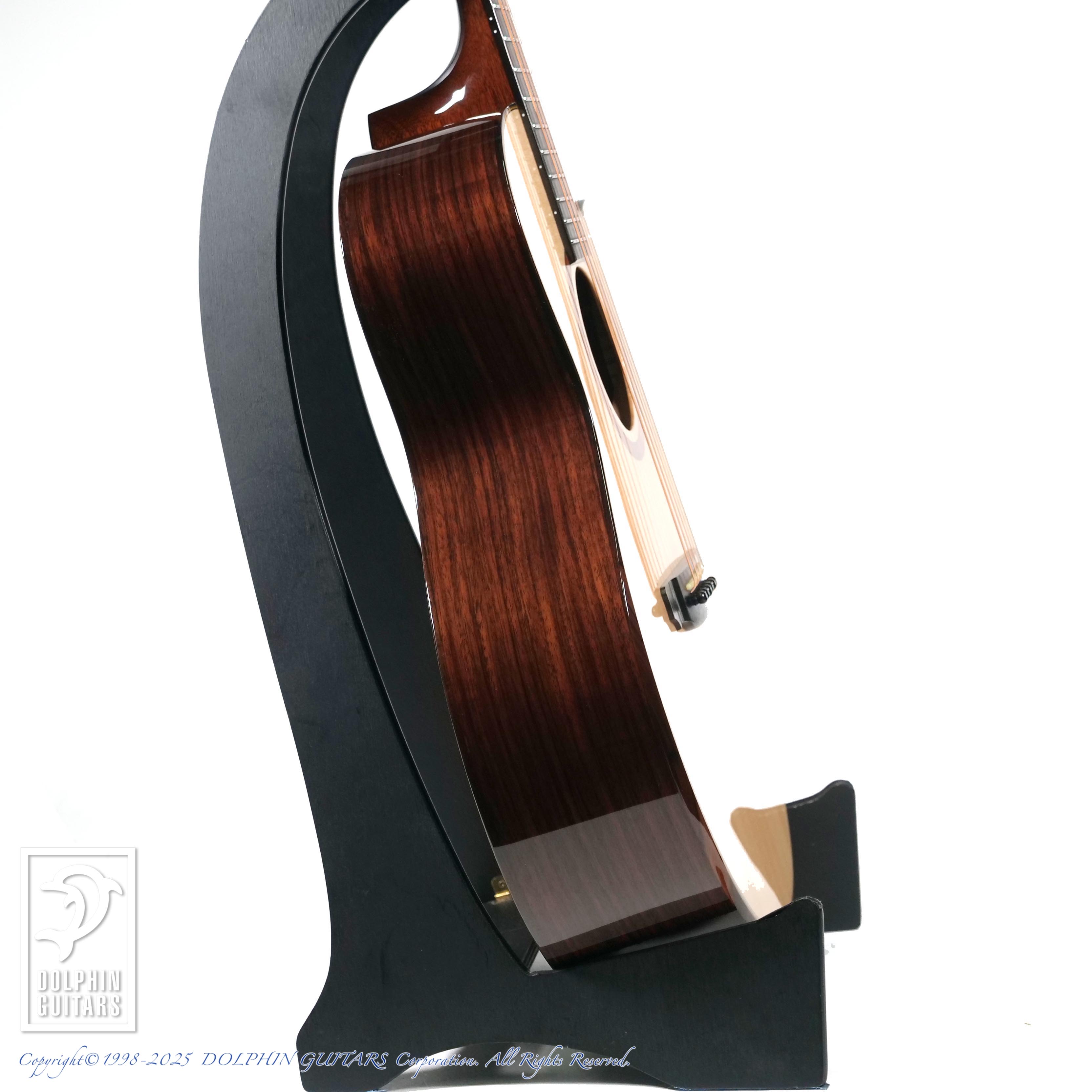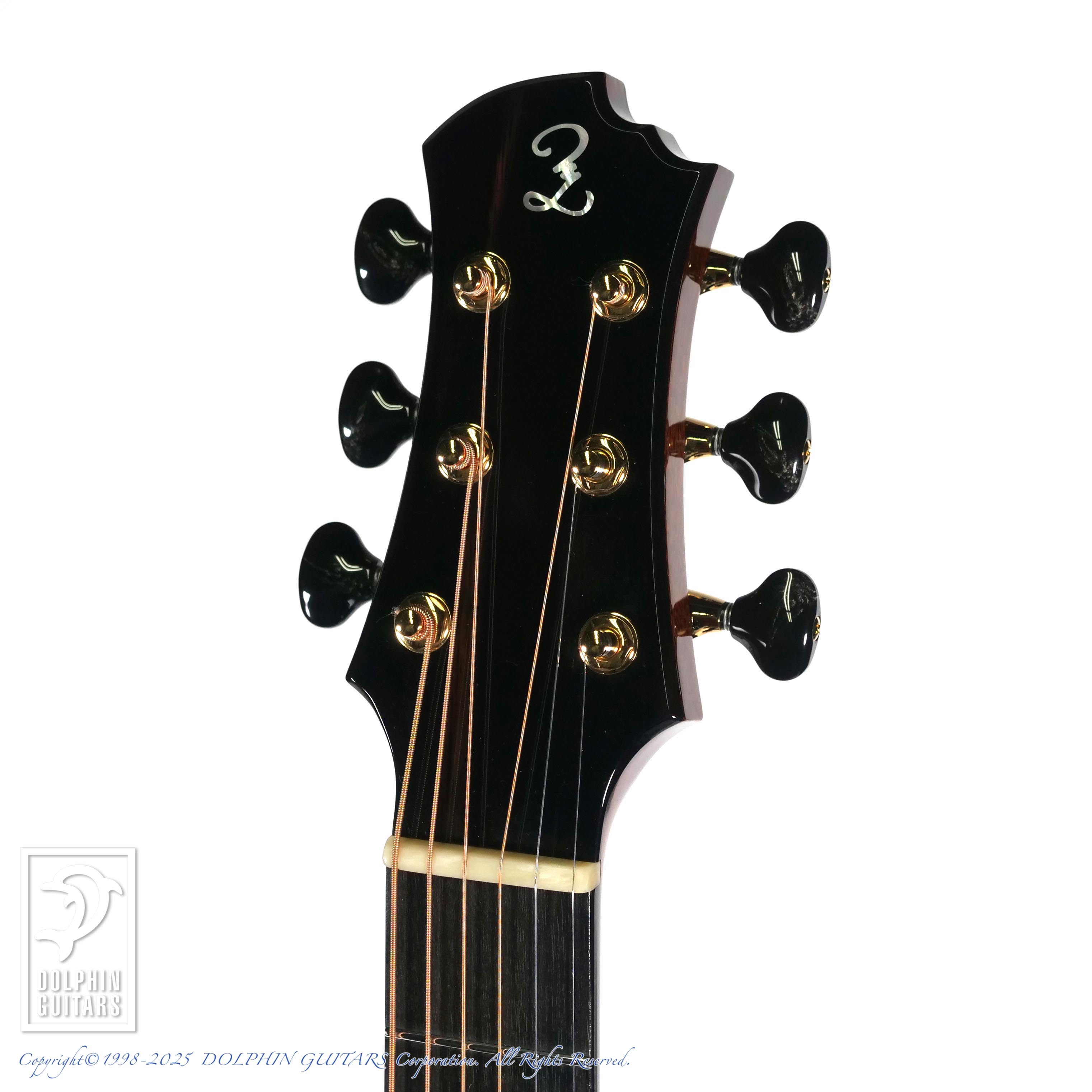 15周年という節目に特別なギターが欲しいという想いをカタチにしていただきました。使用材はインディアン・ローズウッド+ルッツ・スプルースとオーンドックスながらも、バック&サイドはできる限り薄いブラウン系でとこだわった選定をさせていただきました。ボディー・シェイプは前シグネチャーと同様ながら、ヘッド、ブリッジ形状は僕自身がデザインしたオリジナル・シェイプに変更してもらい、より特別なギターになりました。もちろんロゼッタやバインディングなど細かな装飾も全て僕が決めた特別仕様のシグネチャーモデルです。