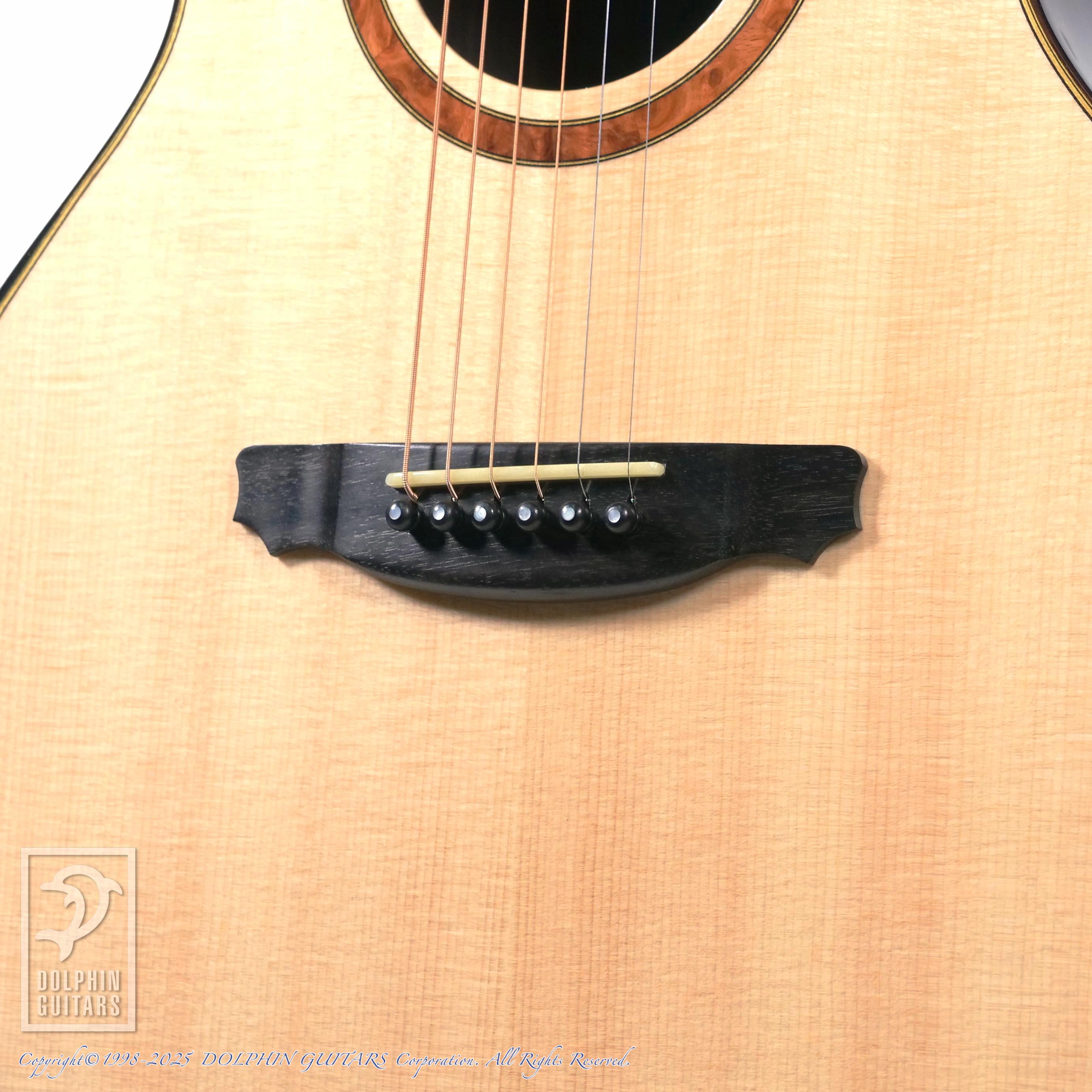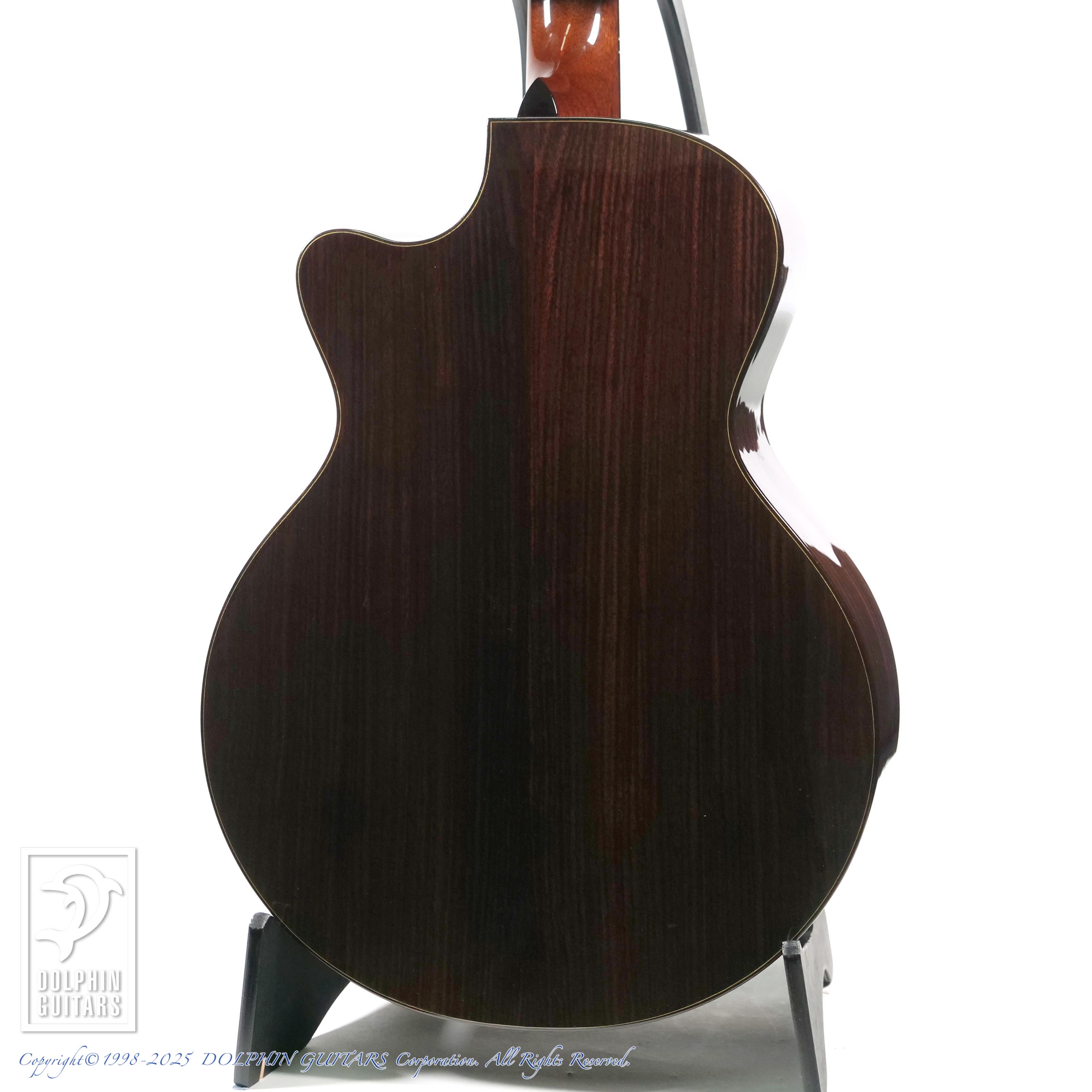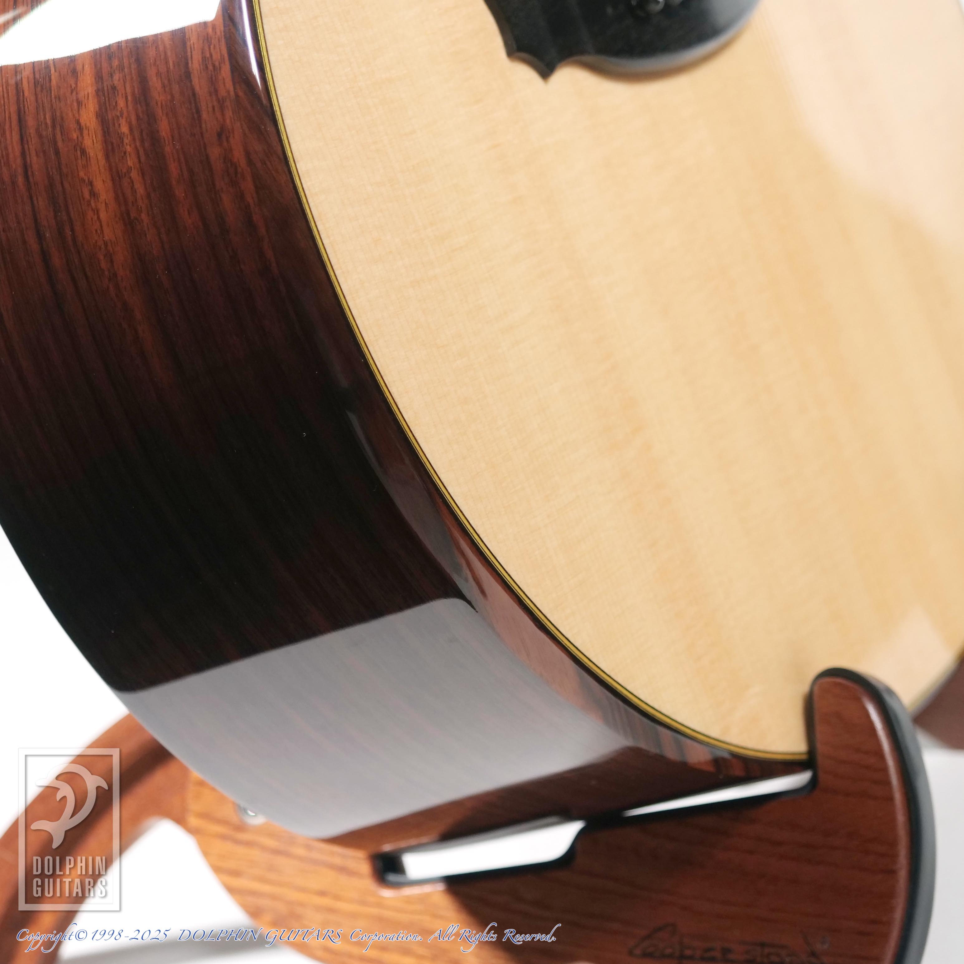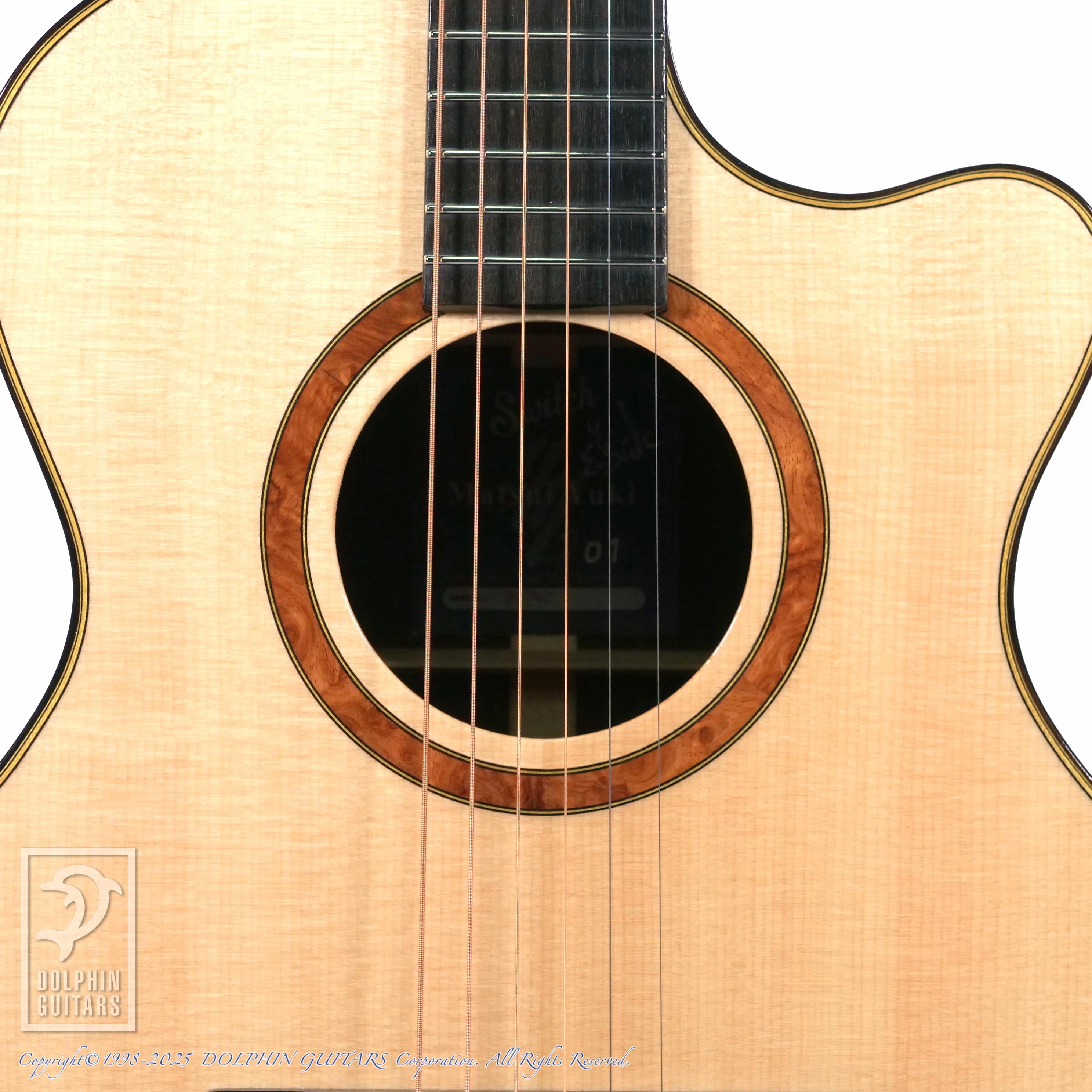 15周年という節目に特別なギターが欲しいという想いをカタチにしていただきました。使用材はインディアン・ローズウッド+ルッツ・スプルースとオーンドックスながらも、バック&サイドはできる限り薄いブラウン系でとこだわった選定をさせていただきました。ボディー・シェイプは前シグネチャーと同様ながら、ヘッド、ブリッジ形状は僕自身がデザインしたオリジナル・シェイプに変更してもらい、より特別なギターになりました。もちろんロゼッタやバインディングなど細かな装飾も全て僕が決めた特別仕様のシグネチャーモデルです。