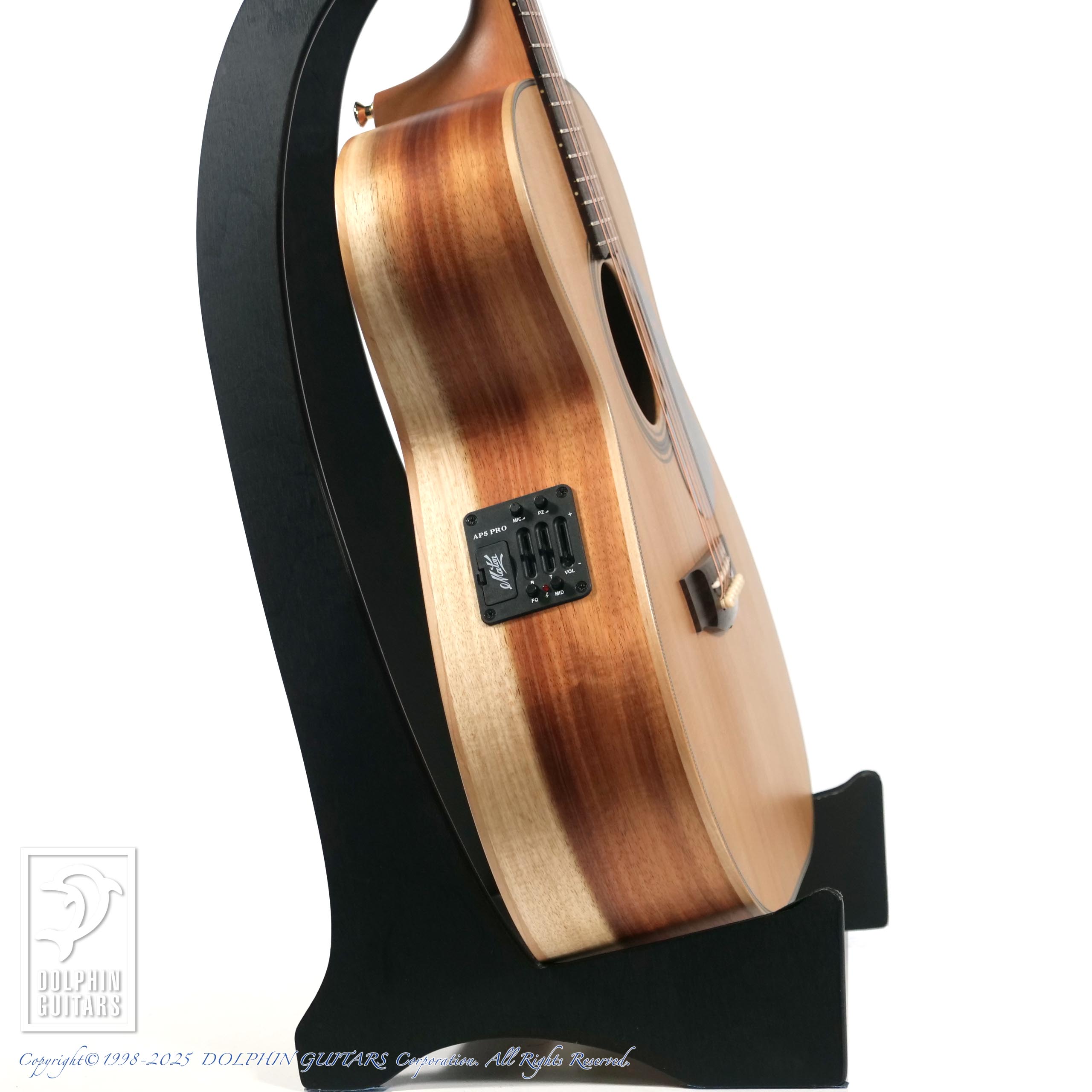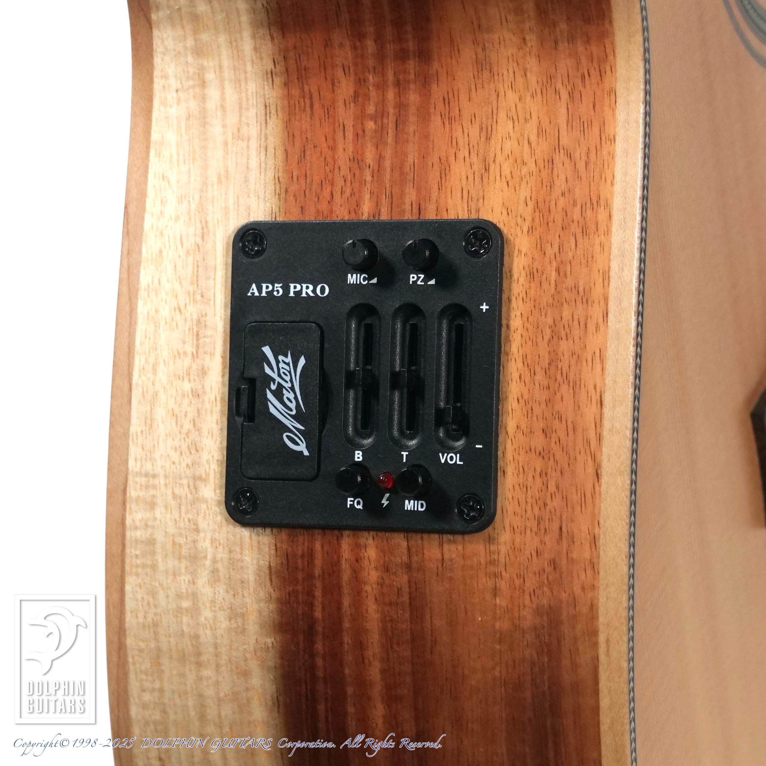 搭載されたAP5pro・ピックアップ・システムは、オリジナルのアンダーサドル・PUにコンデンサーマイクを併用する事により、奥行きのある音域と抜群なエアー感に加え、ボディー・ヒット音も余すことなくアウトプットします。また、高い出力を持つプリアンプを内蔵しておりますので、外部プリアンプ等を使用せずとも、そのままプラグインしていただければ極上のサウンドをお楽しみいただけます。PUとマイクVolは完全に独立しており、手元での出力バランス調整が可能ですのでお好みや現場に合わせてご使用下さい。