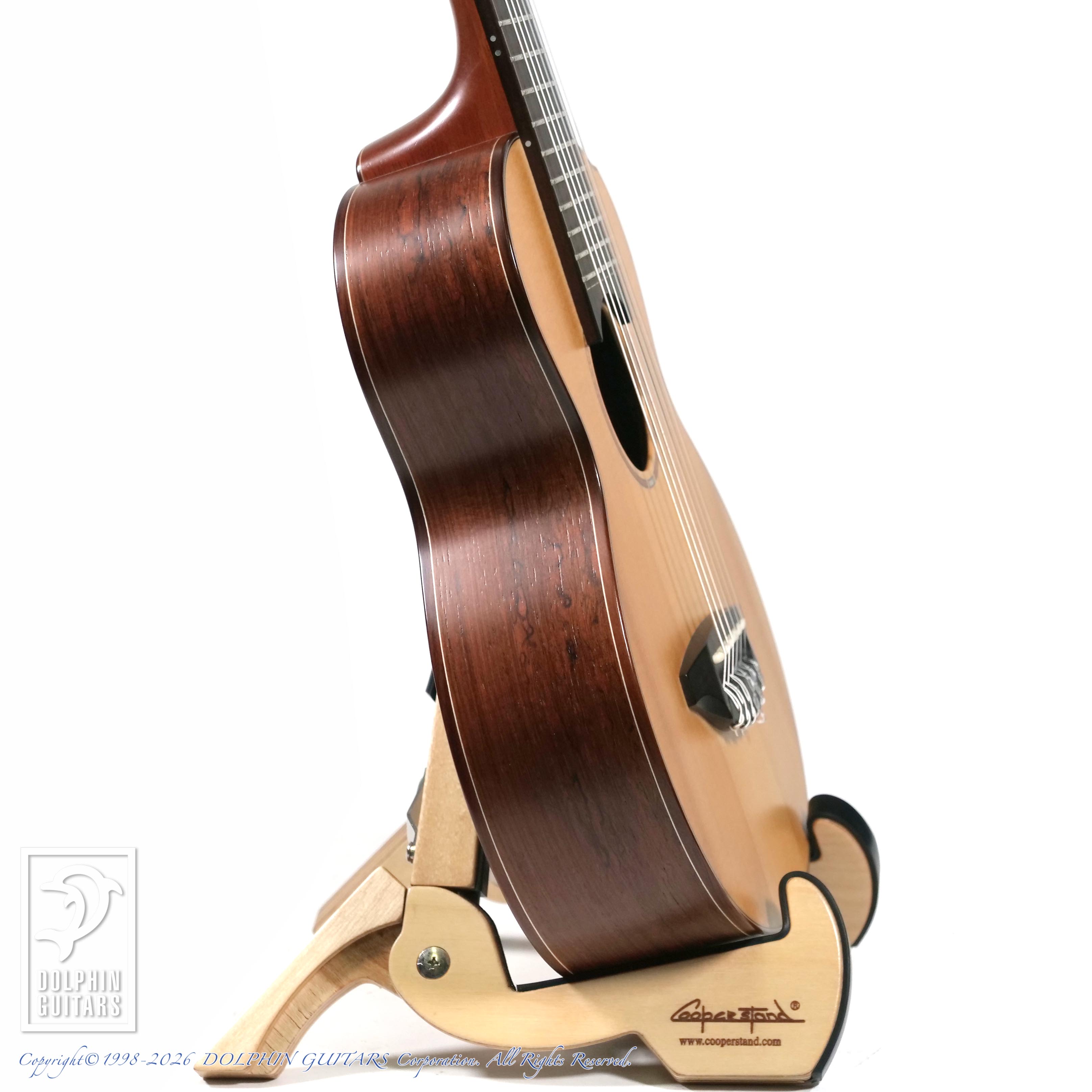 色白のジャーマンスプルースに、面白い柾目木のマダガスカルローズを合わせ、それを引き立てるかのようなシンプルな装飾が、凛とした雰囲気を醸し出します。ローズウッドのバインディングでしっかりとクラシカルに仕上げているところも憎いですね。