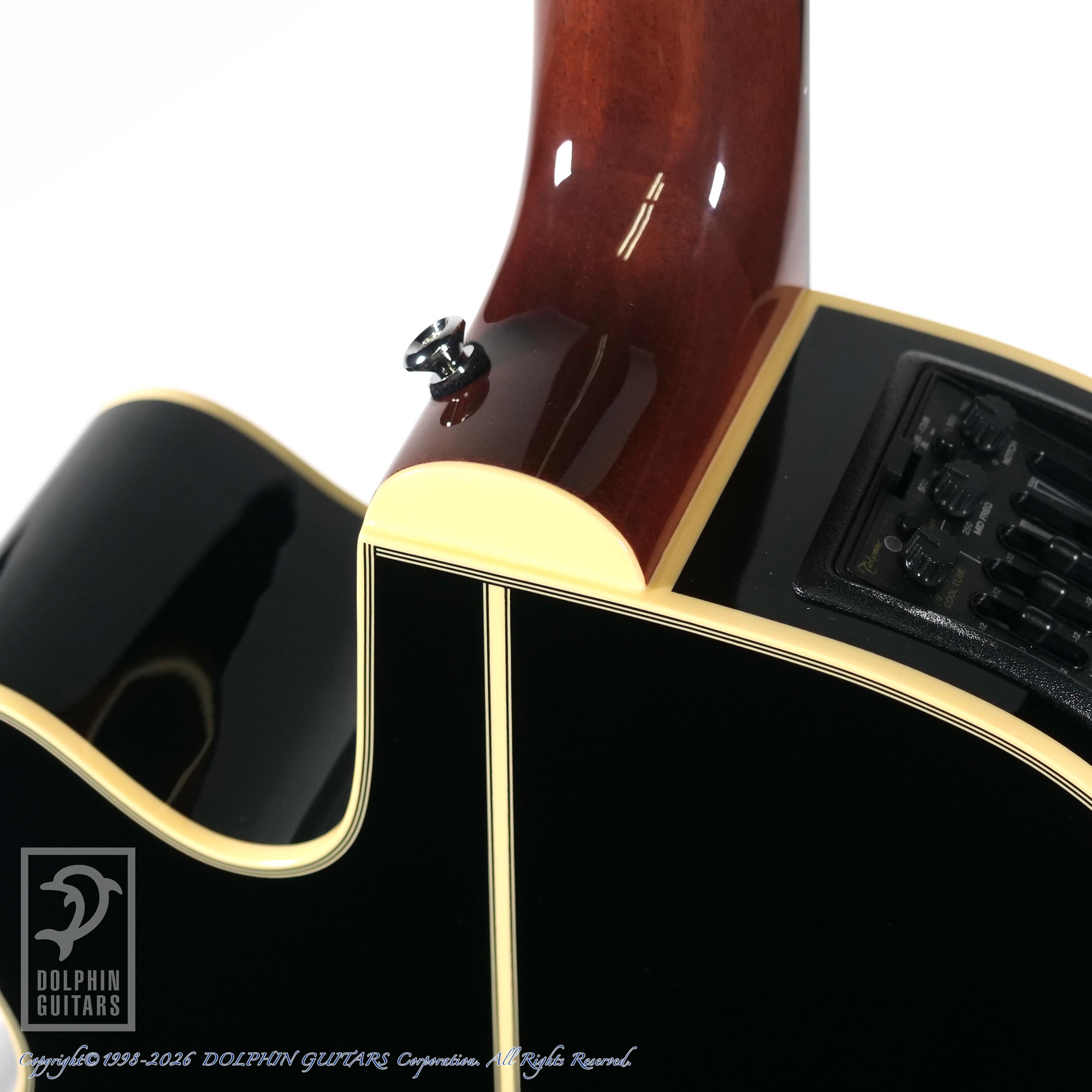 片連ペグとブラックフィニッシュのコンビネーションは、数あるラインナップの中でも抜群の格好良さがあり、ついついコードストロークでかき鳴らしたくなる機種でもあります。真空管プリアンプCTP-3は非常に気持ちのよいドライブ感を演出してくれ、ライブにも重宝しそうです。