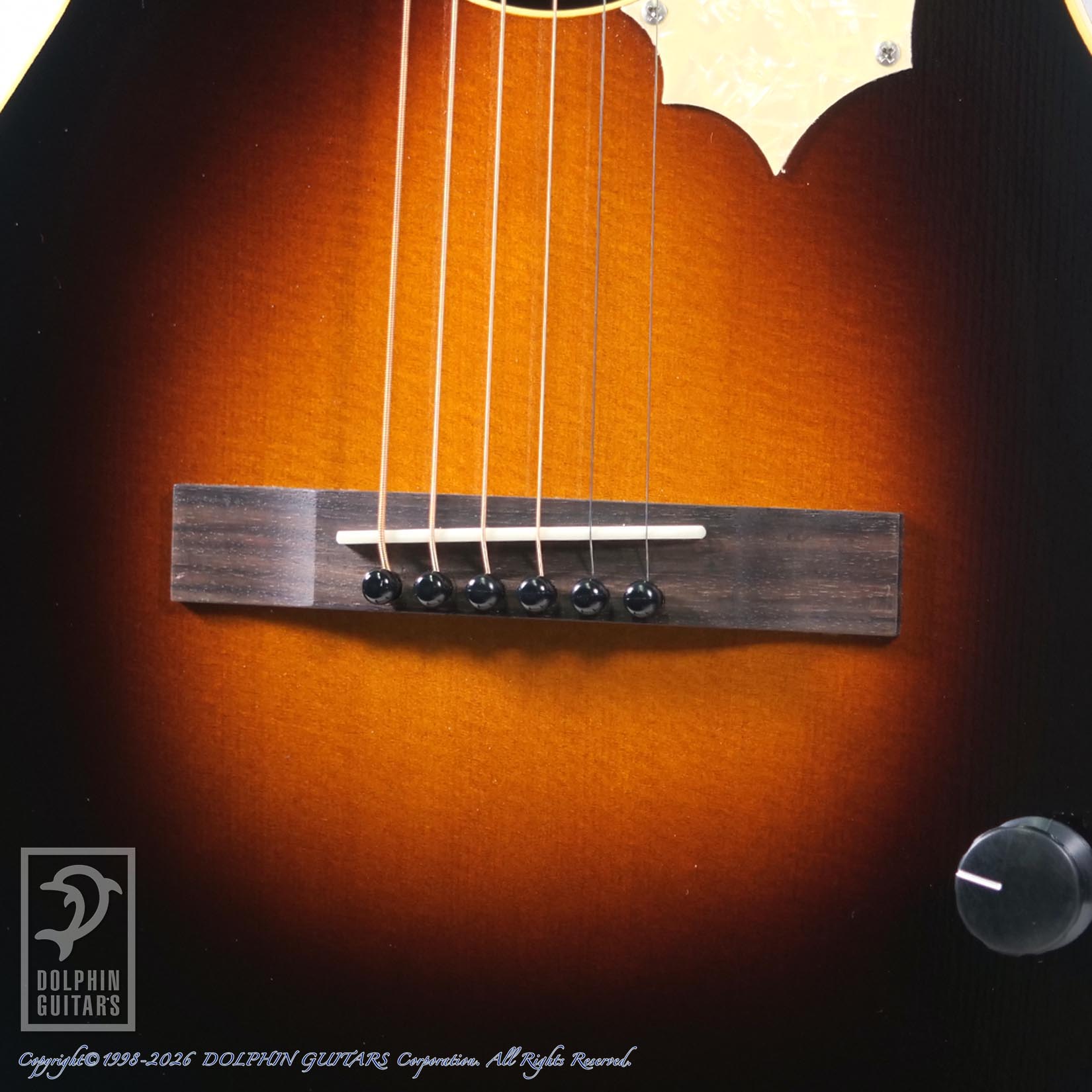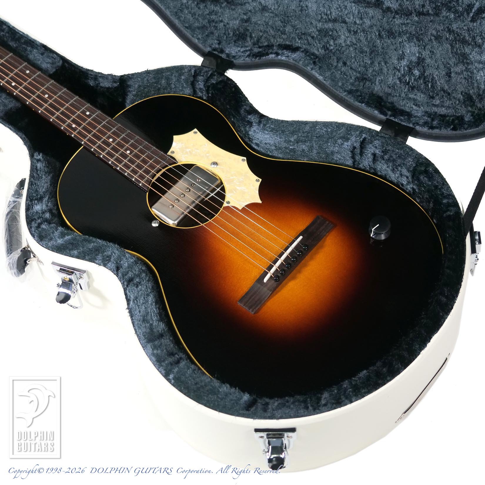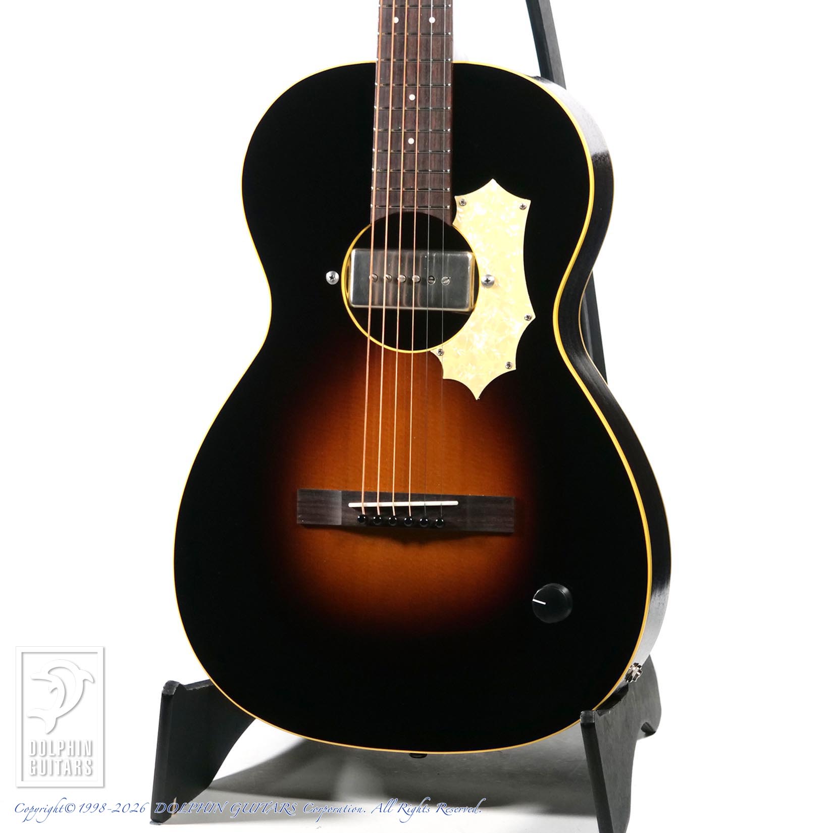 男らしく勇ましいピックアップが搭載された本モデル。ギラついたピックアップカバーに身を纏ったP-90スタイルのオリジナルピックアップ(アコースティックギター用に開発)をサウンドホールにネジ止め、そしてピックガードもネジ止め、1ボリュームのみ、おそらく令和8年に於いてカッコ良い意味で、もっとも時代遅れなスペックを持ちます。