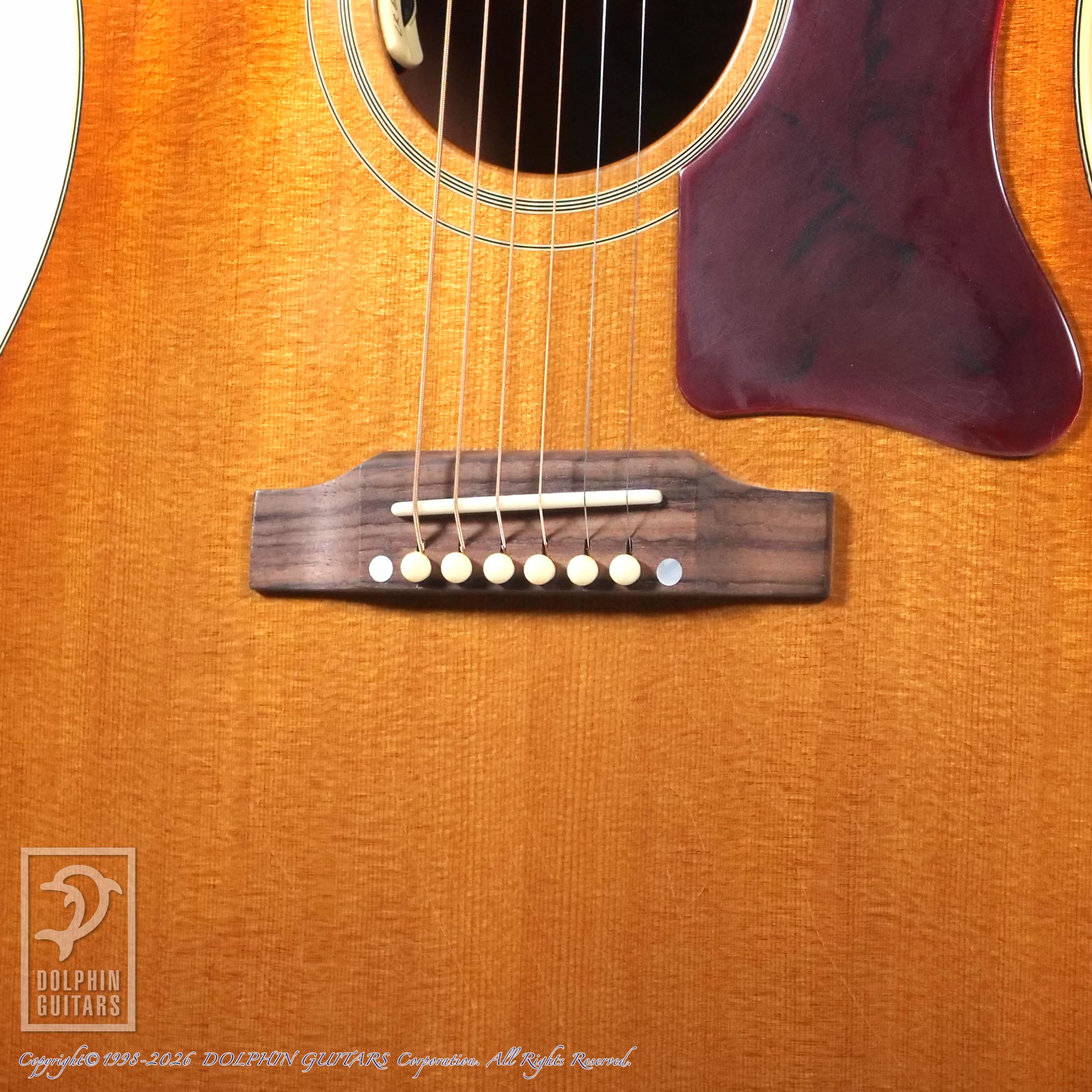 ベリーアップ・ブリッジはローズウッド製で、ボーン・サドルとクリーム色のブリッジピンを備えています。