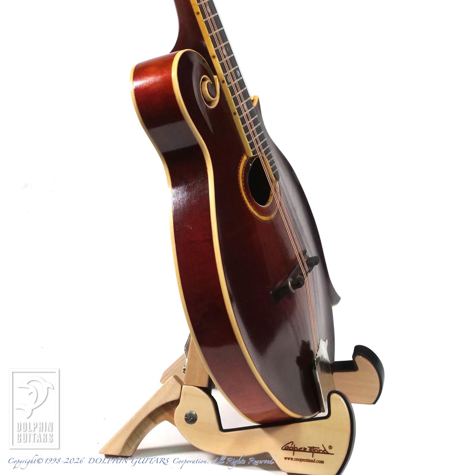 トップに二箇所薄らとしたクラックがございますが、リペア済みで使用上は問題ございません。おそらくネックは過去にオーバーラッカー(シェラック?)がされていると思われ、少し塗装のツヤが出ているため、左手の操作性は向上しているように感じます。またネックバインディングの数ミリの継ぎ足しも確認できますが、あまり目立ちません。当店入荷後、弦高調整済みで、ヴィンテージマンドリンに有りがちな弾きにくさは皆無、ネックコンディションも素晴らしく、ハイポジションまでスイスイと演奏可能です。