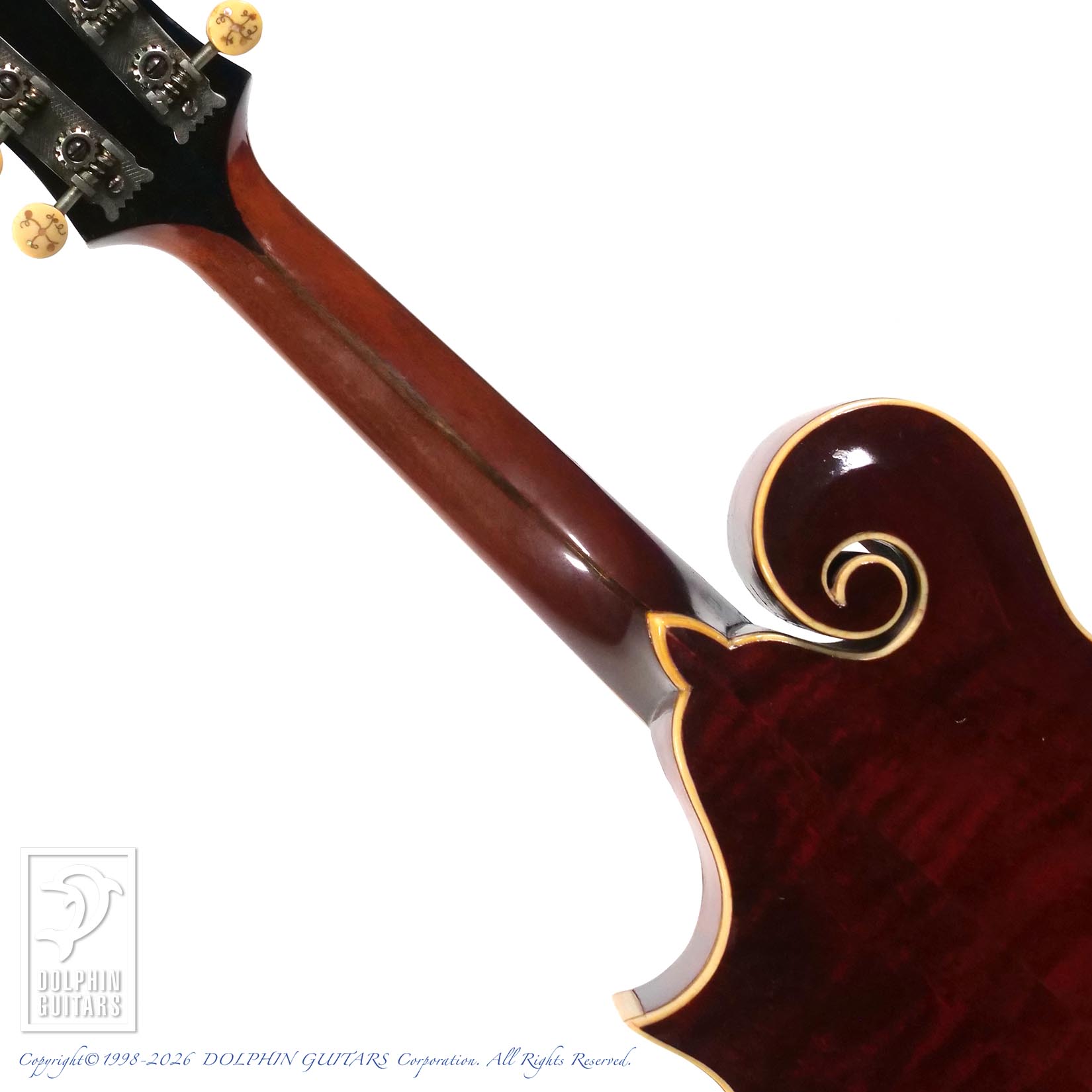 1902年より生産が始まったF-4は、1922年にF-5が発表されるまで、フラッグシップモデルとしてマンドリンシリーズのトップに君臨していました。ヘッドプレートには優美なトーチインレイが入れられており、トラスロッド・カバーが無い為に、やや長めのデザインで存在感抜群です。またオリジナルペグは、少々固さは感じますが(人によっては気にしないレベルです)つまみに装飾の入ったスペシャルな仕様となっており、トップモデルに相応しいデティールと言えます。