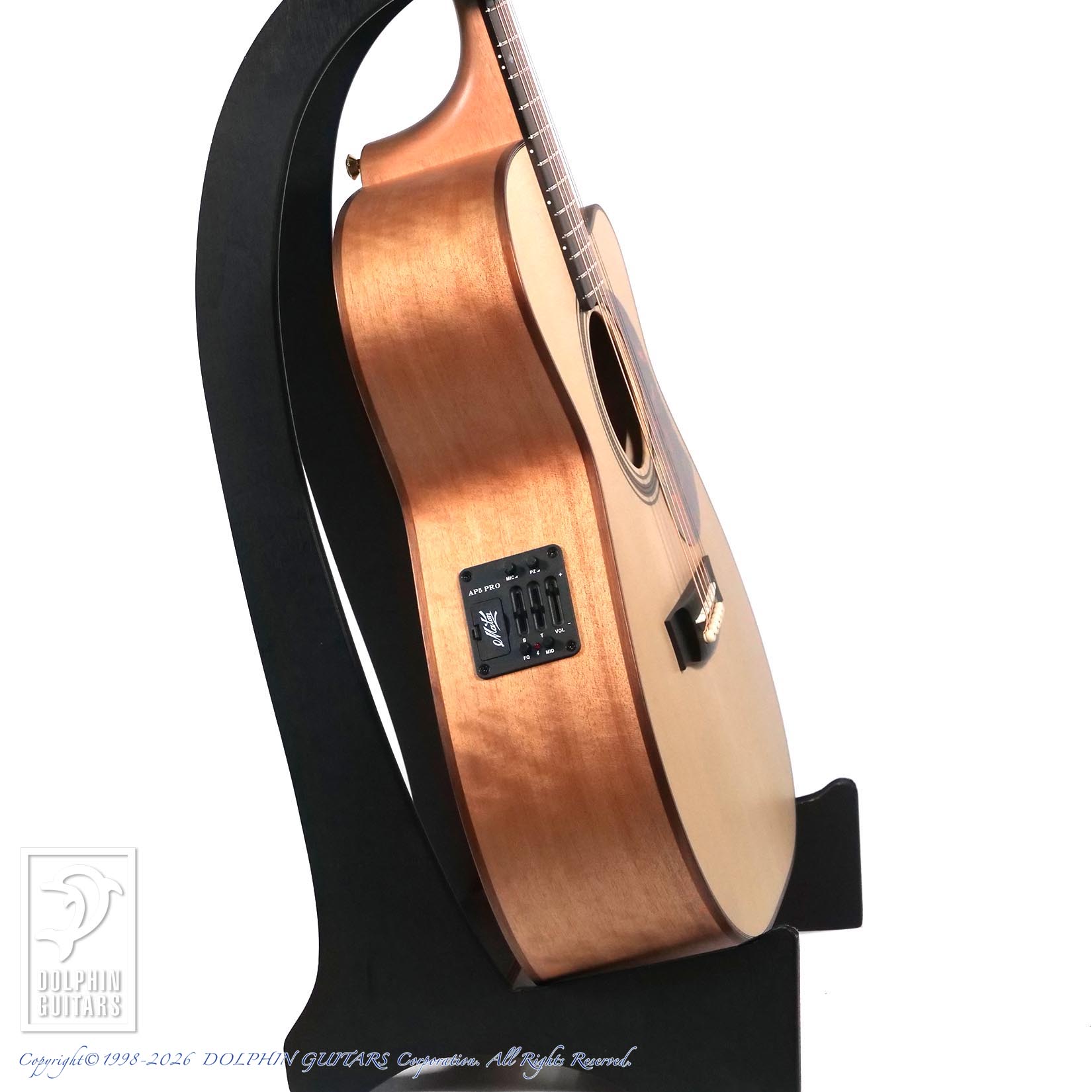 PUシステムはメイトン社オリジナルのAP5-Pro。非常にクリアで透明感のあるマイクサウンドと力強いピエゾの存在感でどんな現場でもナチュラルなアコースティックサウンドをアウトプットできます。