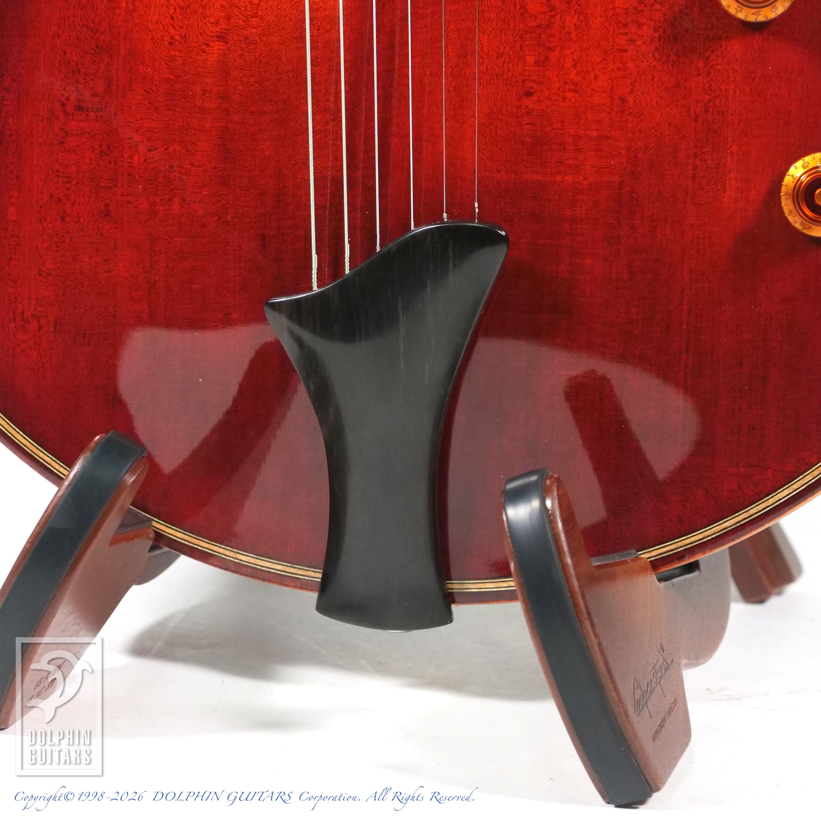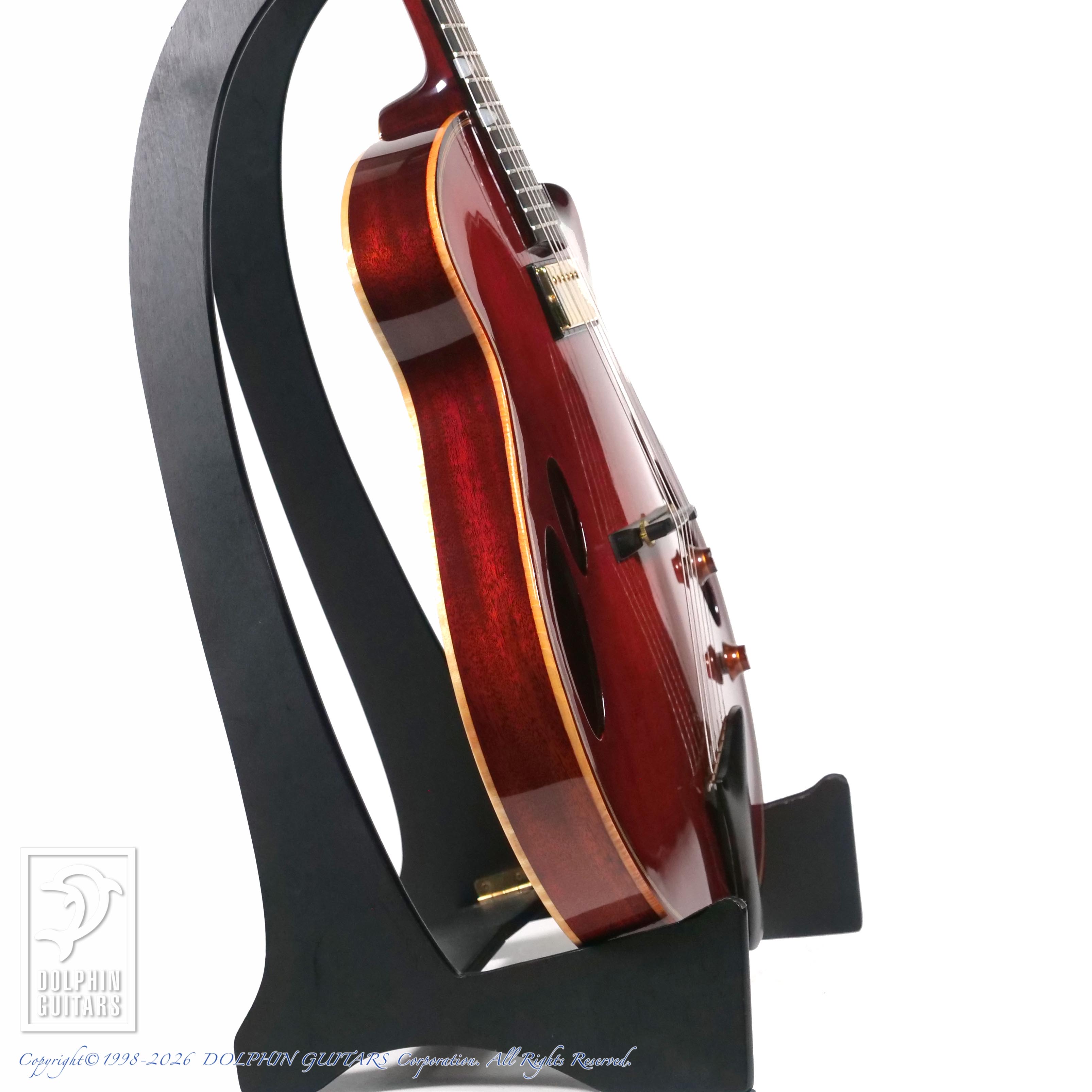 アメリカのアーチトップビルダー、Otto D'Ambrosio(オットー・ダンブロシオ)デザイン・設計された本器は、同ブランドの中でも異彩を放つモデルといえます。非対称のヘッド、16フレットジョイント仕様、ウッドパーフリング、オリジナルデザインの楕円形ホールなど、もはや芸術の域に達したアーチトップギターでしょう。