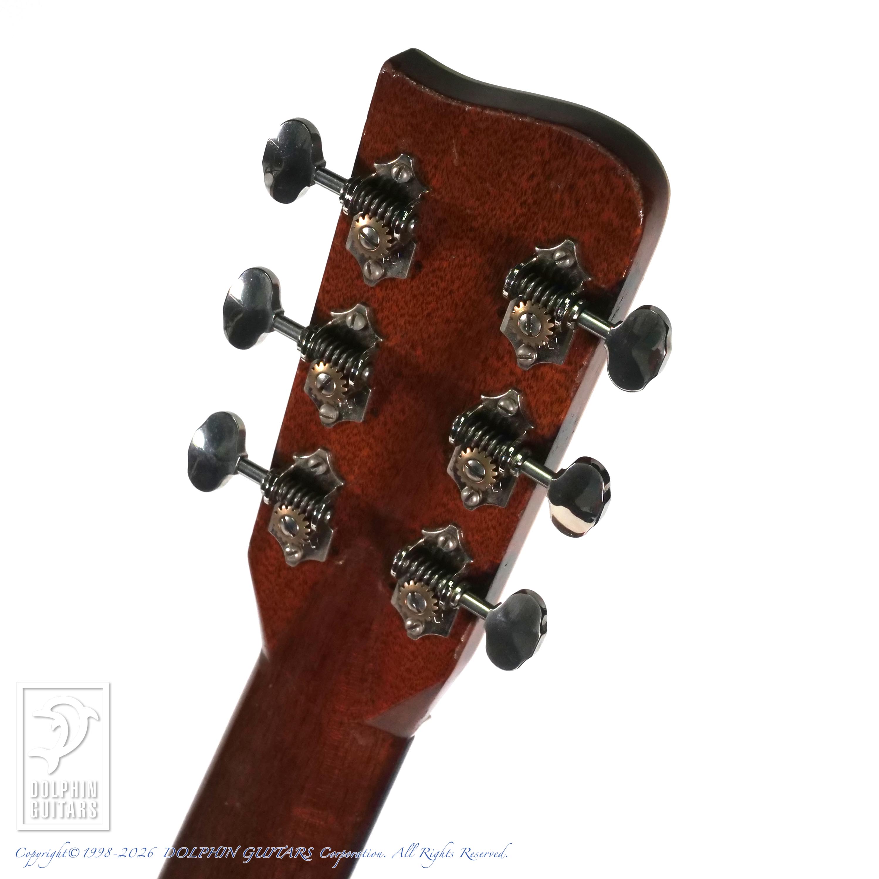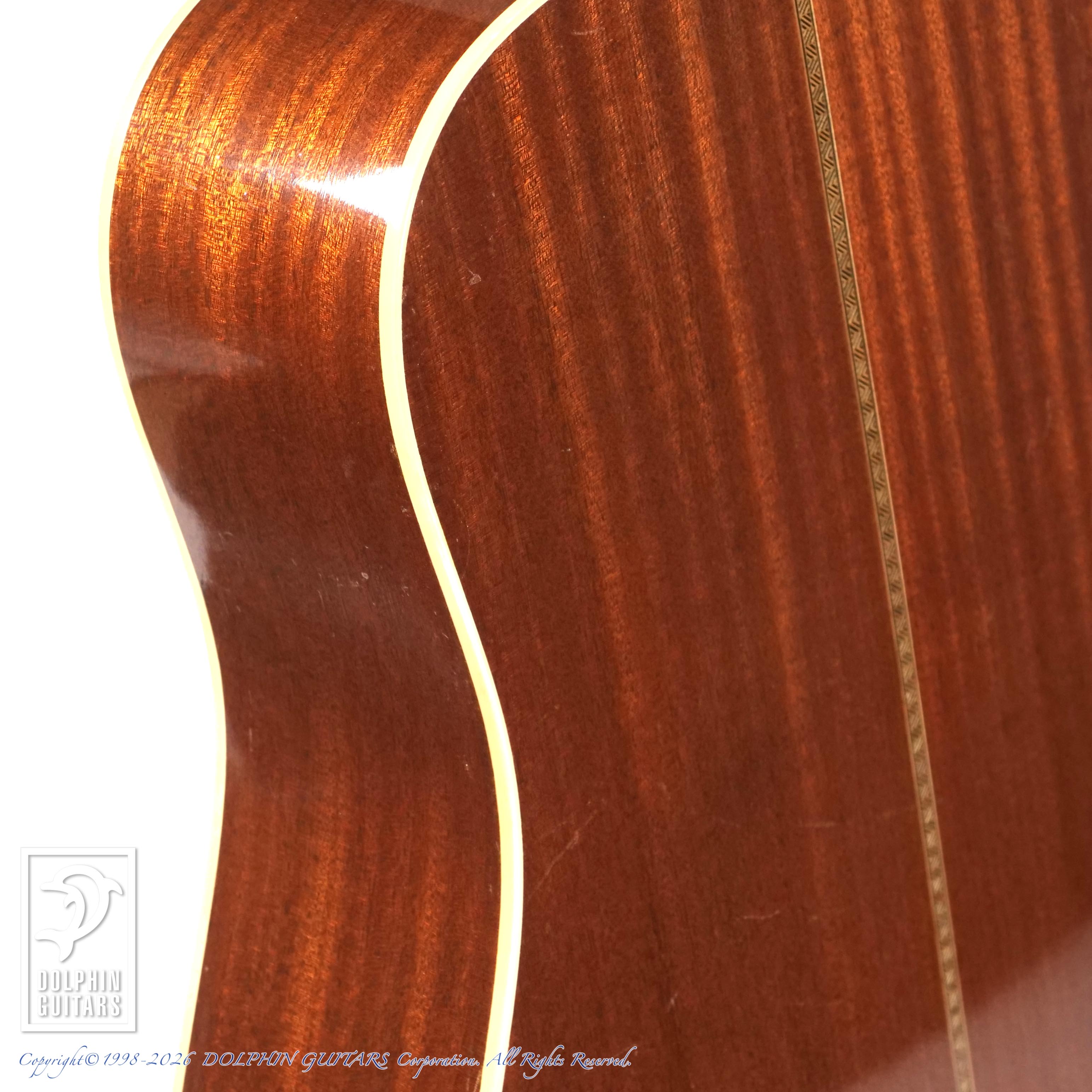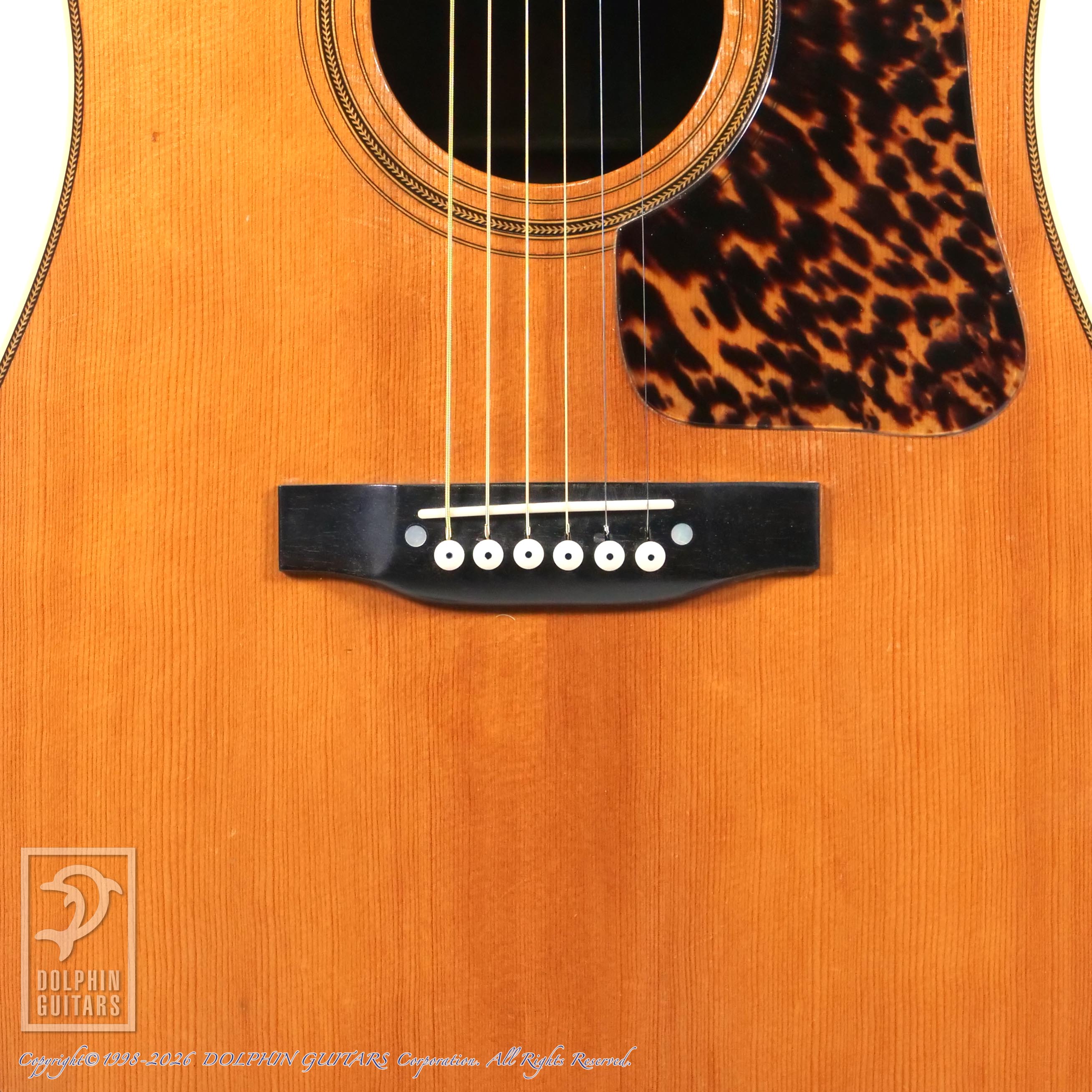よく弾き込まれており、タイトでボリューム感のある理想的なドレッドノート・マホガニーサウンドをお楽しみいただけます。ハイポジションではきらびやかで抜けの良いトーンを響かせ、フラットピッキングとの相性も抜群です。全体的に使い込まれてきた跡が見受けられますが、それもまたこの個体ならではの“味わい”として魅力的な表情を見せてくれる一本です。また、本鼈甲ピックガードにも交換されており、前オーナーの拘りが垣間見れます。