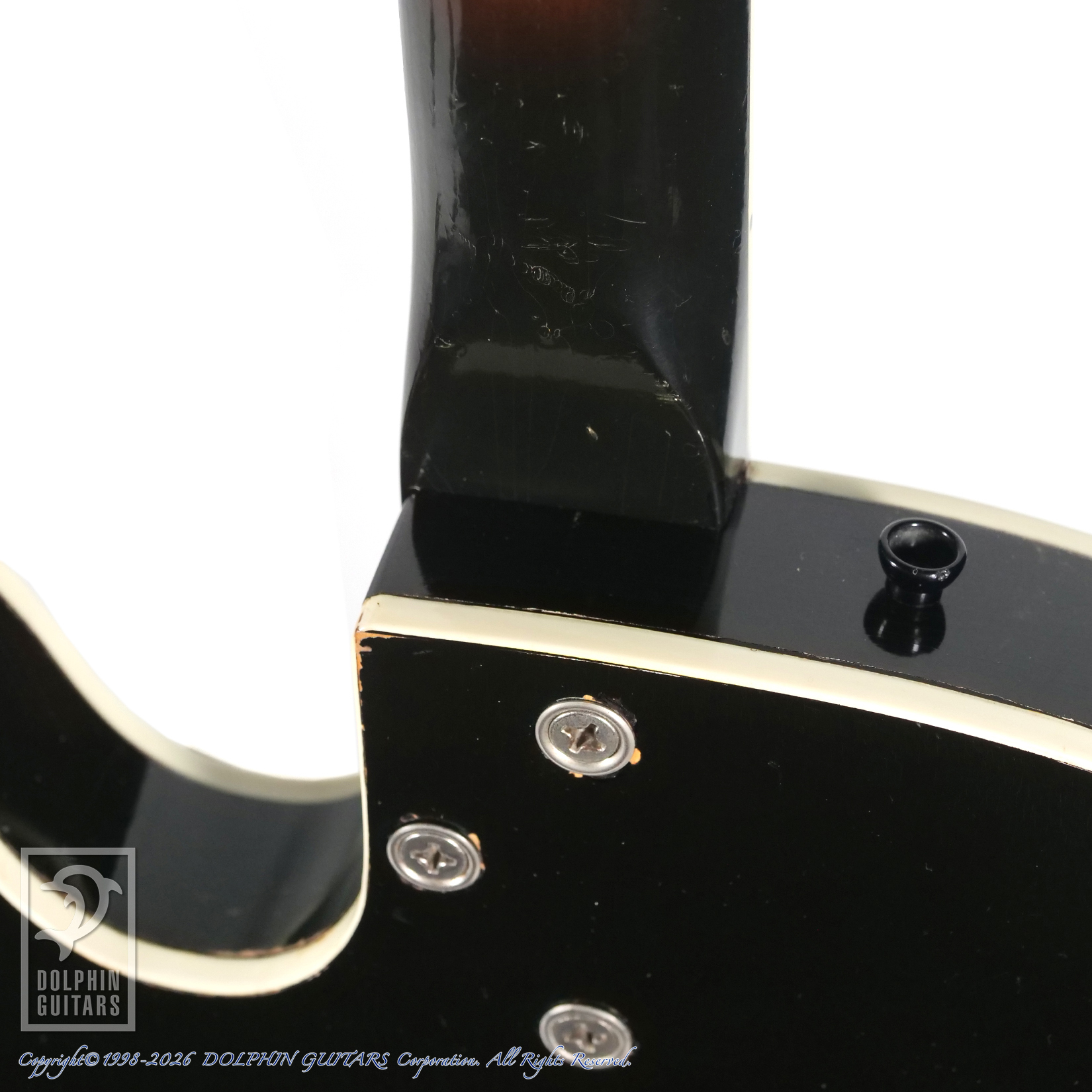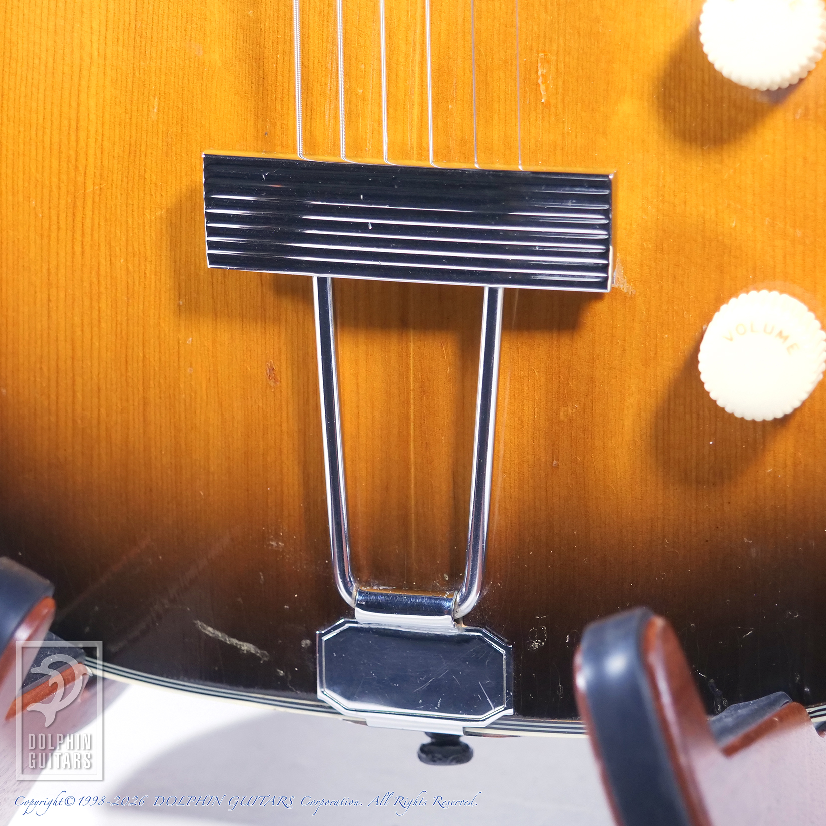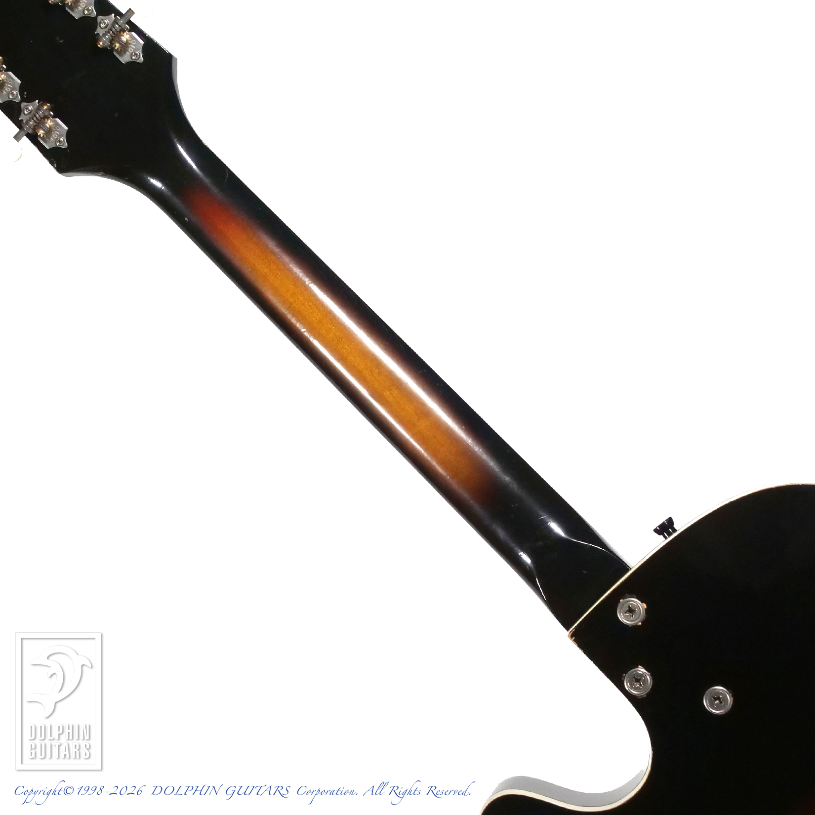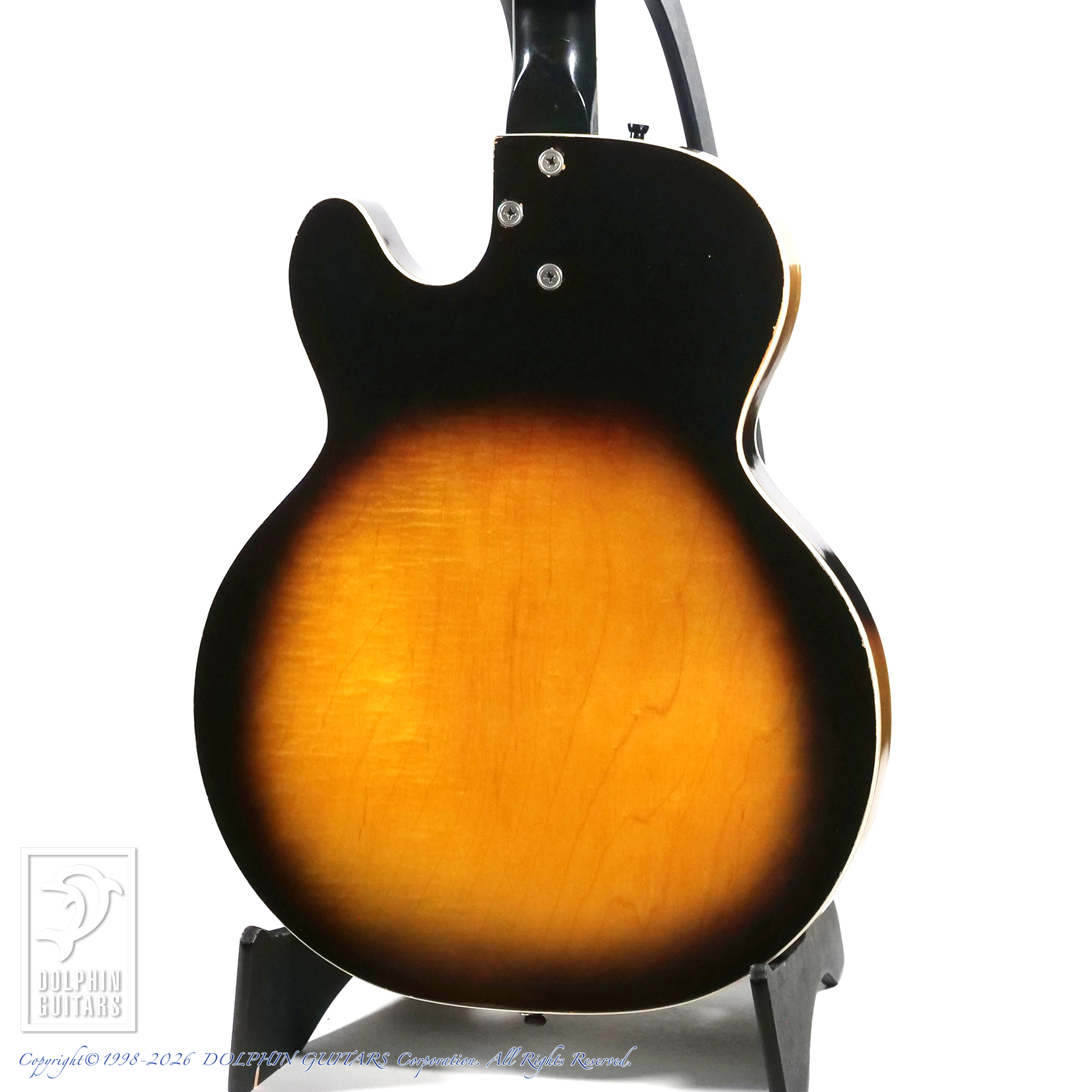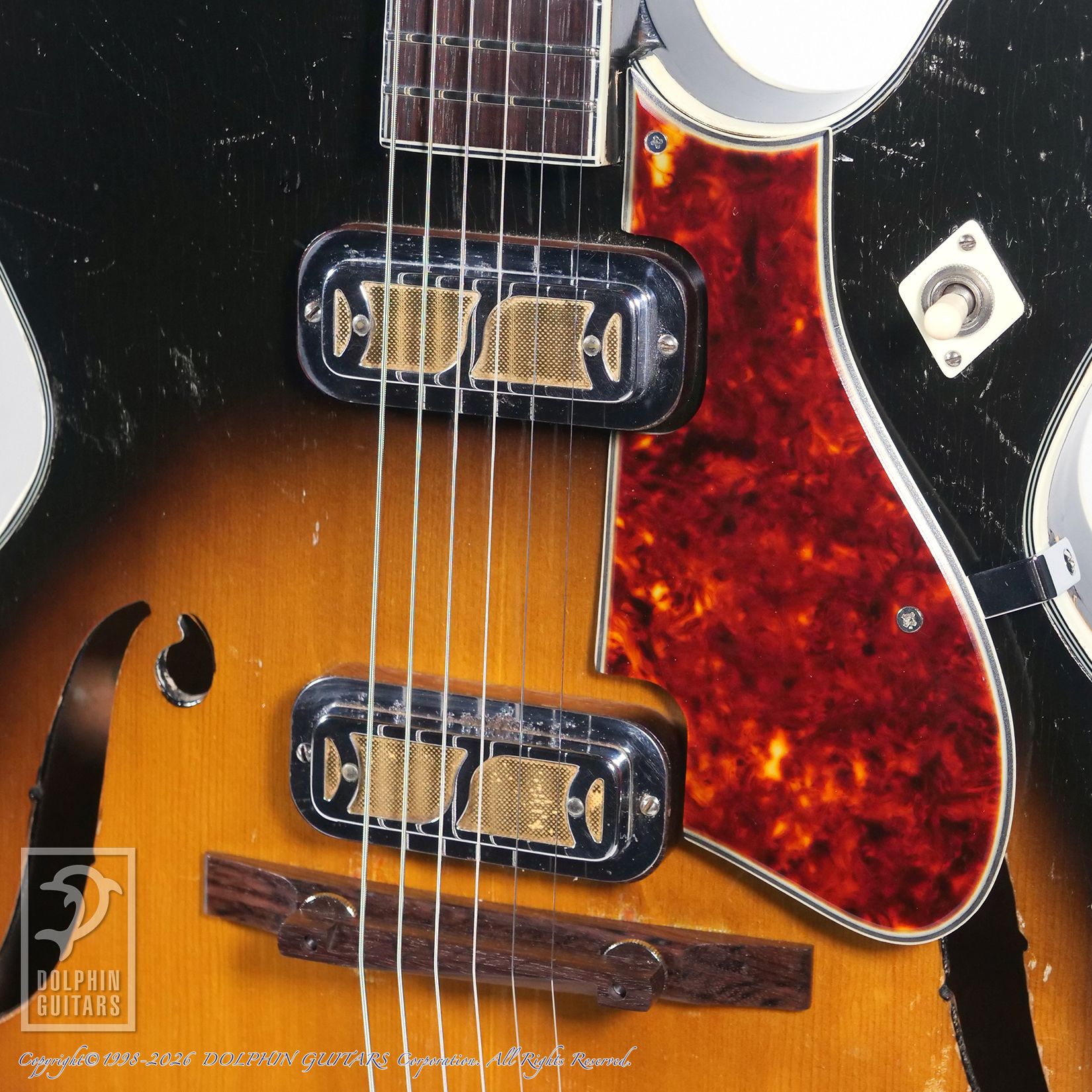 スプルーストップにメイプルサイド&バックを合わせた薄胴ホロウボディは、軽快なレスポンスと乾いた空気感が魅力。サンバーストの渋い佇まいに、ブロックポジション、バインディング、そしてDeArmondゴールドフォイルの存在感が加わり、いかにも60年代アメリカらしいムードを濃厚に漂わせます。丸みのあるシングルカッタウェイもこのモデルならではの愛嬌です。このスタイルでデタッチャブルネックという点もビザール愛好家にはたまらない仕様です。