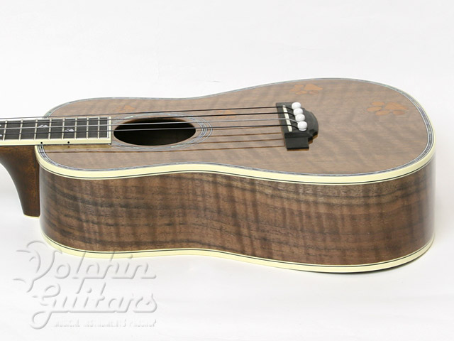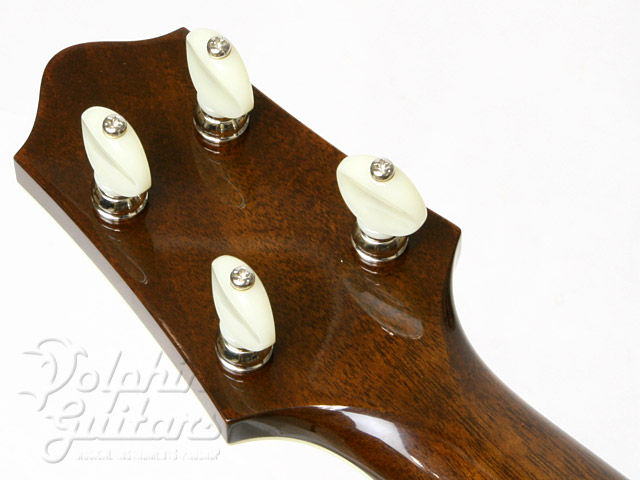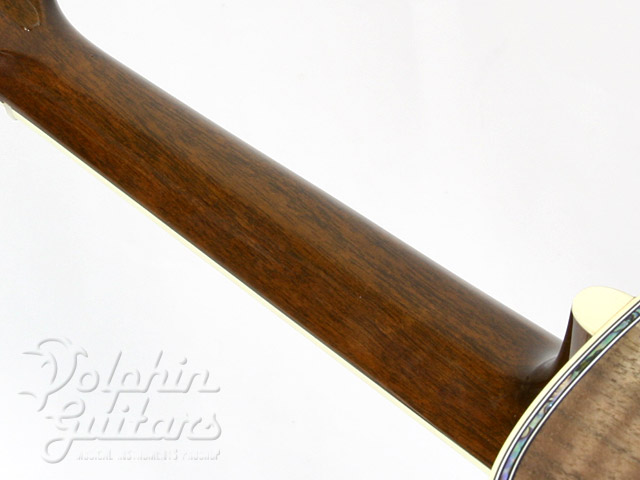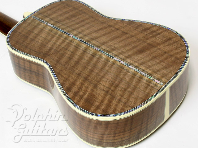 ボディ全面にはやや紫色を帯びた薄褐色の美しいカーリー・ウォルナットを、エボニー指板&駒、アバロン・ボディ・トリム&ロゼッタ・インレイ、14フレット・ジョイント。
